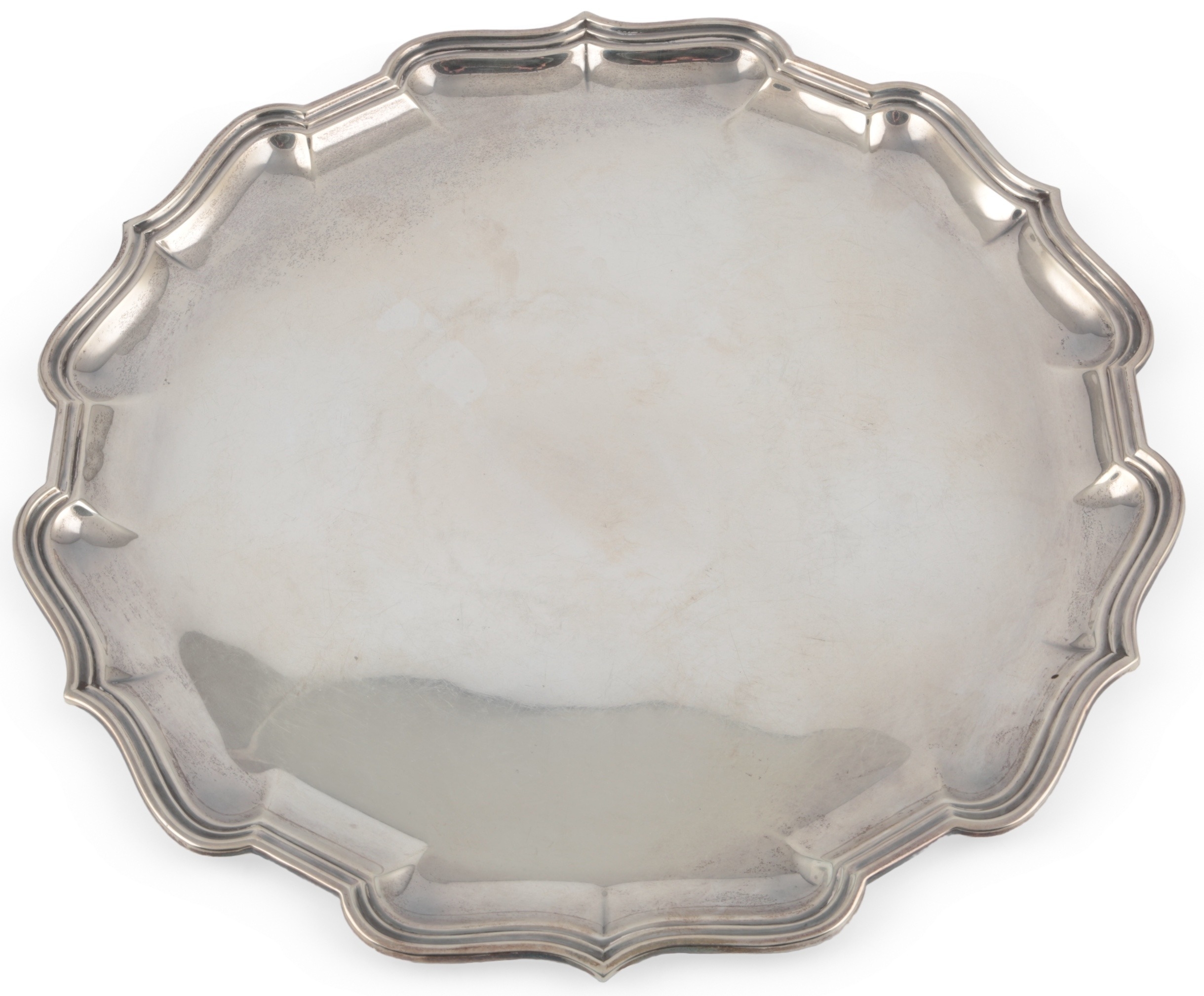 A George V silver salver by Mappin & Webb, of shaped circular form, with pie-crust border, Sheffield, 1923, diameter 36.7cm, 32.9oz.