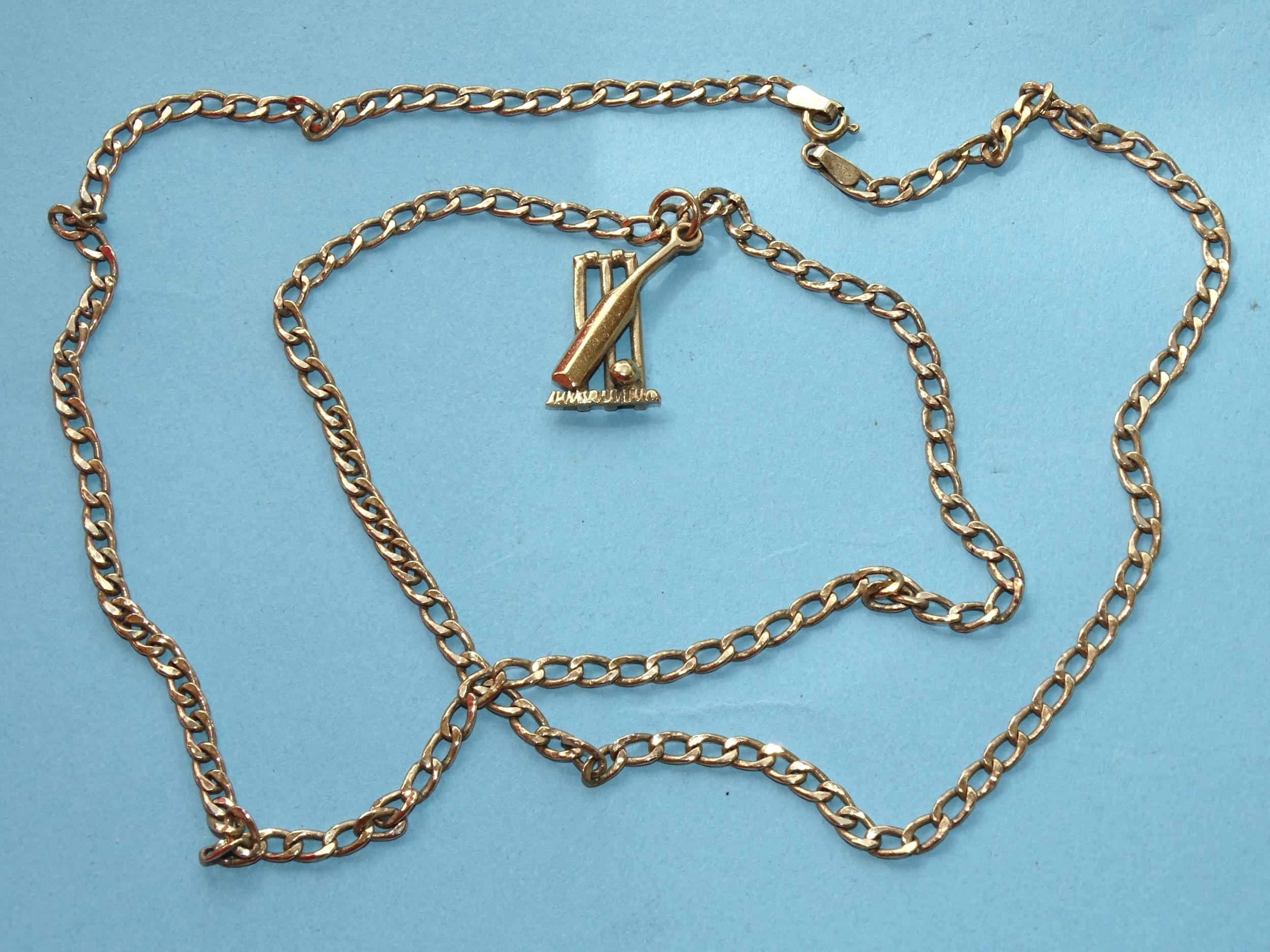 A 9ct gold neck chain with cricket stumps and bat pendant, 65cm, 5.5g.