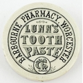 WORCESTER TOOTH PASTE POT LID. 2.5ins diam. Black transfer. BARBOURNE PHARMACY/ LUNNS/ TOOTH/ PASTE. Crisp transfer. Minor nibbles.