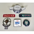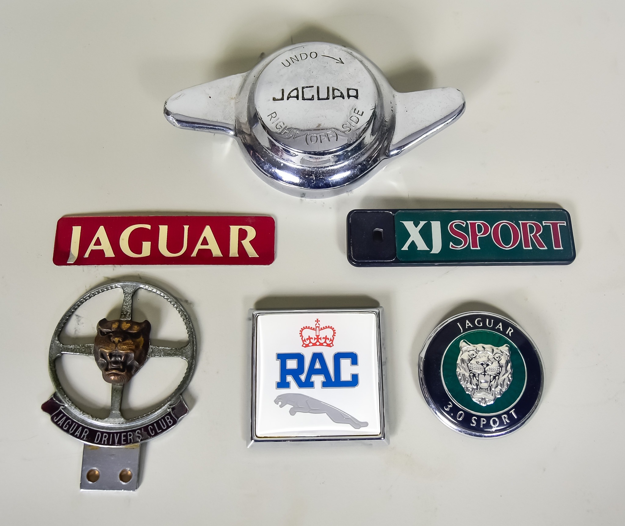 A Small Quantity of Jaguar Badges and Accessories, including - ten boot badges from the XJ series, all with adhesive strips intact, two Jaguar Drivers Club bonnet badges, a Jaguar RAC grill badge, as well as a quantity of petrol caps and other badges (26)