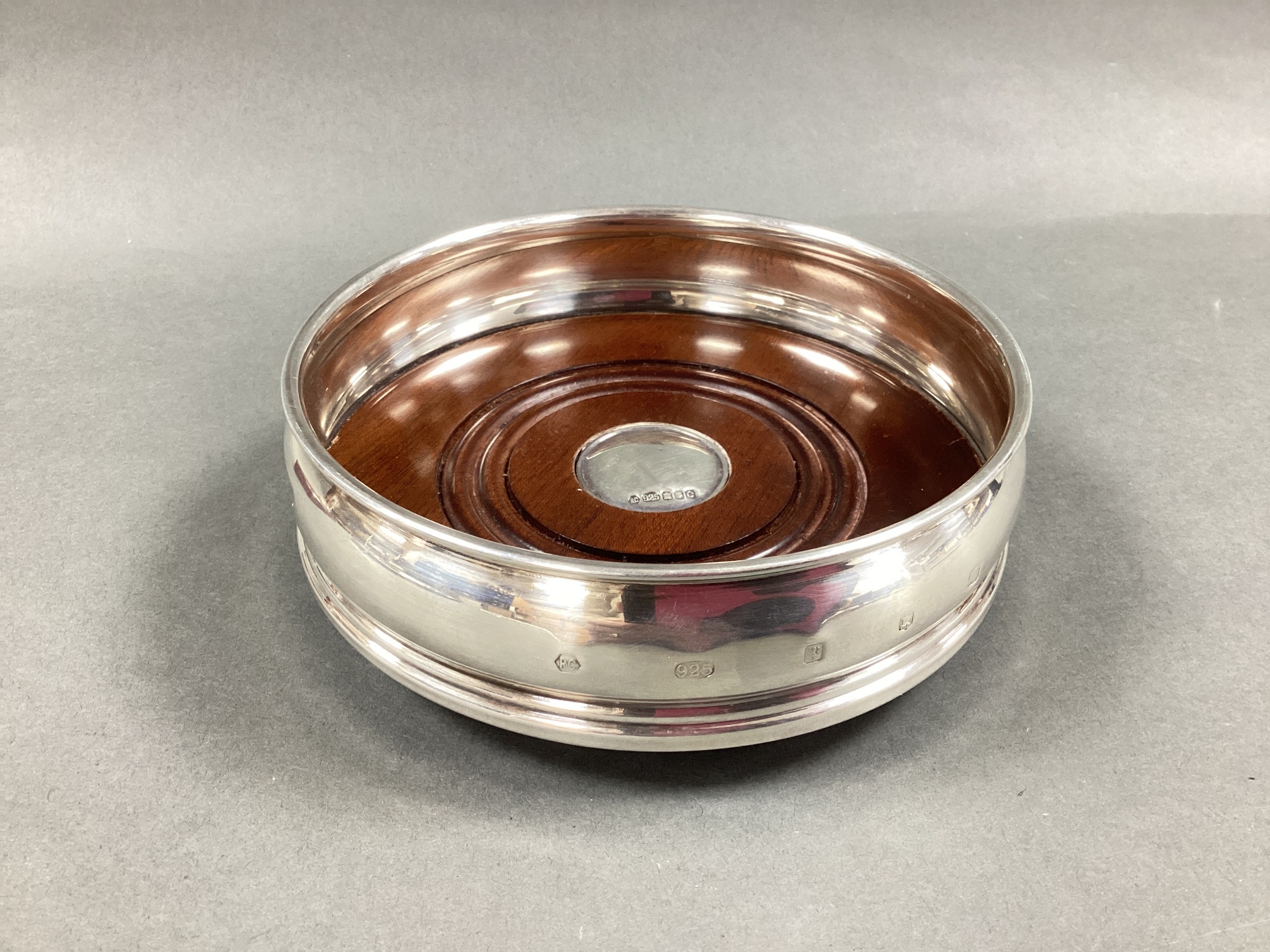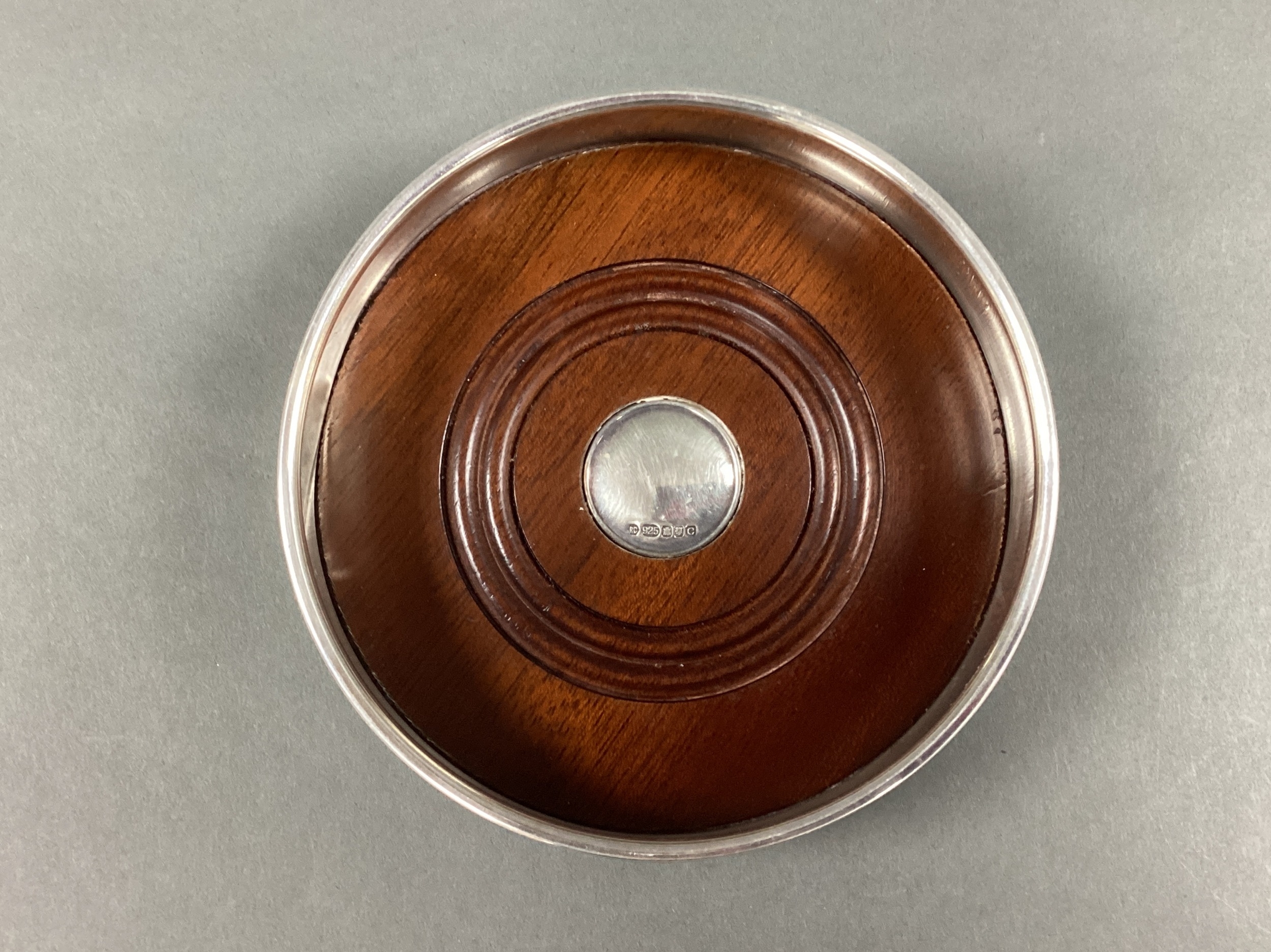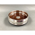 A Modern Scottish Hallmarked Silver Wine Coaster, Carrs, Edinburgh 2002, the turned wood base with inset hallmarked silver disc, rim approximately 12cm diameter (dented).