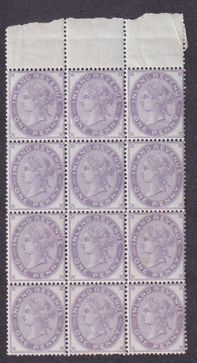 1878 Inland Revenue1d dull purple Die 4 in upper marginal block of 12 u/m (light crease affecting 4).