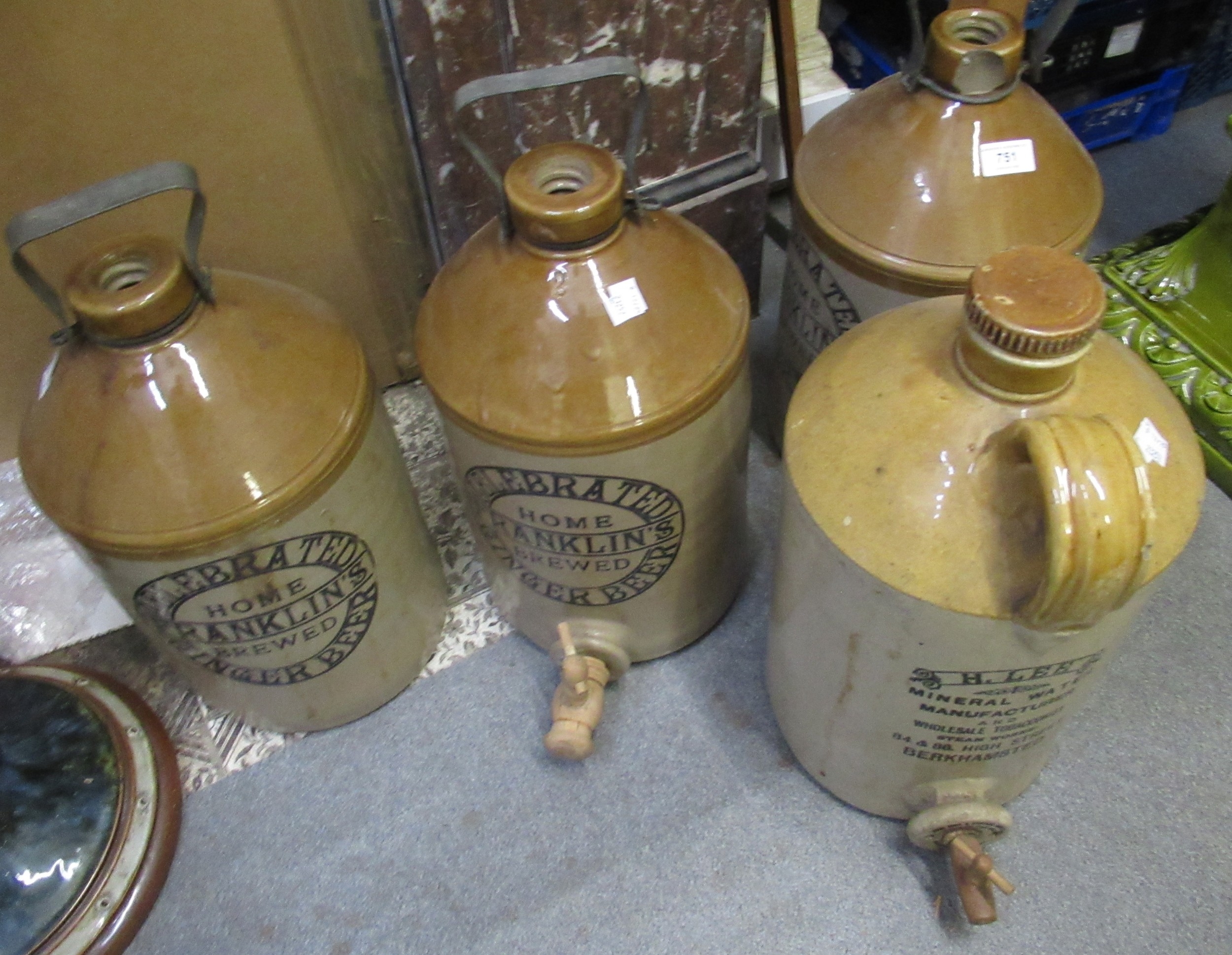 Three stoneware flagons for Franklins ginger beer, 40cm high, together with another H. Lee mineral water manufacturer