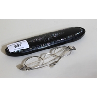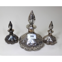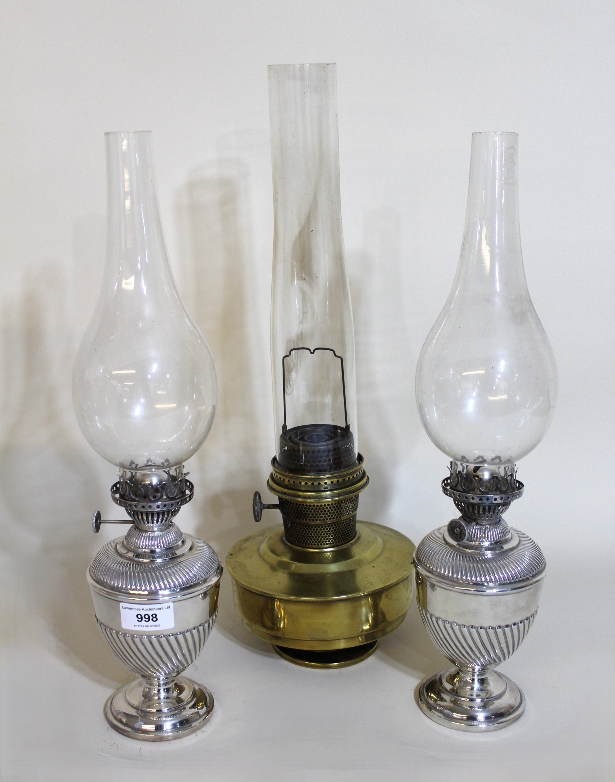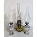 Pair of silver plated oil lamps with glass chimneys, together with a brass oil lamp