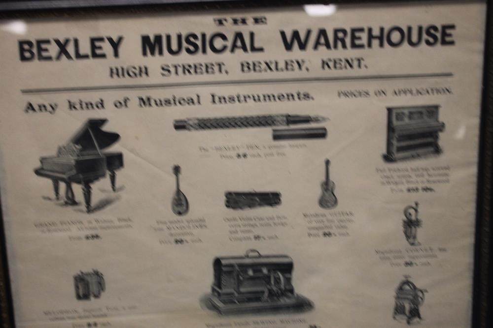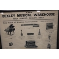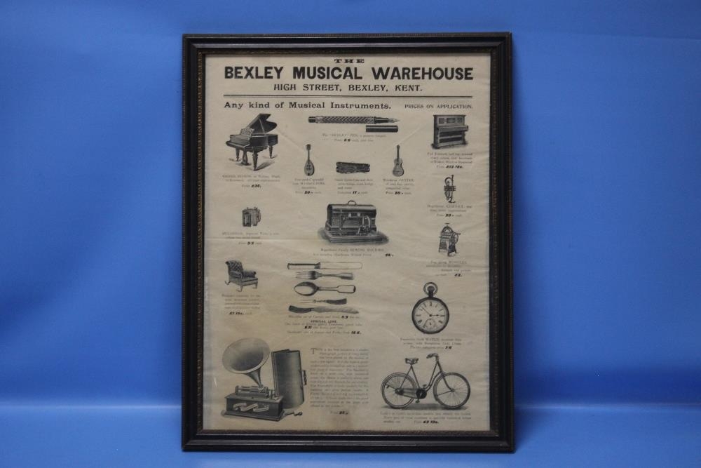 A LATE VICTORIAN FRAMED 'BEXLEY MUSICAL WAREHOUSE' ADVERTISING SIGN, 44 x 55 cm (including frame)