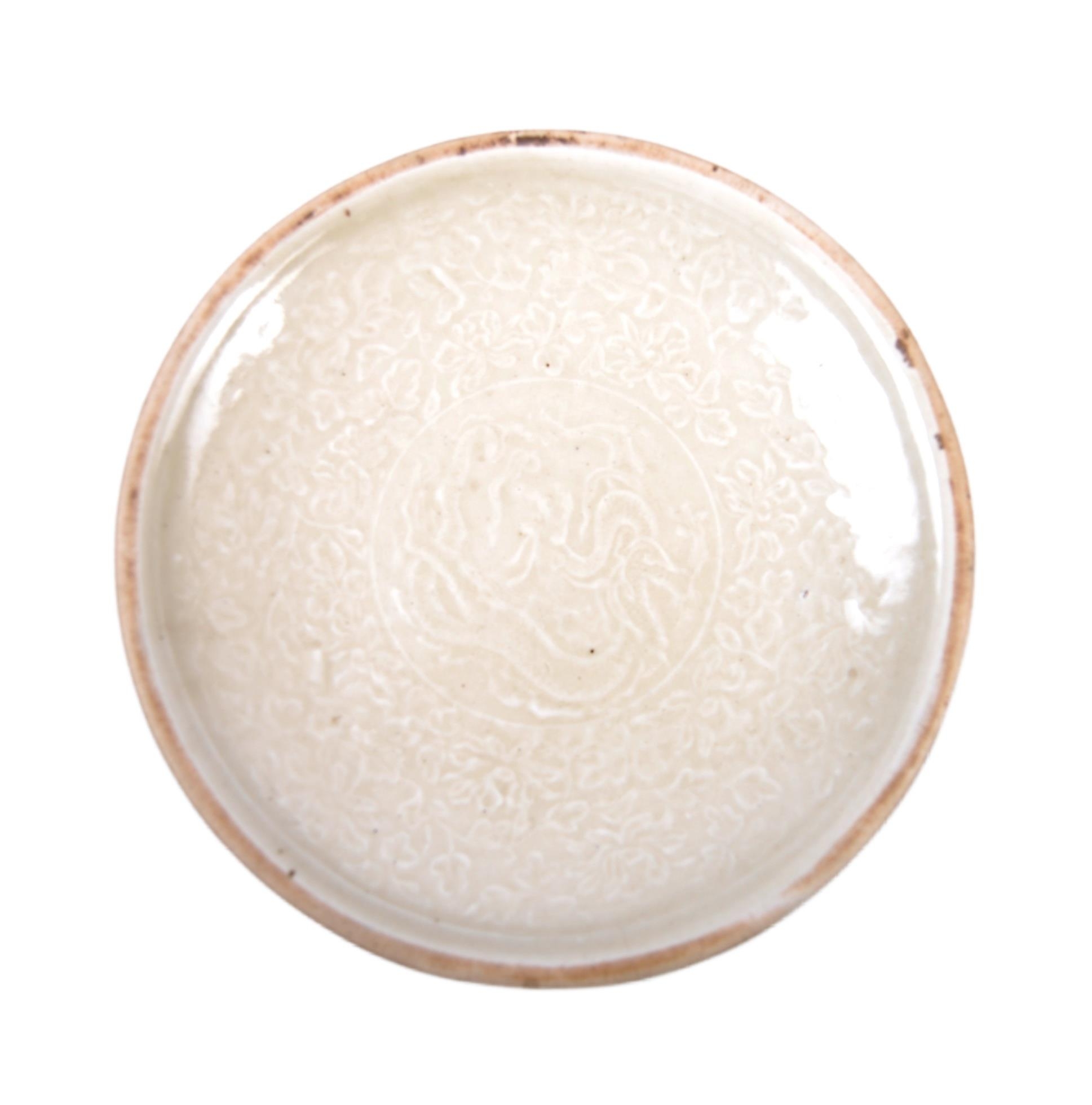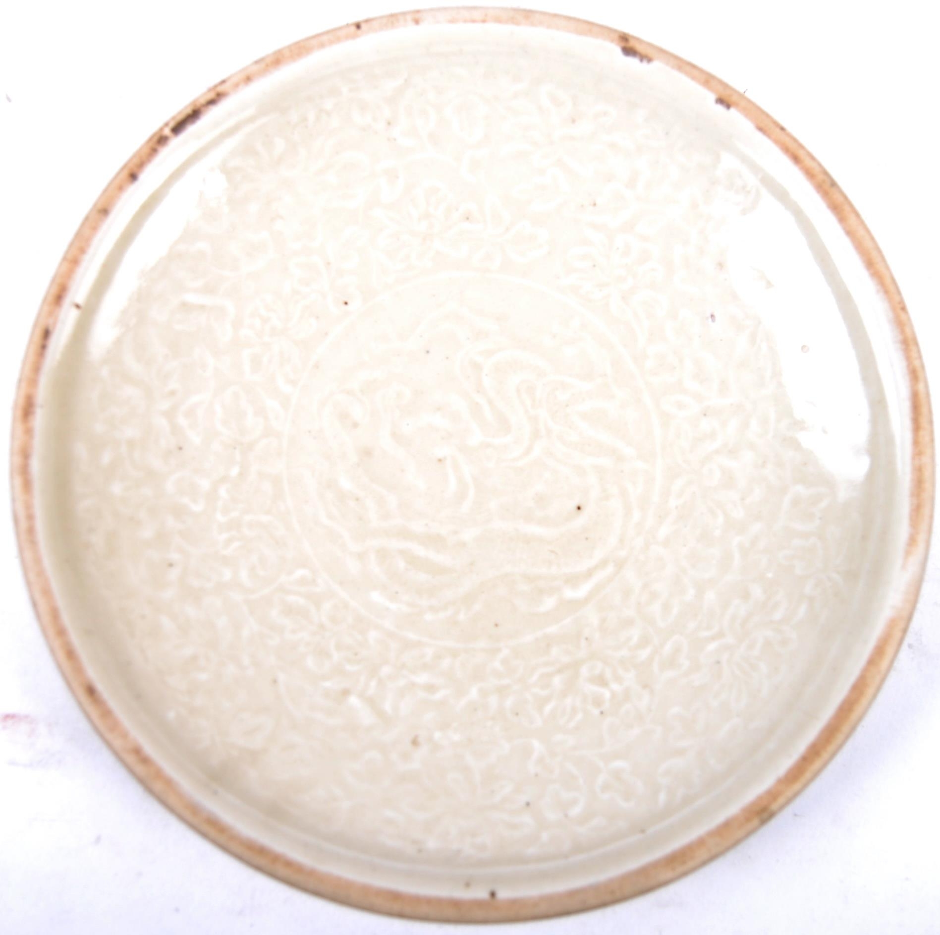 A Chinese Song Dynasty (believed) porcelain plate of circular form having a central depiction of a Dragon with foliate border likely decorating the edges. Measures approx; 20cm wide.