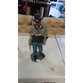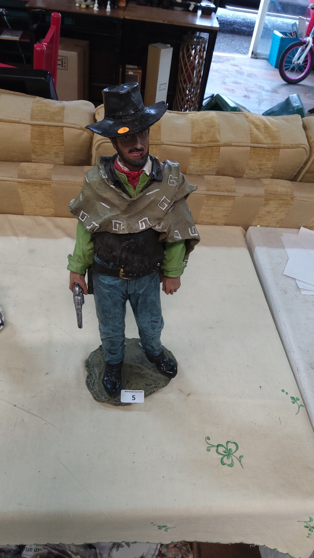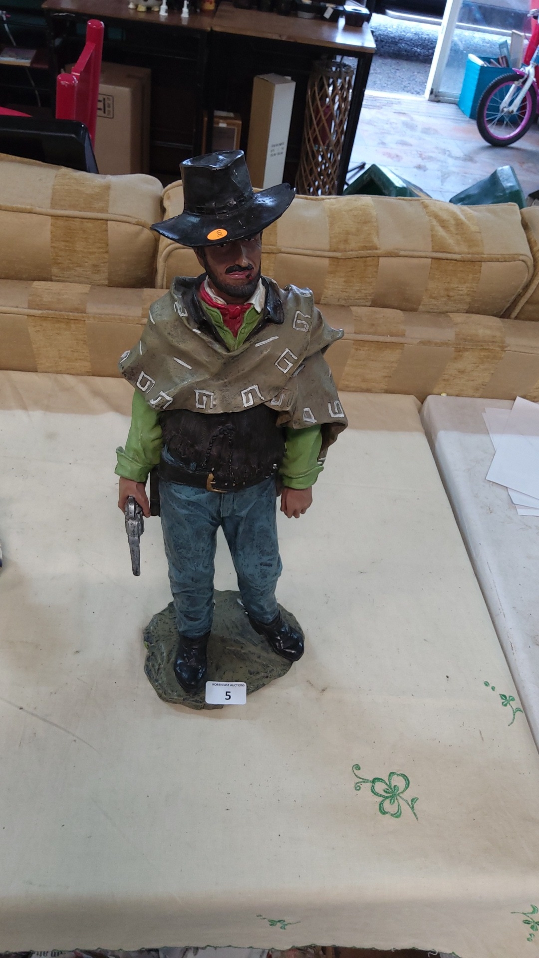 Painted resin figure of poncho-clad cowboy with revolver and black hat, standing on rocky base, late 20th century.