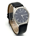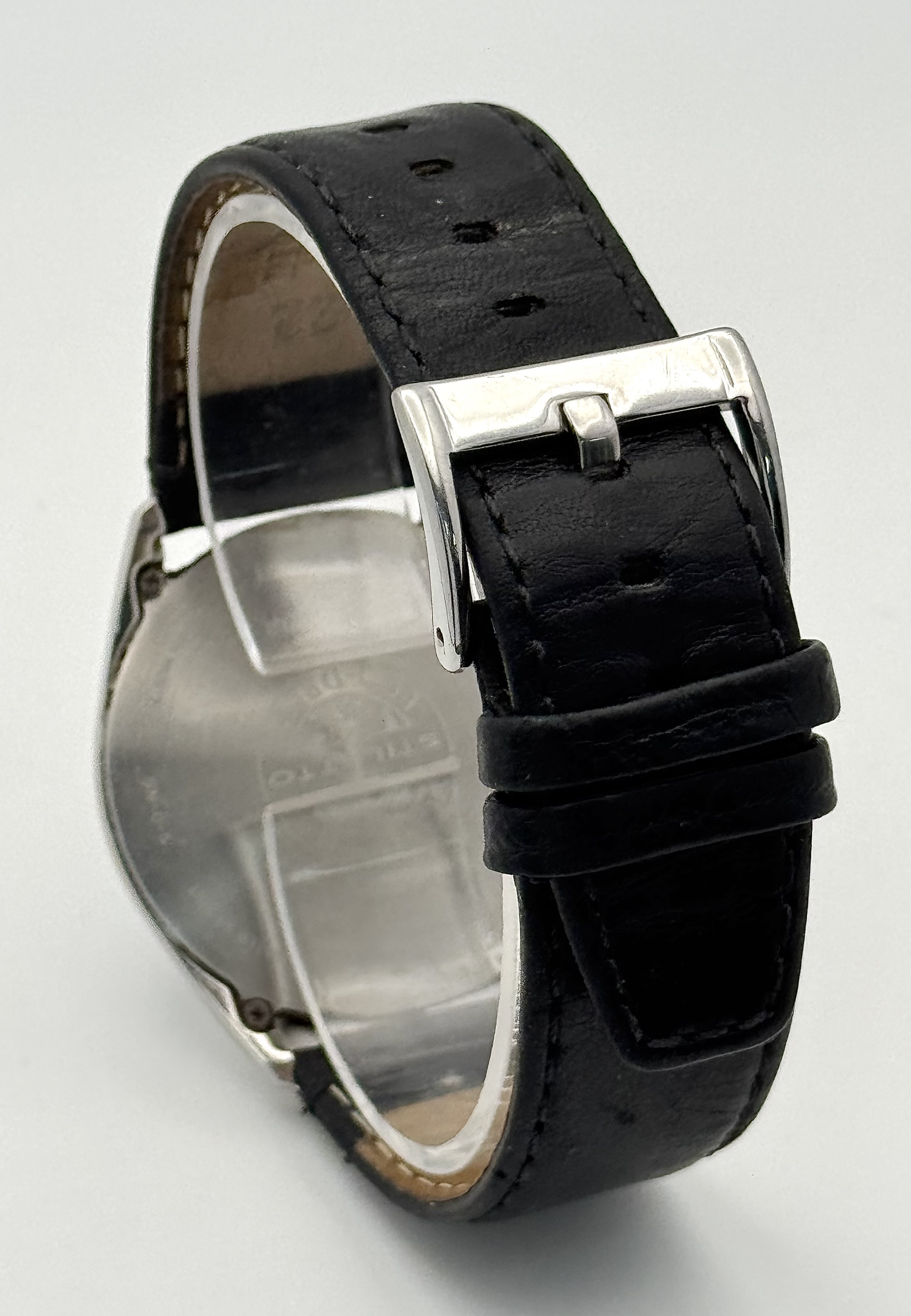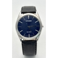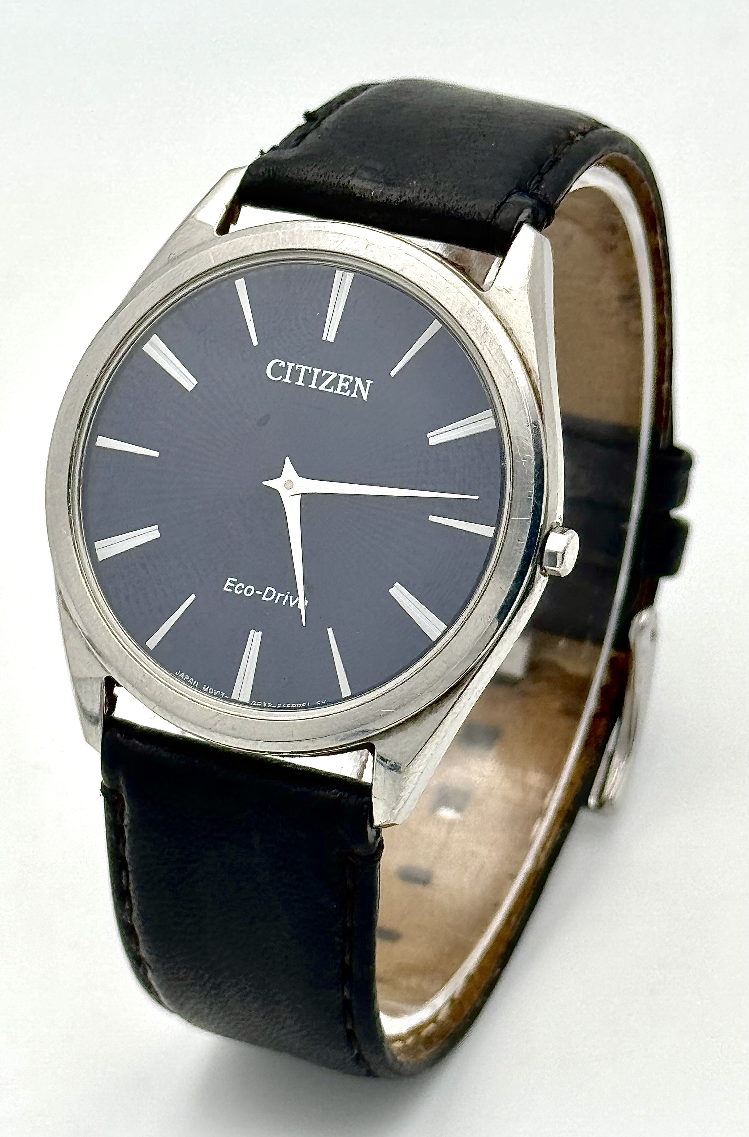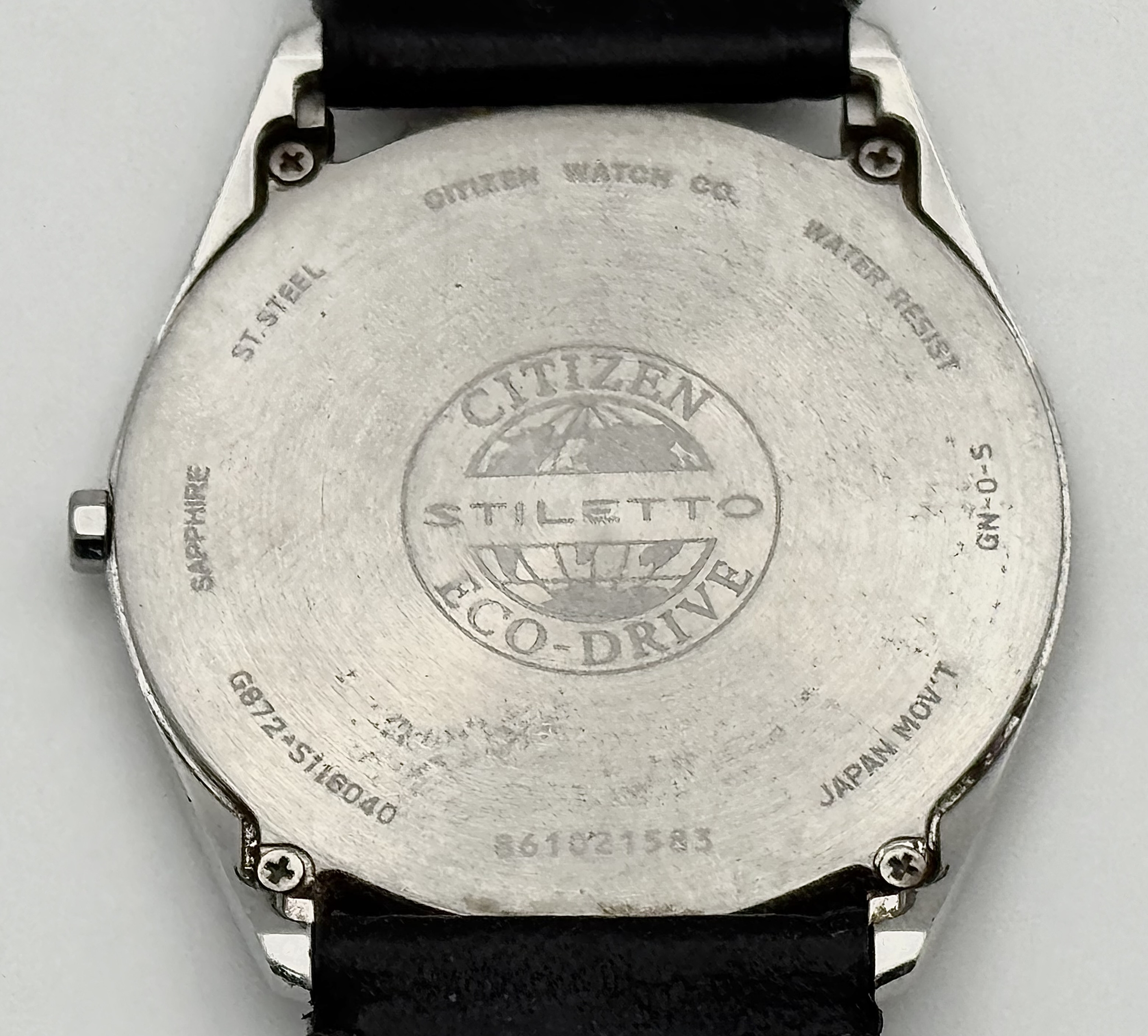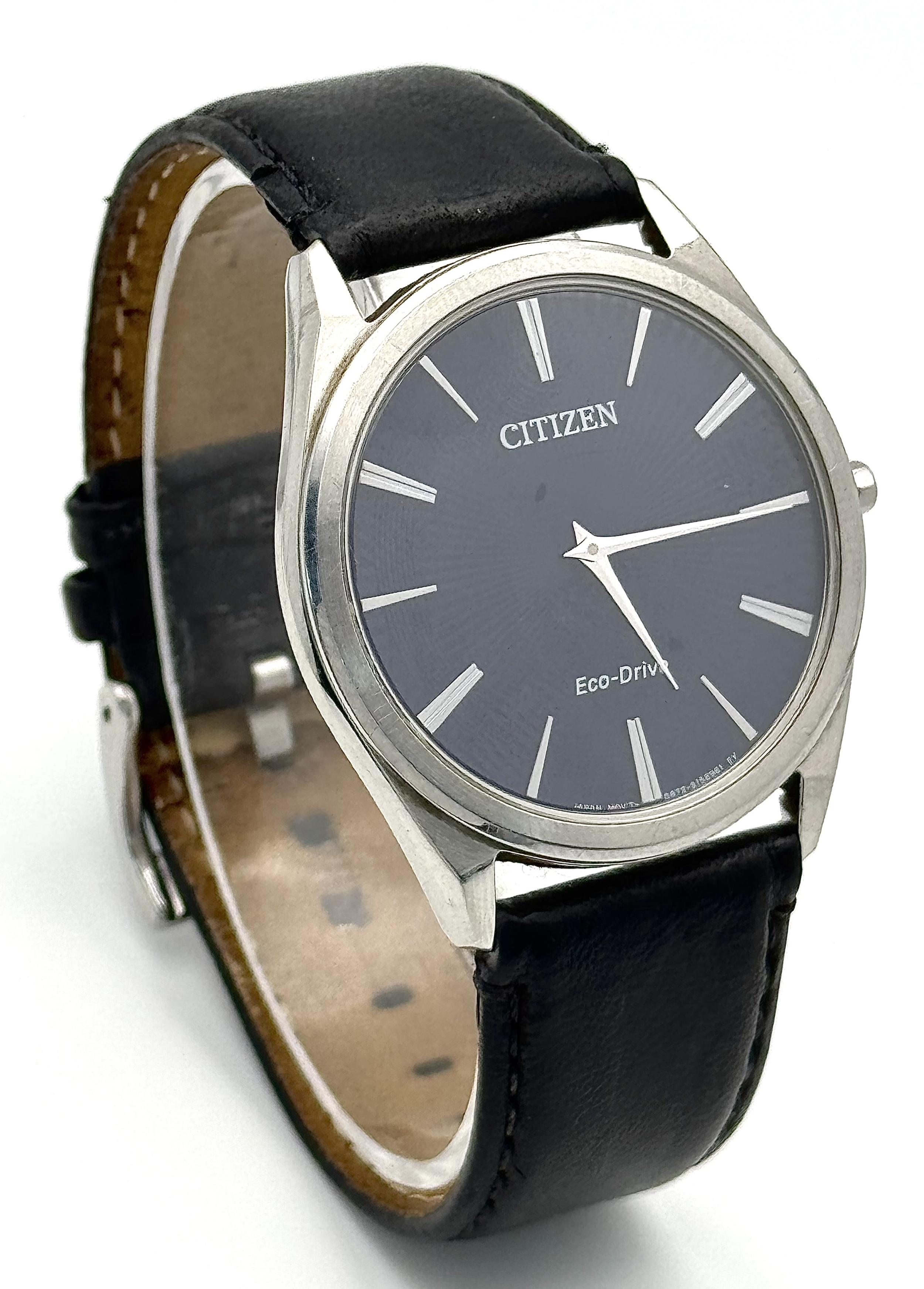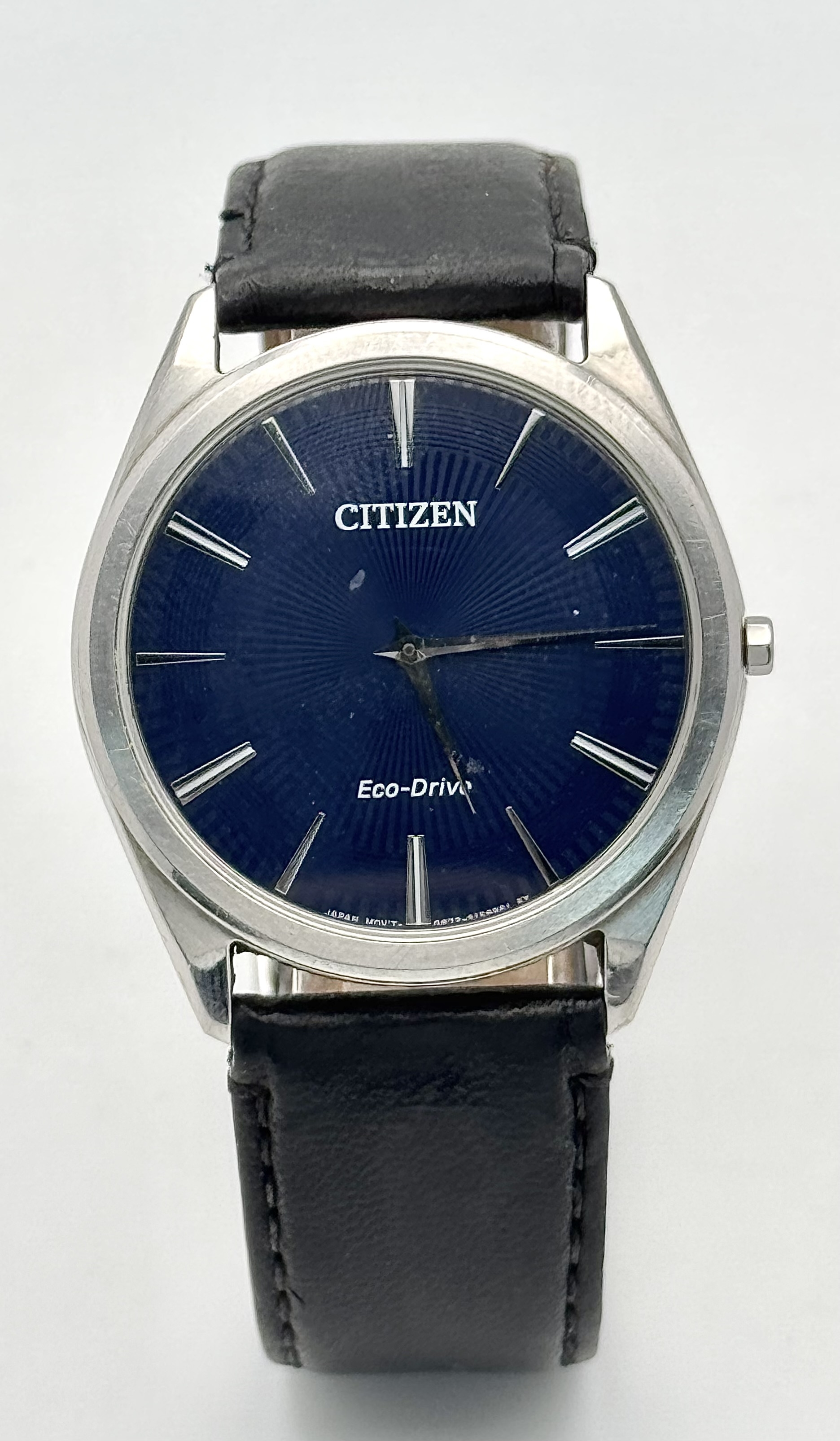 A CITIZEN, ECO DRIVE, BLACK LEATHER STRAP WATCH. IN FULL WORKING ORDER. S/A 1602 - 4