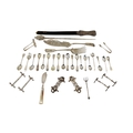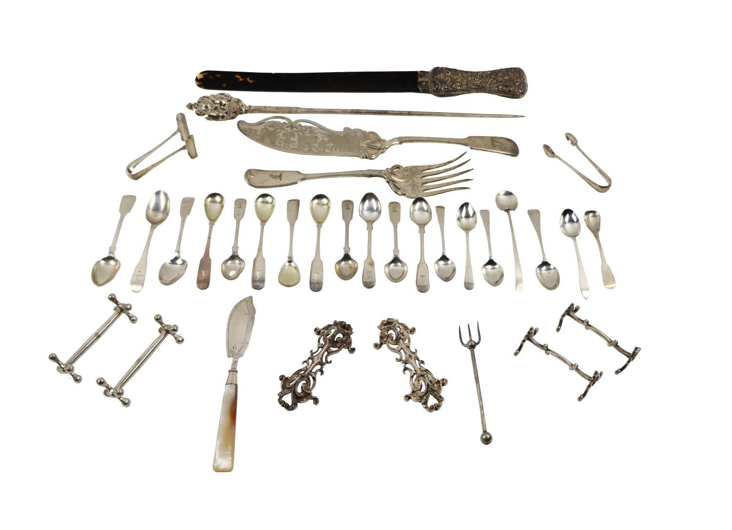 A collection of crested Irish & English silver Tea or Caddy Spoons, hallmarked Dublin & London, and two silver Sugar Tongs, approx. 10 ounces; a Georgian mother-o-pearl handled etched design silver Butter Knife (marks worn); three pairs of silver plated Victorian Carver Rests; a Victorian silver plated pair of etched design and crested Fish Servers, a decorative pierced design handled Meat Skewer, and a silver handled Letter Opener, as a lot. (1)