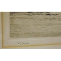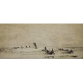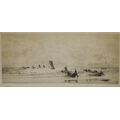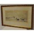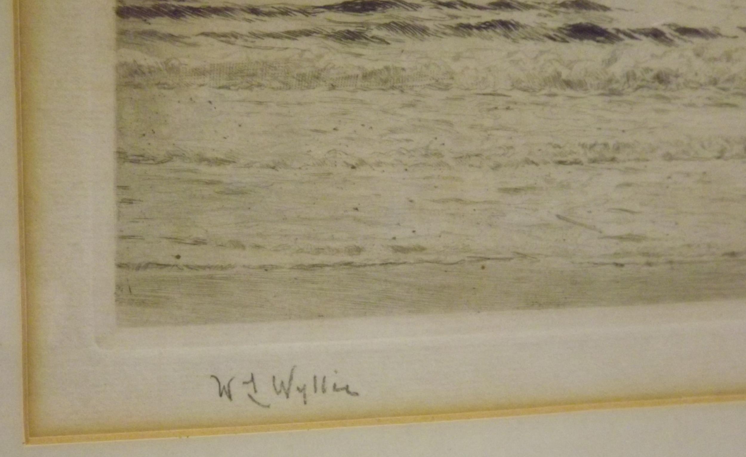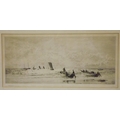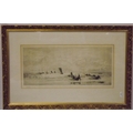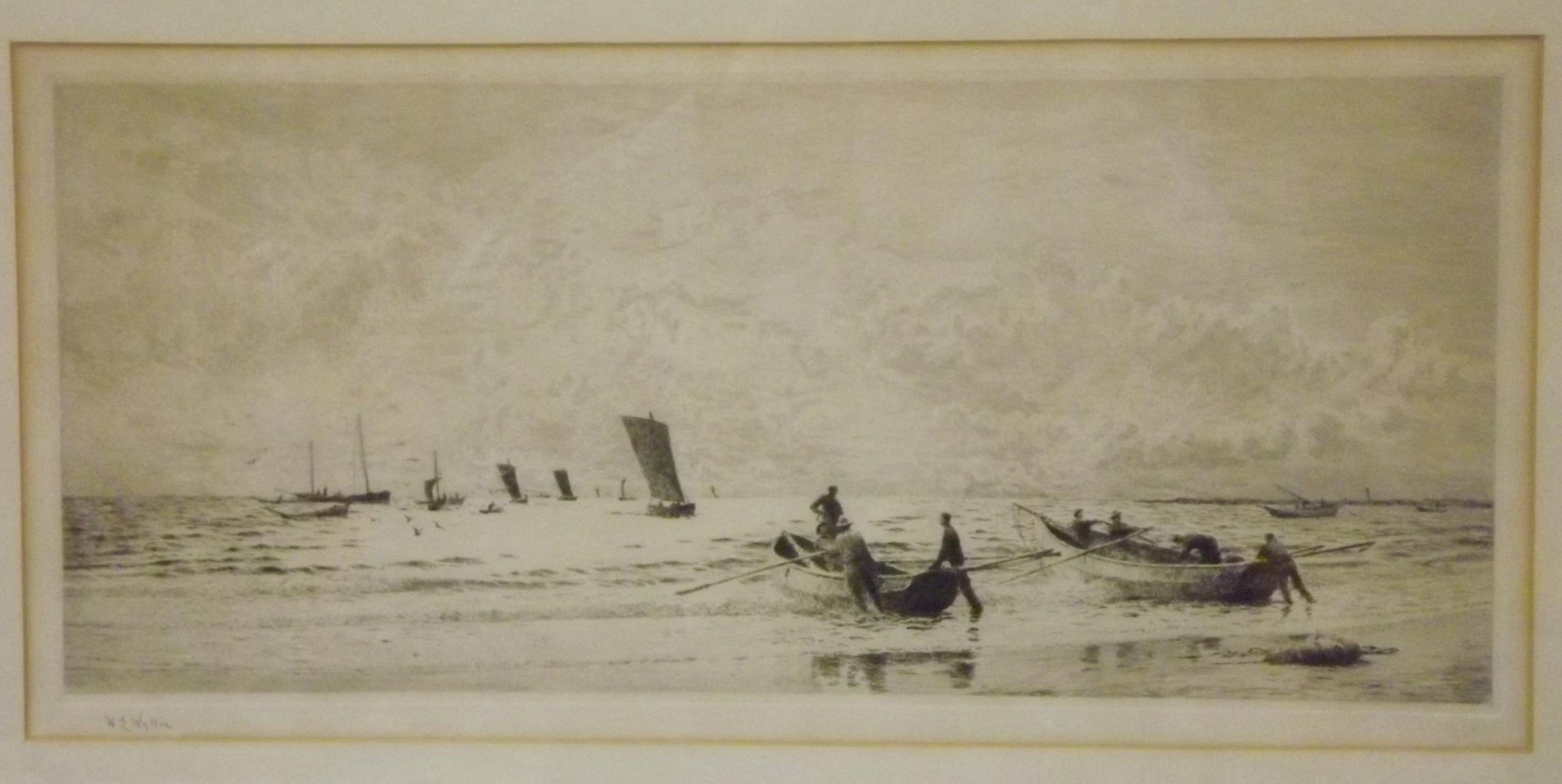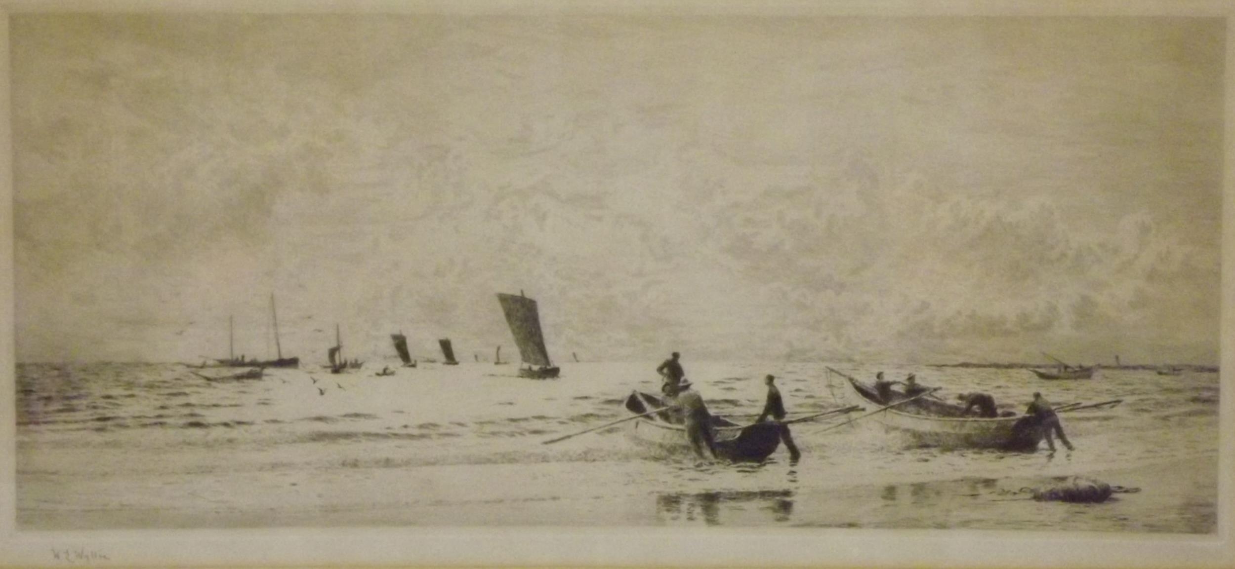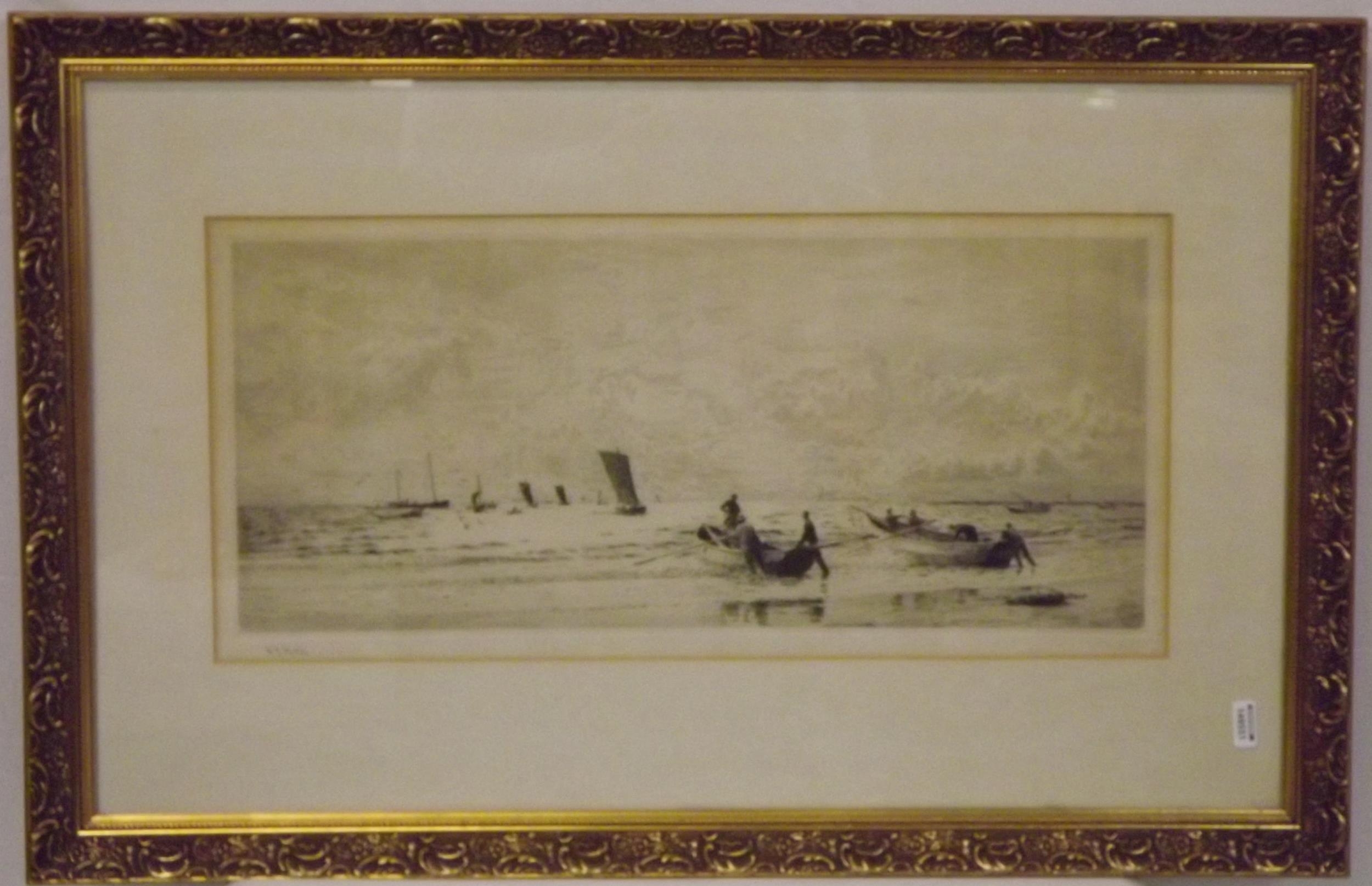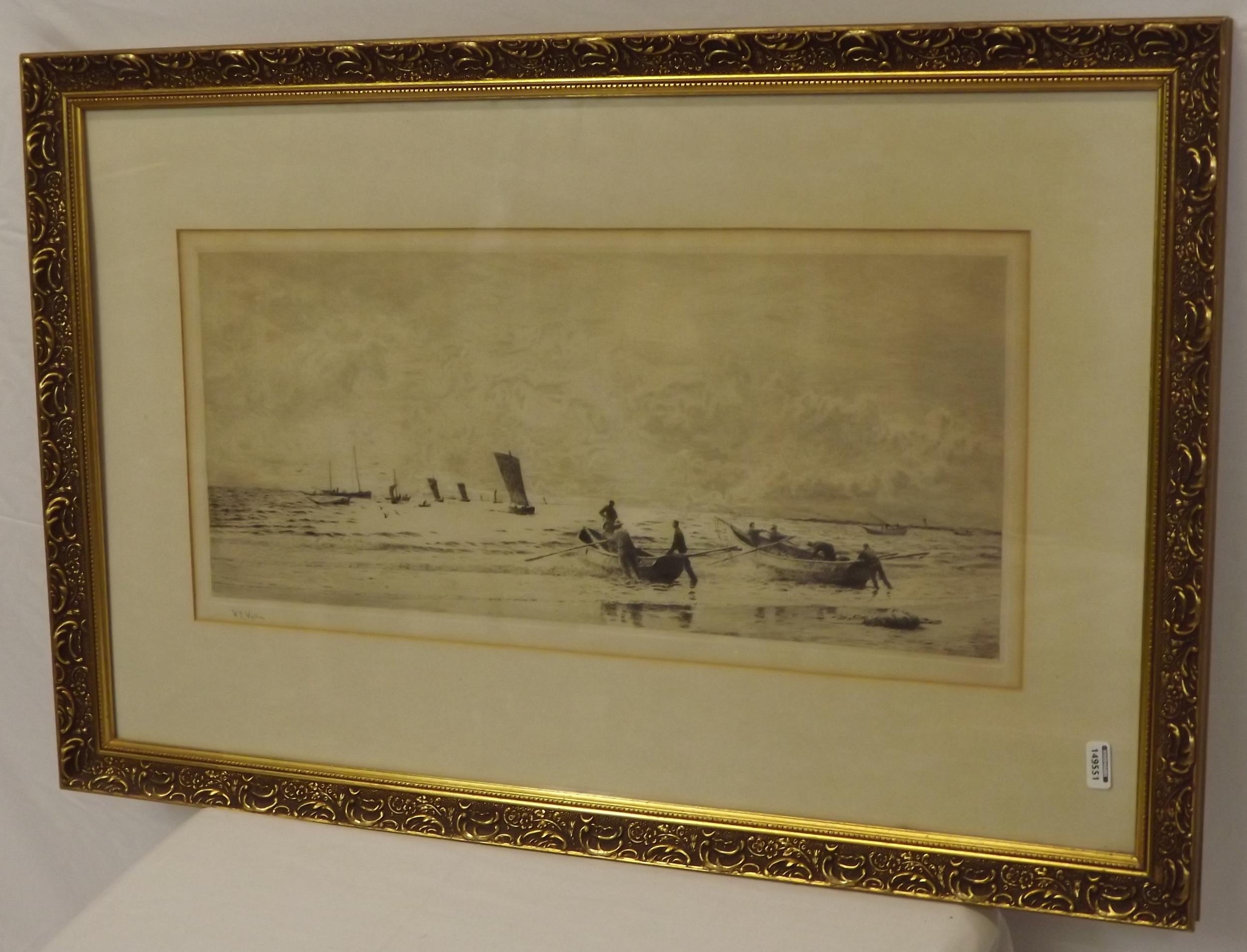 W L Wyllie 'Launching the boats' etching 20x48cm signed