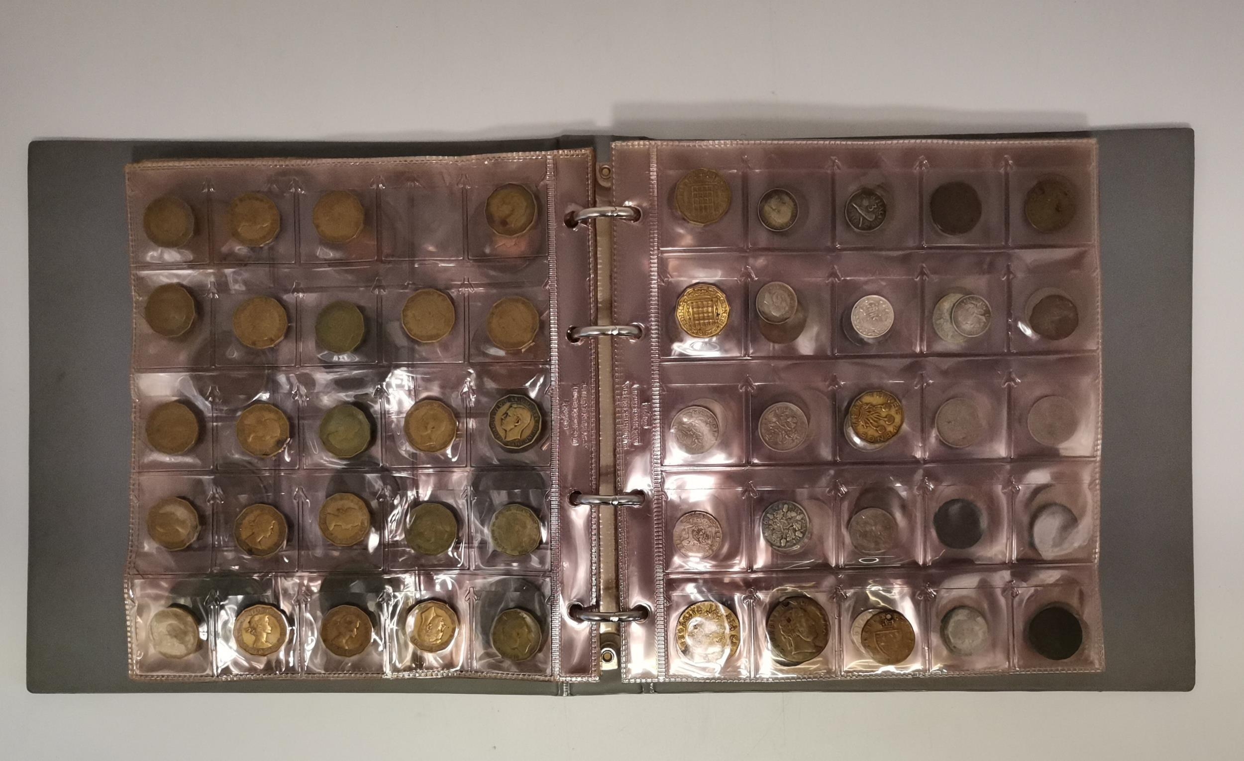 An extensive album of assorted coins and tokens, British and foreign, 17th Century and later, including copper, crowns, half crowns, shillings, some pre-1947 silver; a Scottish Charles II bawbee coin, 1677, with crossed swords and thistle; George III cartwheel penny 1797; George III halfpenny 1799; George III spade guinea and half guinea style gaming tokens, 'IN MEMORY OF THE GOOD OLD DAYS'; etc. (Qty - one album)