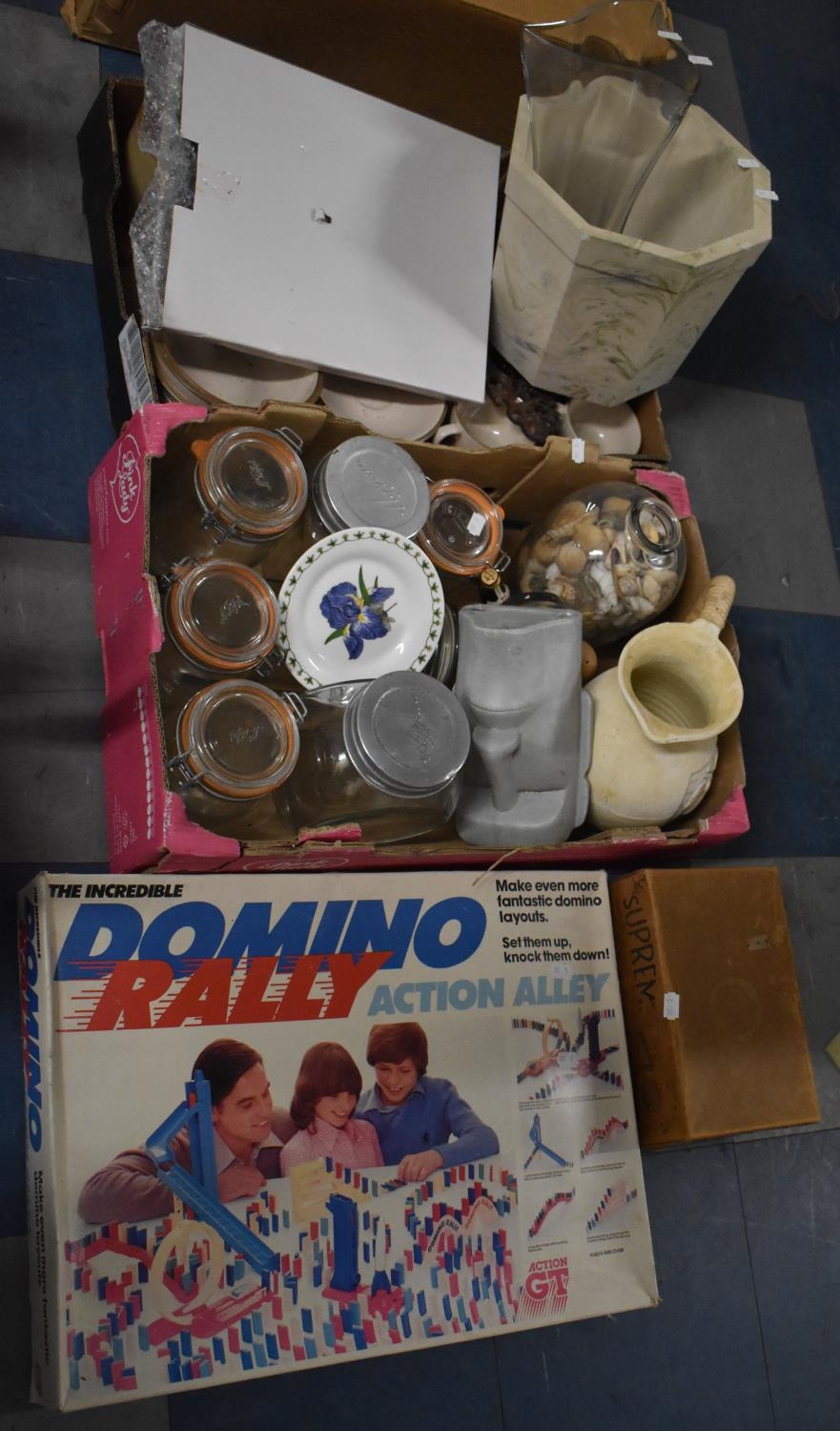 A Collection of Items to include Domino Rally Kit, Supreme Hair Dryer, Various Glass Jars, Ornaments, Vases, Marble Effect Planter Etc