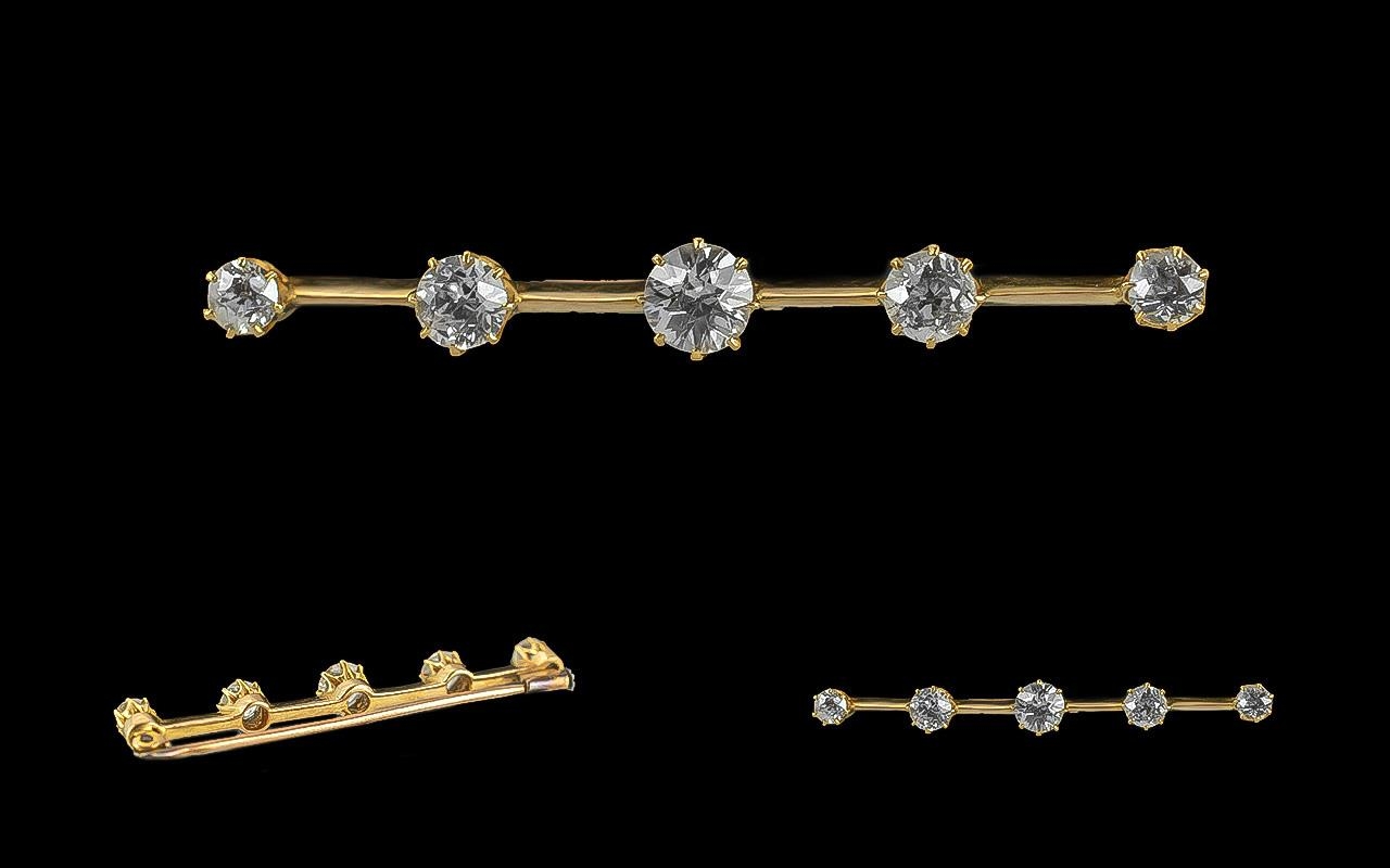 Ladies 1920's Excellent Quality 18ct Gold 5 Stone Diamond Set Bar Brooch, Not Marked but Tests High Ct Gold. The Five Old Brilliant Cut Diamonds of Excellent Colour / Clarity, Est Colour G - H, Est Clarity VSI, Est Diamond Weight 1.40 cts, 10 - 35 - 50 - 35 - 10. Weight 4 grams.