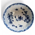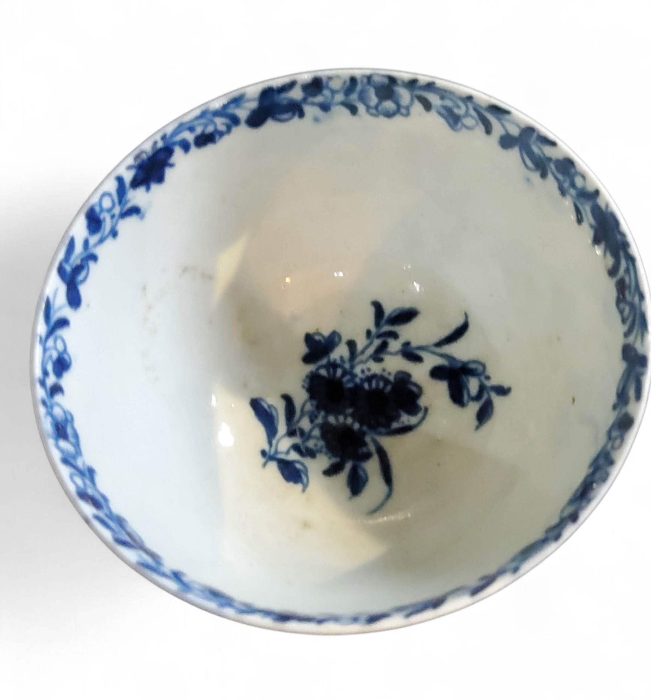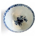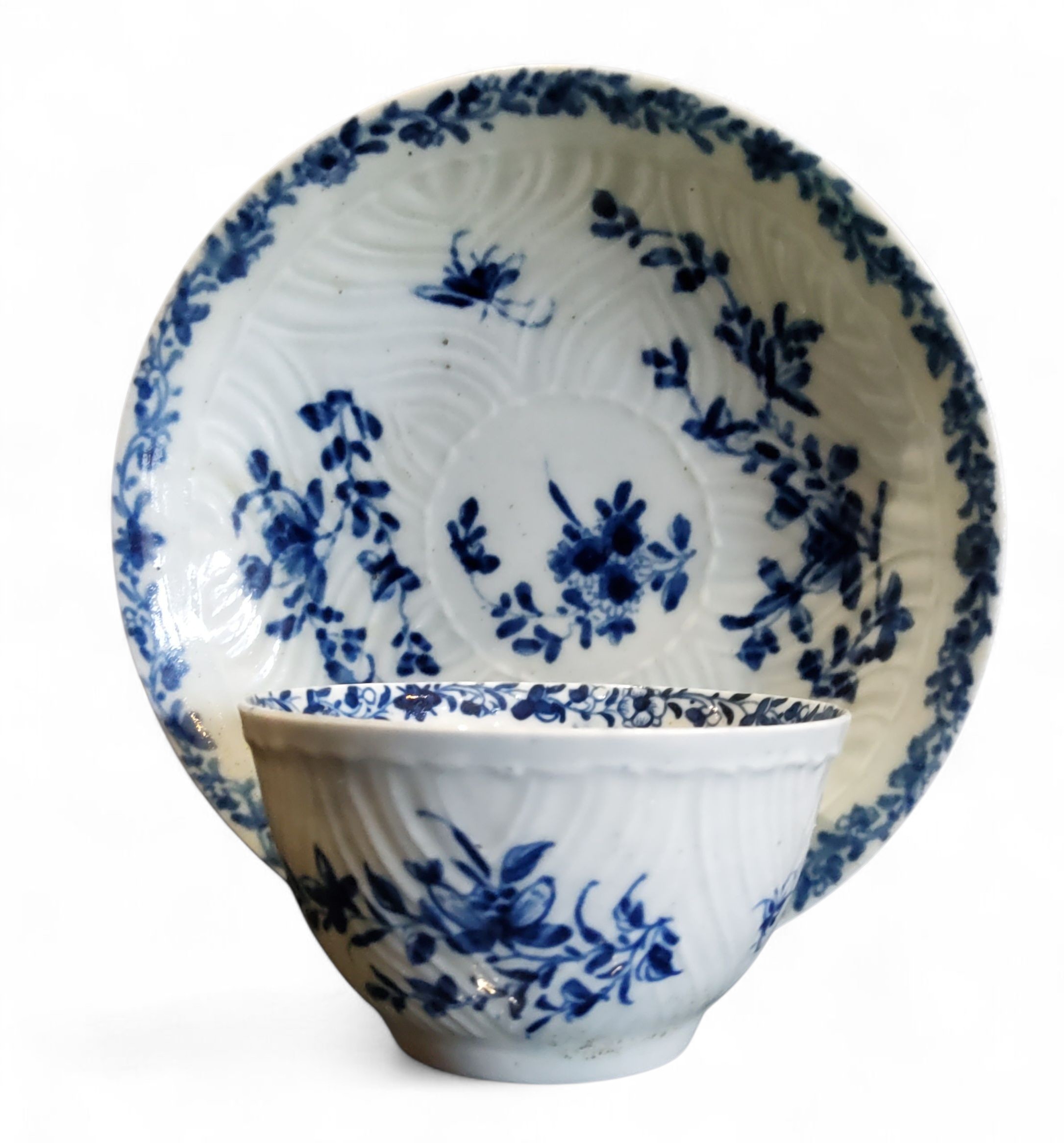 A Worcester Feather Moulded Floral pattern tea bowl and saucer, painted in cobalt blue with trailing foliage and insects, banded floral scroll border, workman's mark, c.1757