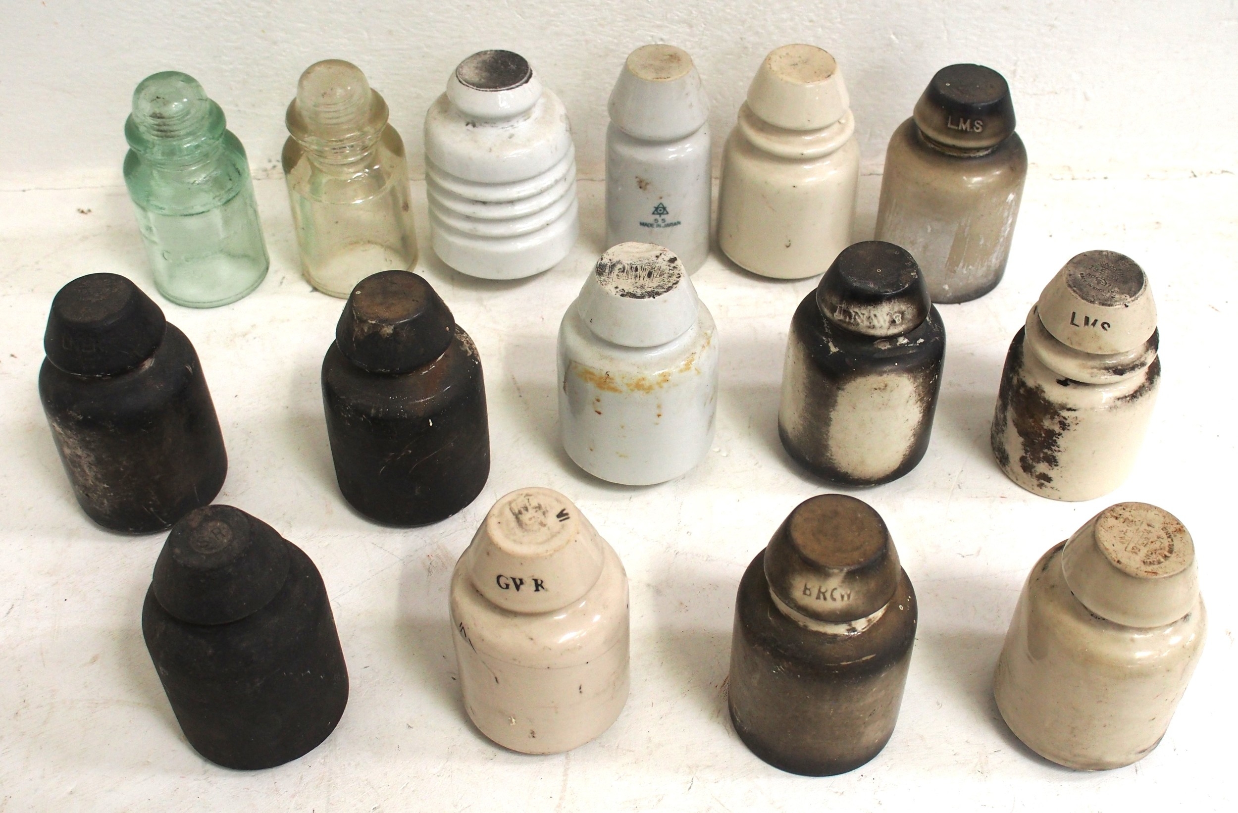Box of telegraph insulators - LNWR, LMS, GWR, LNER, BR(W), SR, glass, Japanese, plus a 3rd rail pot from Strawberry Hill. (B4X) (Dispatch by Mailboxes/Collect from Banbury Depot)
