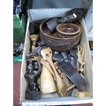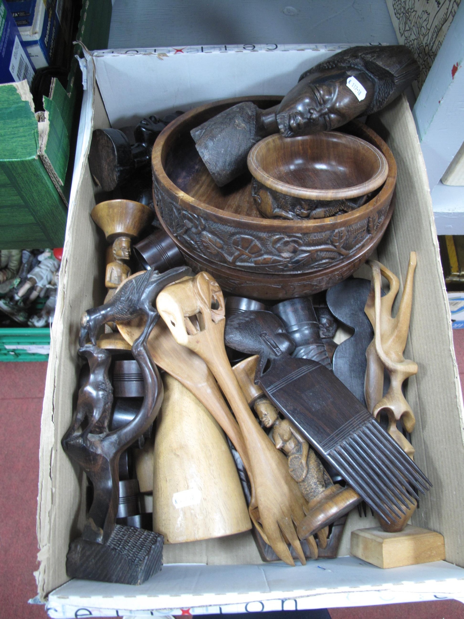 African wooden tribal art collection, including hardwood carved bowls, human figures and animal sculptures, combs and wall plaque, pepper grinder and napkin rings etc. One box. [680106]