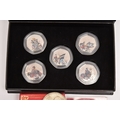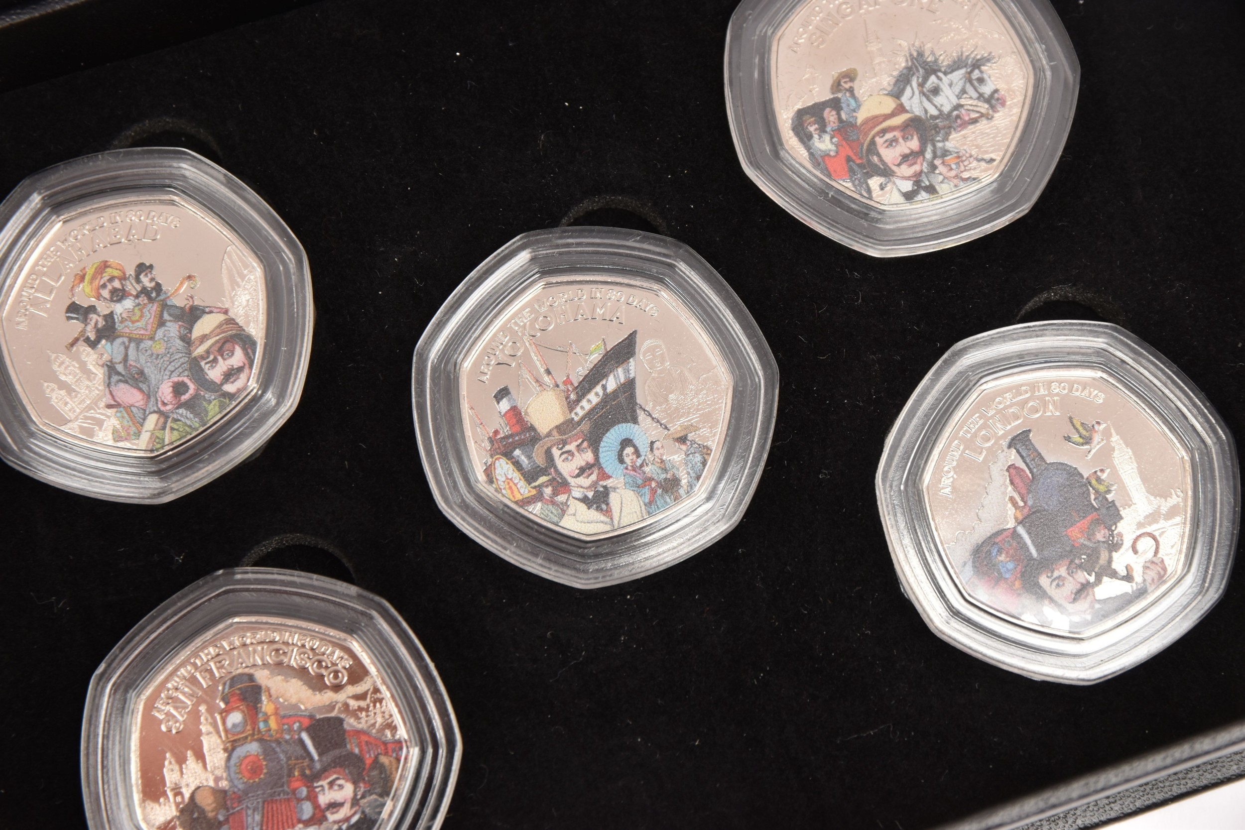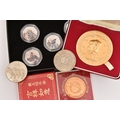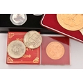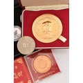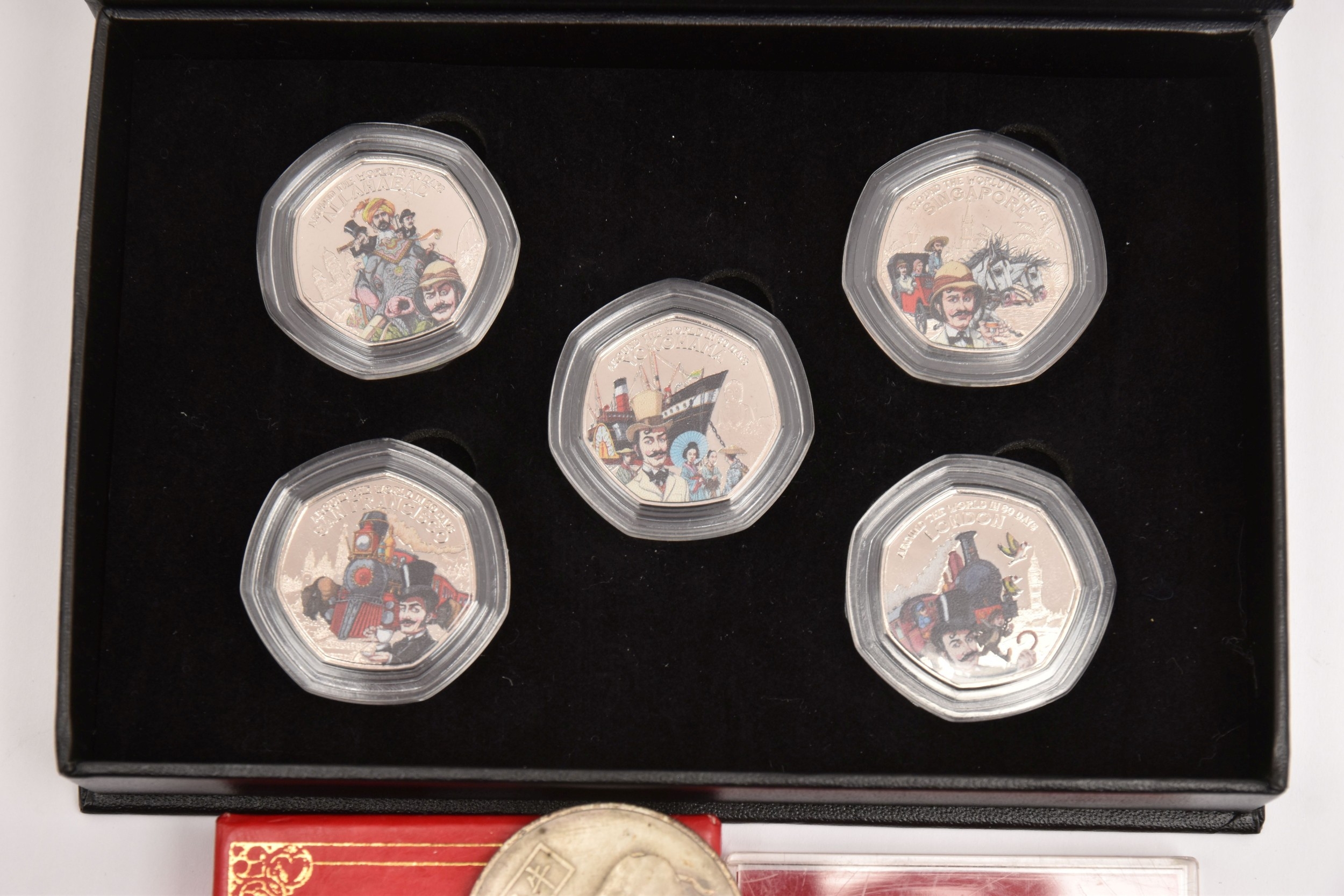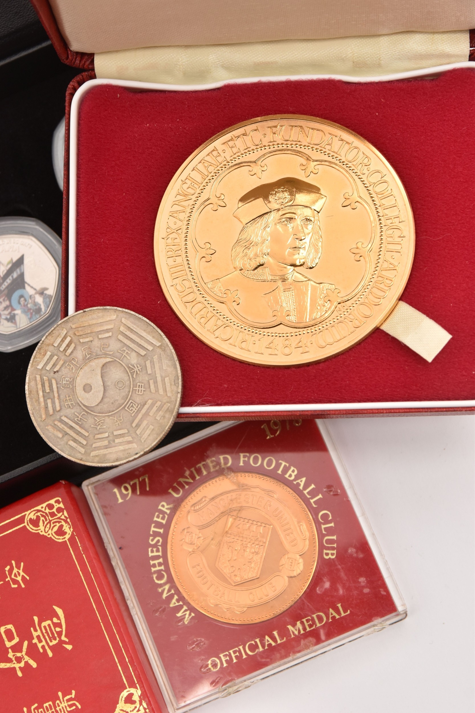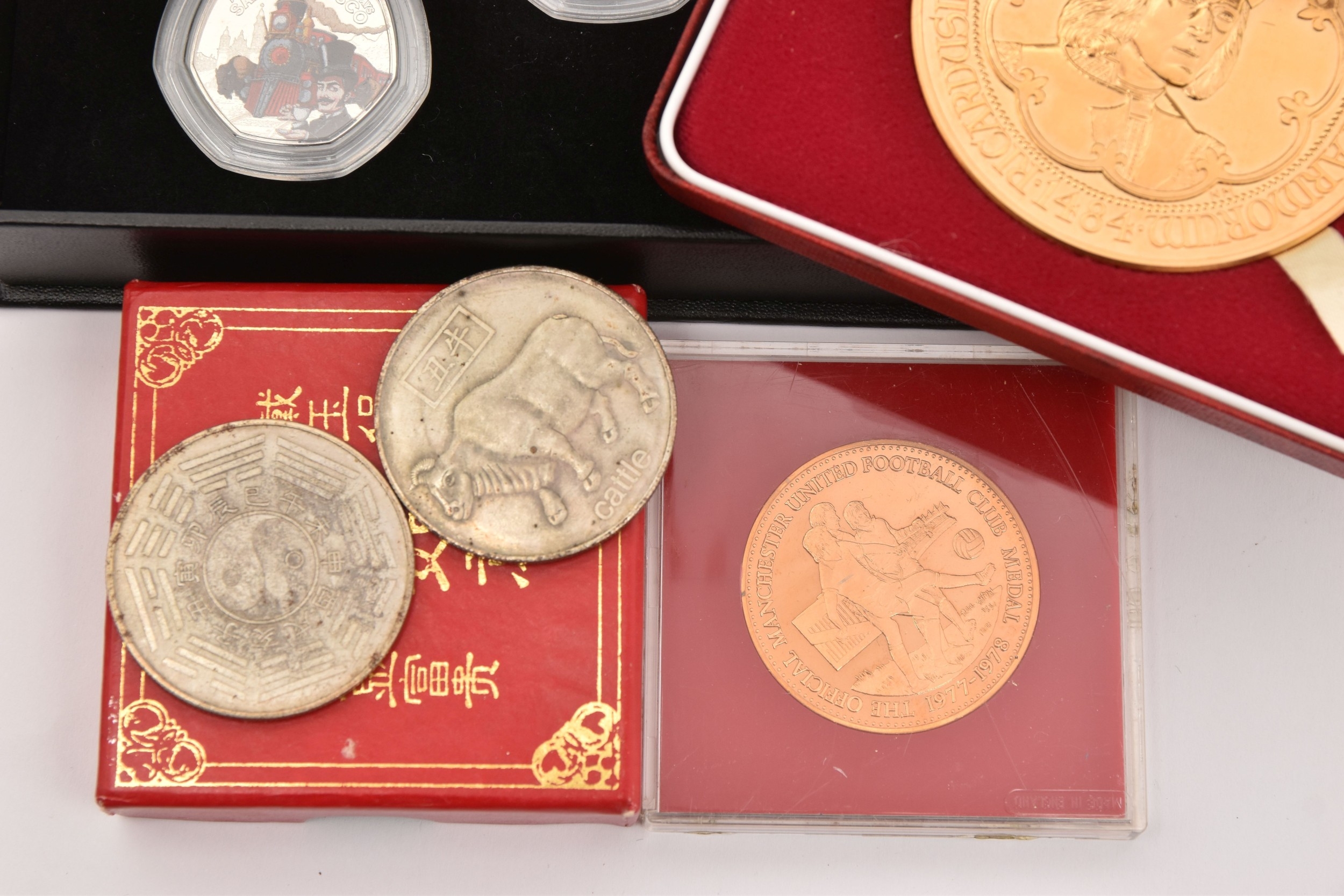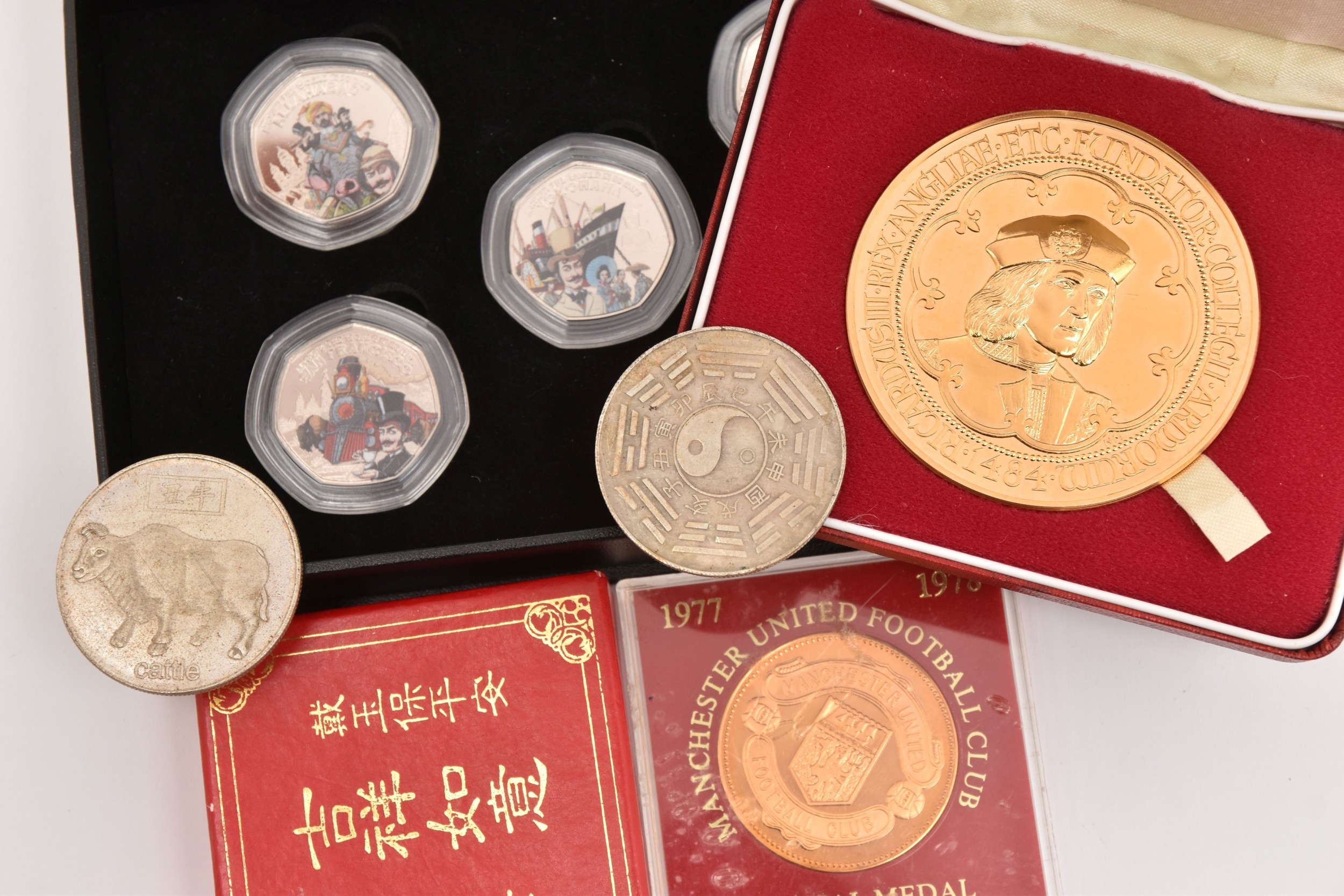 A BAG OF COMMEMORATIVE COINAGE, consisting of a boxed 1984 College of Arms quincentary commemorative medal (gold plated), a boxed 2022 Guernsey 'Around the World in 80 Days' coloured 50p coin set, two Chinese zodiac year of the commemorative medal and a 1977-78 Manchester United official medal
