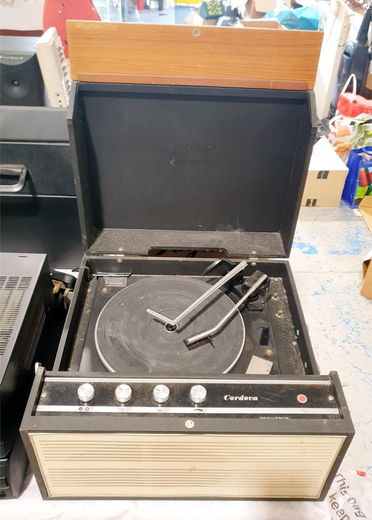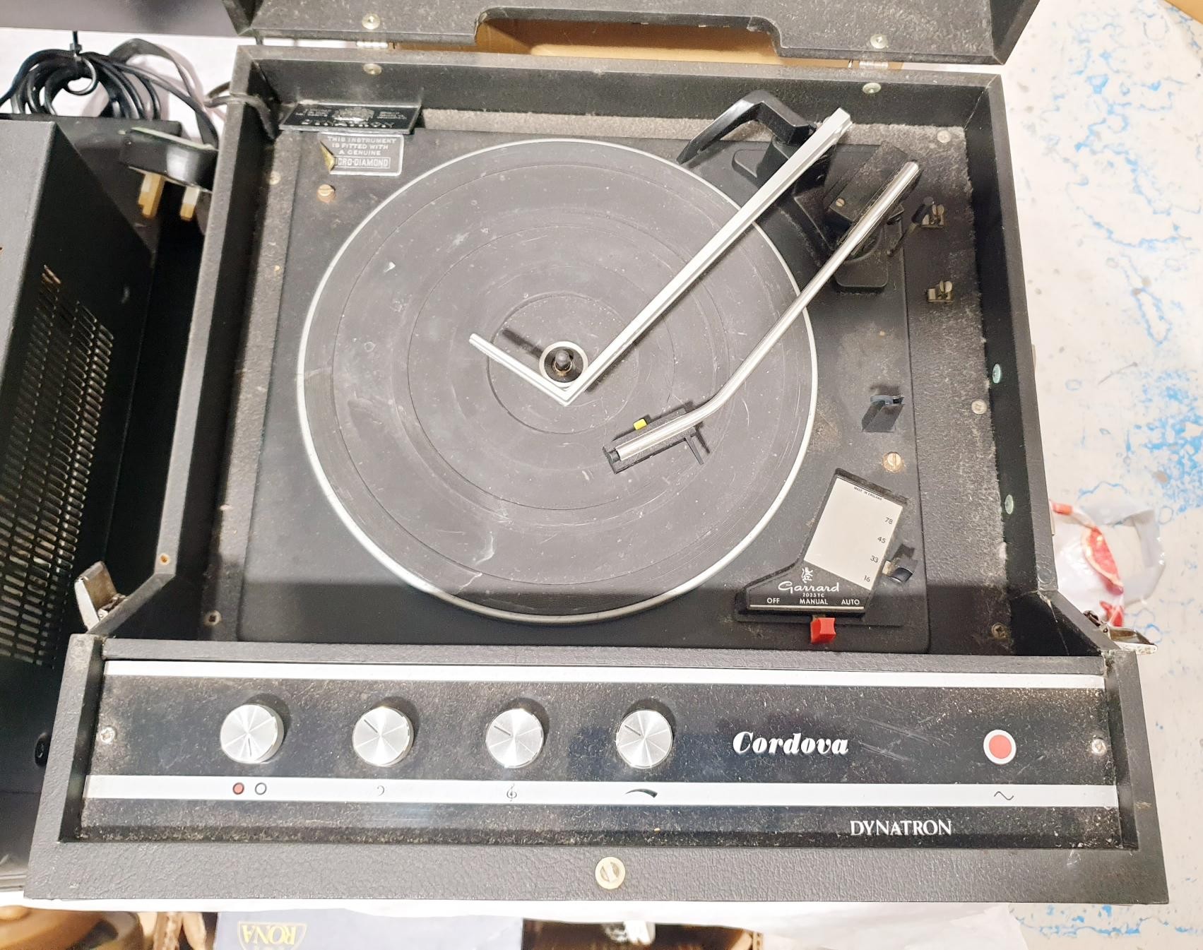 A vintage Garrard Cordova portable record player. No Shipping. Arrange collection or your own packer and shipper, please. Electricals are sold as scrap.