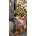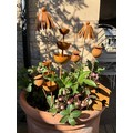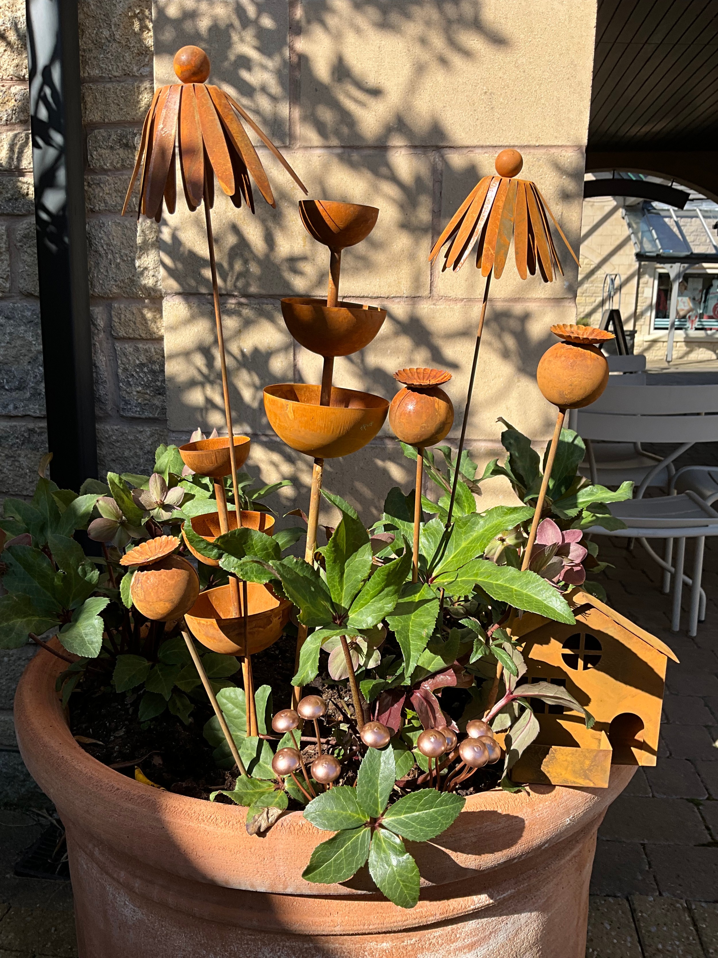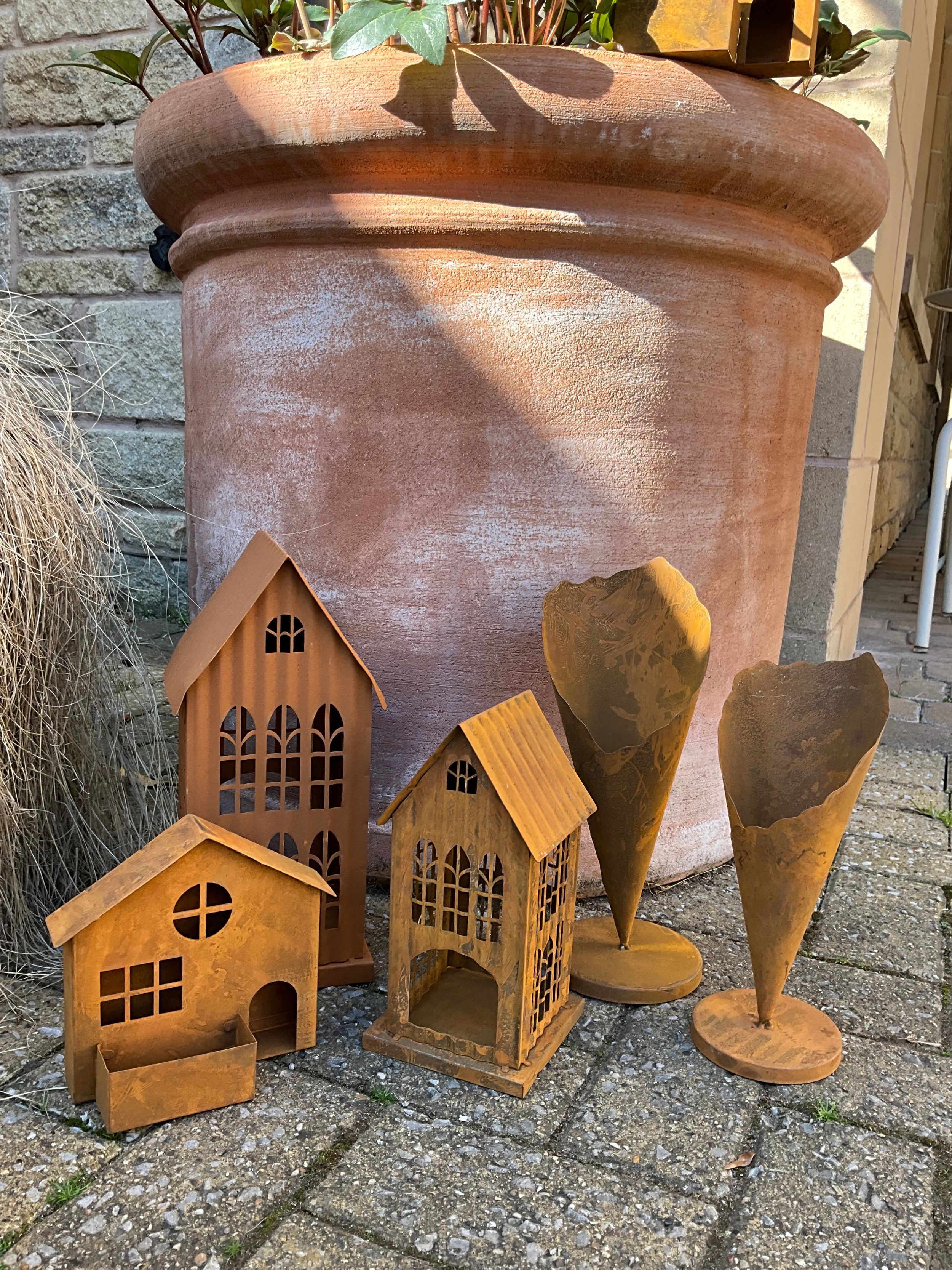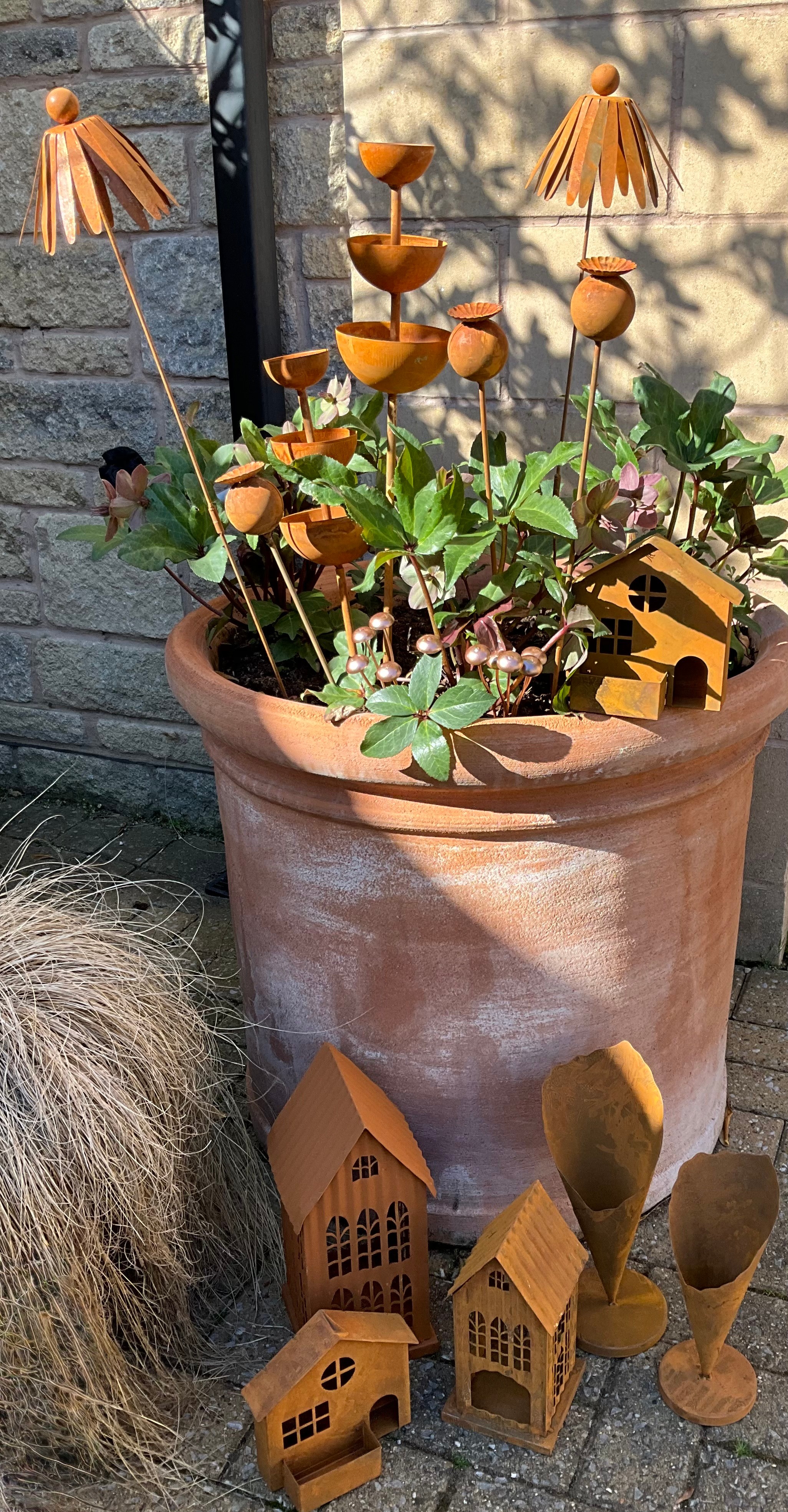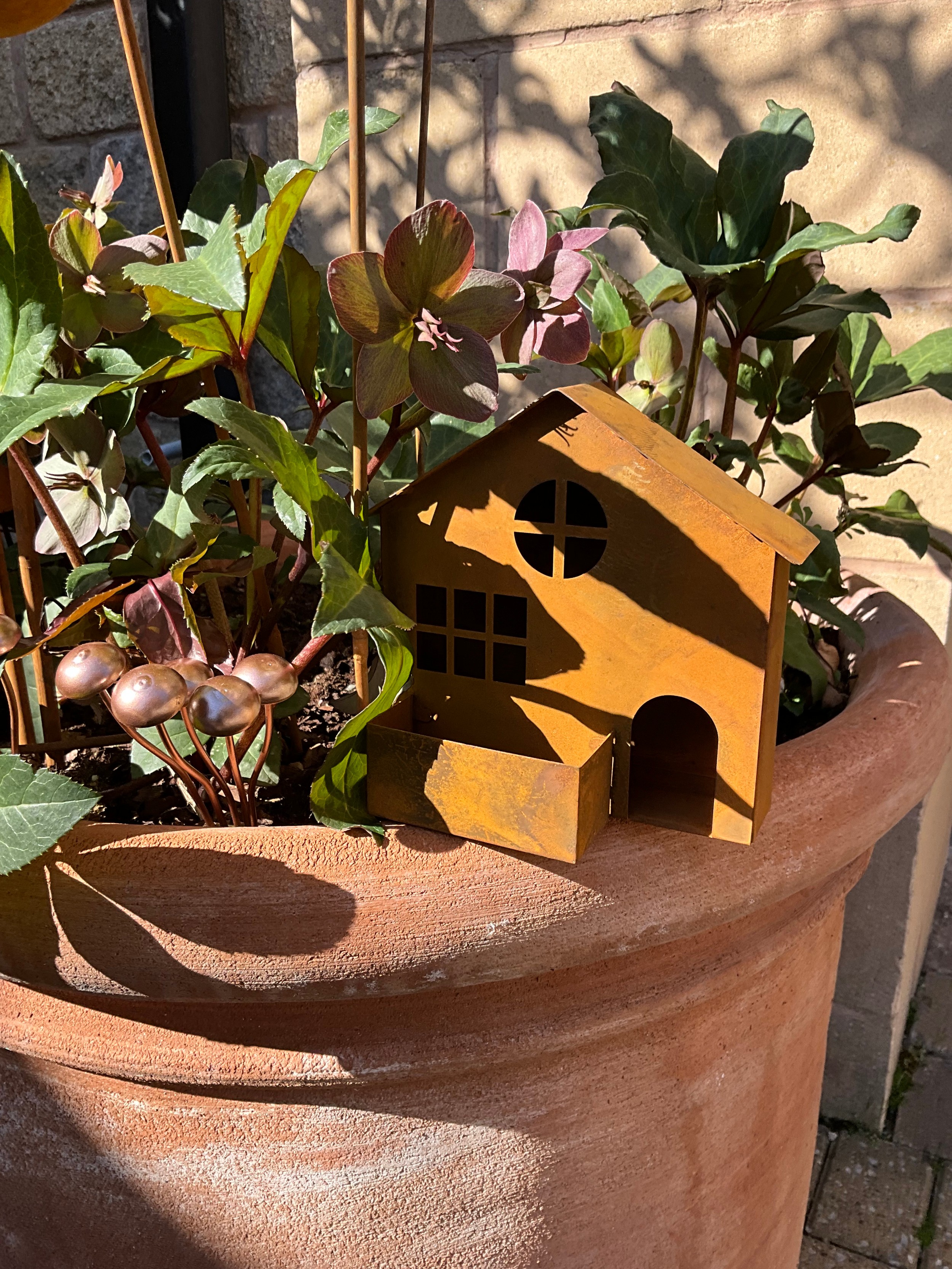 Garden Interest - garden ornaments and other including, a group of weathered metal garden stakes including, dandelions, poppy heads; a pair of three tier rain water catchers; modern bird houses; house shaped pillar candle holders; qty.