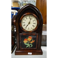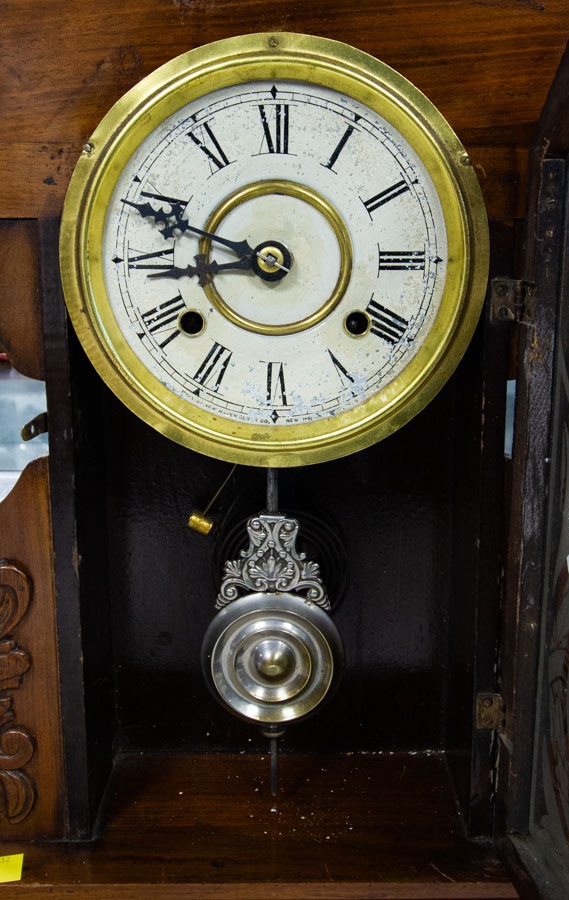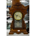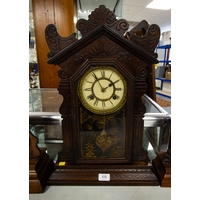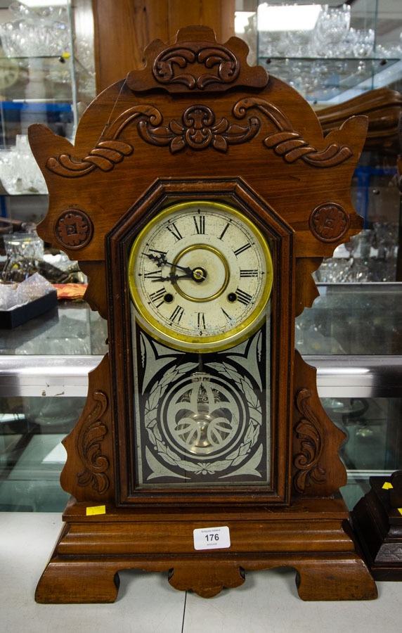 AMERICAN WALNUT 8 DAY STRIKING CLOCK WITH PRESSED WOOD DECORATION. 36 X 58 CM