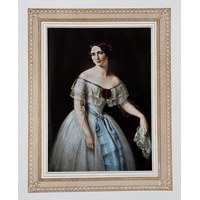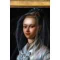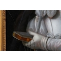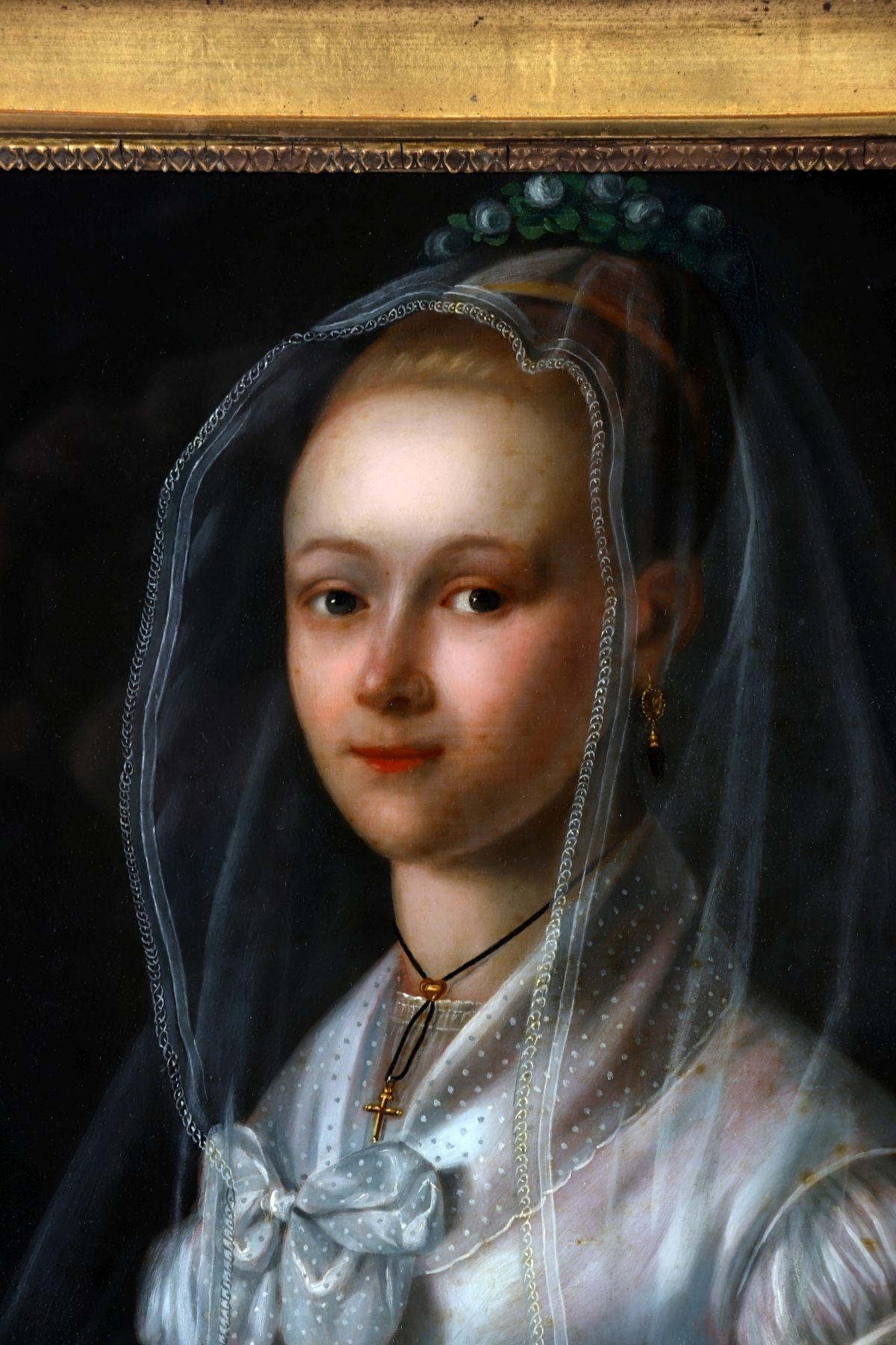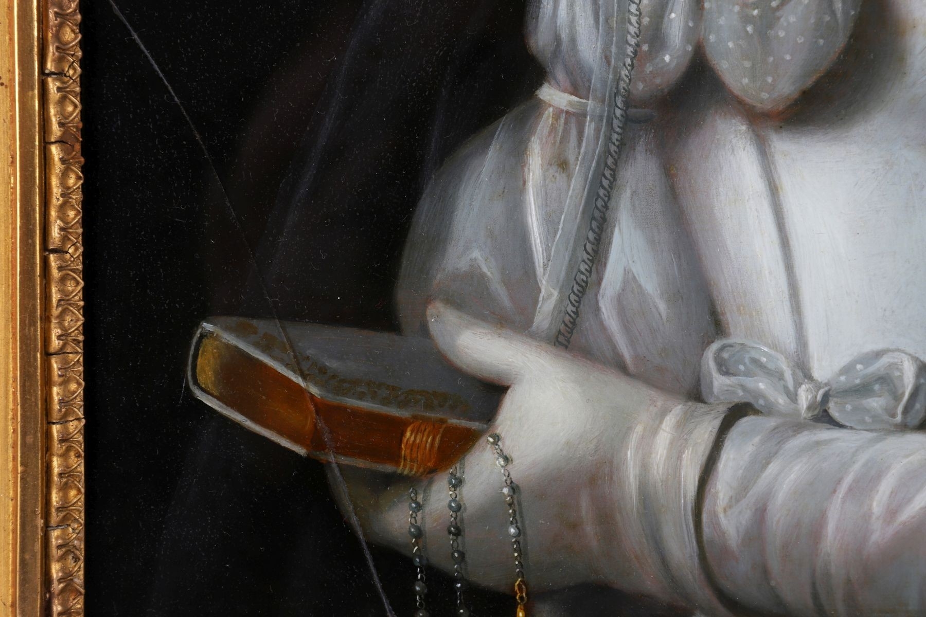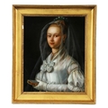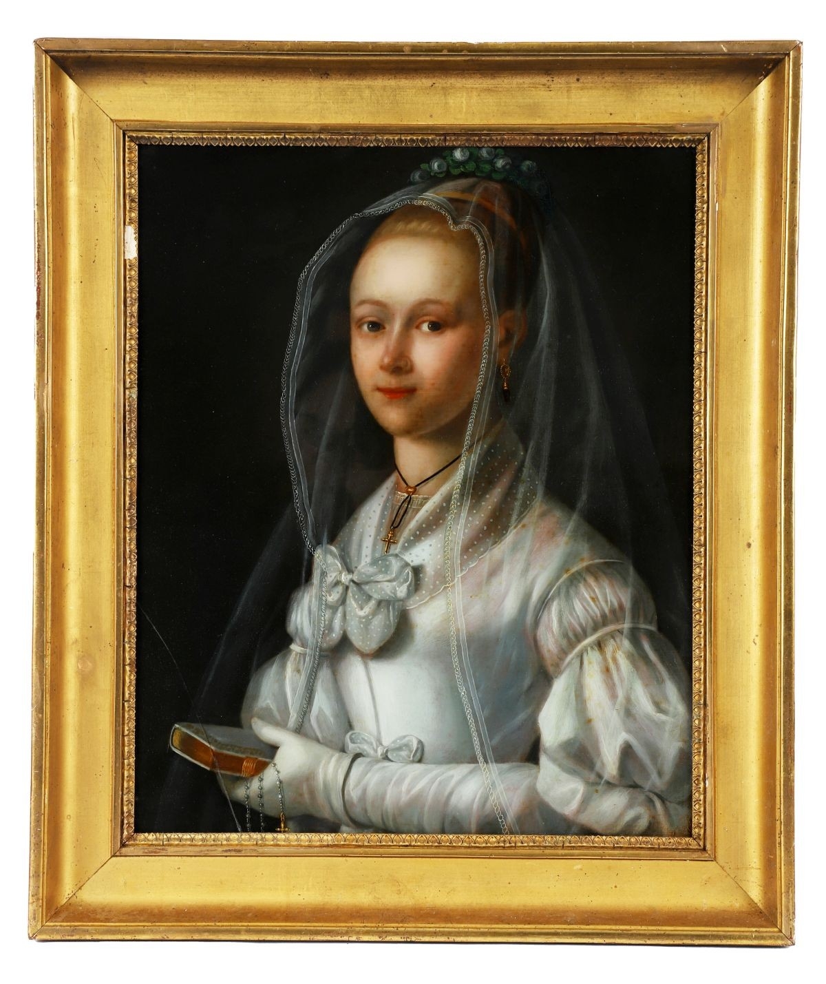 An exquisite reverse-painted glass portrait depicting a young woman holding a book, partially veiled with a translucent gauze veil rendered with remarkable delicacy. The composition demonstrates fine control of light and surface, with softly modelled facial features and careful attention to costume detail. Housed within a gilt moulded frame.
