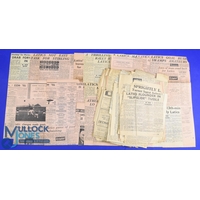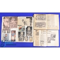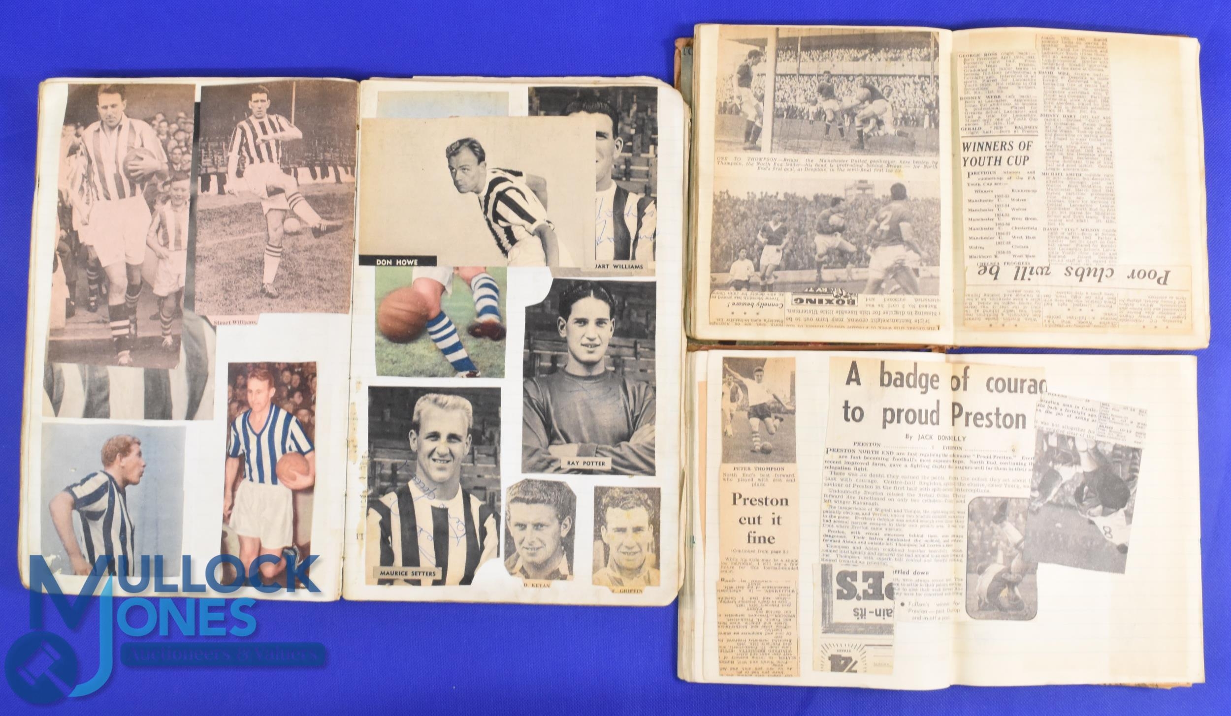 Collection of football scrapbooks mid 1950s to early 1960s (3) to include a large scrapbook (1) covering many clubs with player autographs to include Arsenal: team photo (8 autographs), Ward, Henderson, Docherty, Haverly, Clapton, Kelsey, Bowen, Dodgin, Bloomfield; Aston Villa: team photo (9 autographs, Sims, Sewell, Hitchens, Aldis, Hazleden, Dixon, Seward, Lynn, Myerscough; Tottenham Hotspur: Blanchflower, Smith, Stokes, Norman, Hopkins, Jones, Hills, team photo (6 signatures); Blackburn Rovers: team photo (10 autographs), team photo (8 autographs) Vernon, Isherwood, Whelan, McLeod, Woods, Ron Clayton, Eckersley, Ken Clayton, Leyland, Douglas, Dougan, Dobing, Taylor; Blackpool: team photo (6 autographs) + team photos with approx.. 20 autographs + Durie, Gratrix, Perry, Armfield, Farm, Garett, Peterson, Kelly; Luton Town: team (4 autographs) + Owen, Baynham, Morton, Brown; Everton: Dunlop, Hickson, Collins, Harris, Parker, Meagan; West Ham Utd: Woosnam, Dick, Brice, Musgrove, Bond, Cantwell, Brown; Chelsea: Brabrook, Greaves, Saunders, Sillett, Scott, Tindall, Matthews; Portsmouth: Dickinson, McGhee; Manchester Utd: Jimmy Murphy, Albert Scanlon; Wolves: Deeley, Mullen, Finlayson, Mason, Broadbent, Flowers; West Bromwich Albion: team photo (7 signatures) + Setters, Keven, Drury, Williams, Howe, Robson; Burnley: Miller, Adamson, Pilkington, Cummins, Robson, team photo (5 signatures) Angus, Pouter, McIlroy, Blacklaw; Newcastle Utd: Scoular, McMichael; plus many others not counted; scrapbook (2) covering Presto N.E. early 1960s match reports from newspapers and action photos, scrapbook (3) covering Tom Finney's 'final season for Preston NE with signature and match reports plus final match programme and FAYC final v Chelsea laid down; used condition, fair at best. (3)