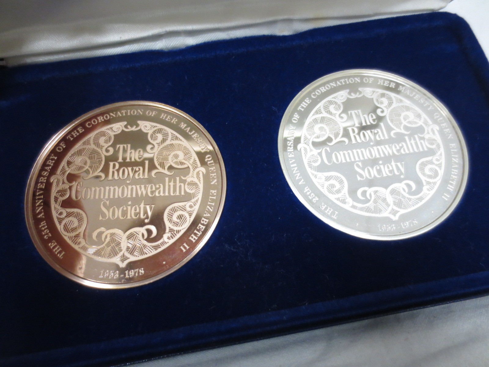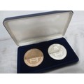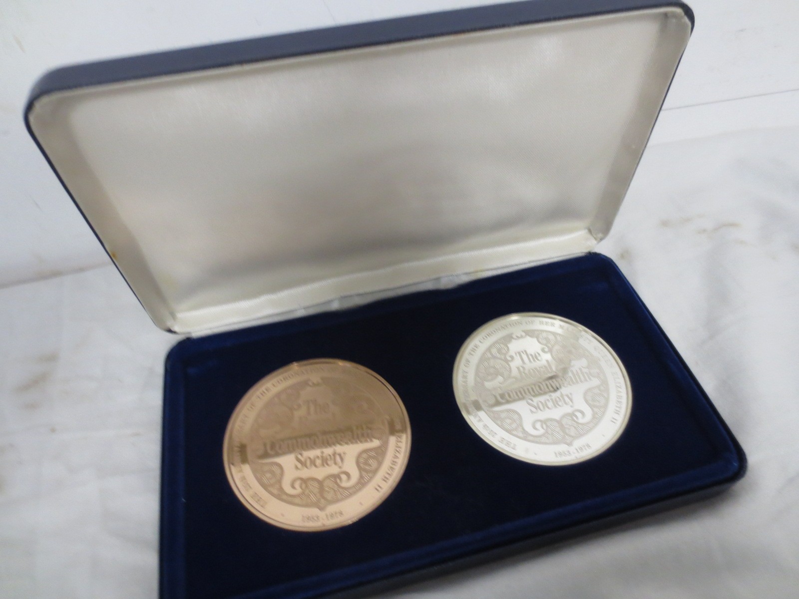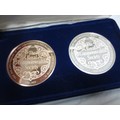 A pair of Royal Commonwealth Society coins, one bronze, the other sterling silver, silver coin weighs approx 127g, bronze weighs 132g, matching numbers on set, #004, in presentation case, mint condition