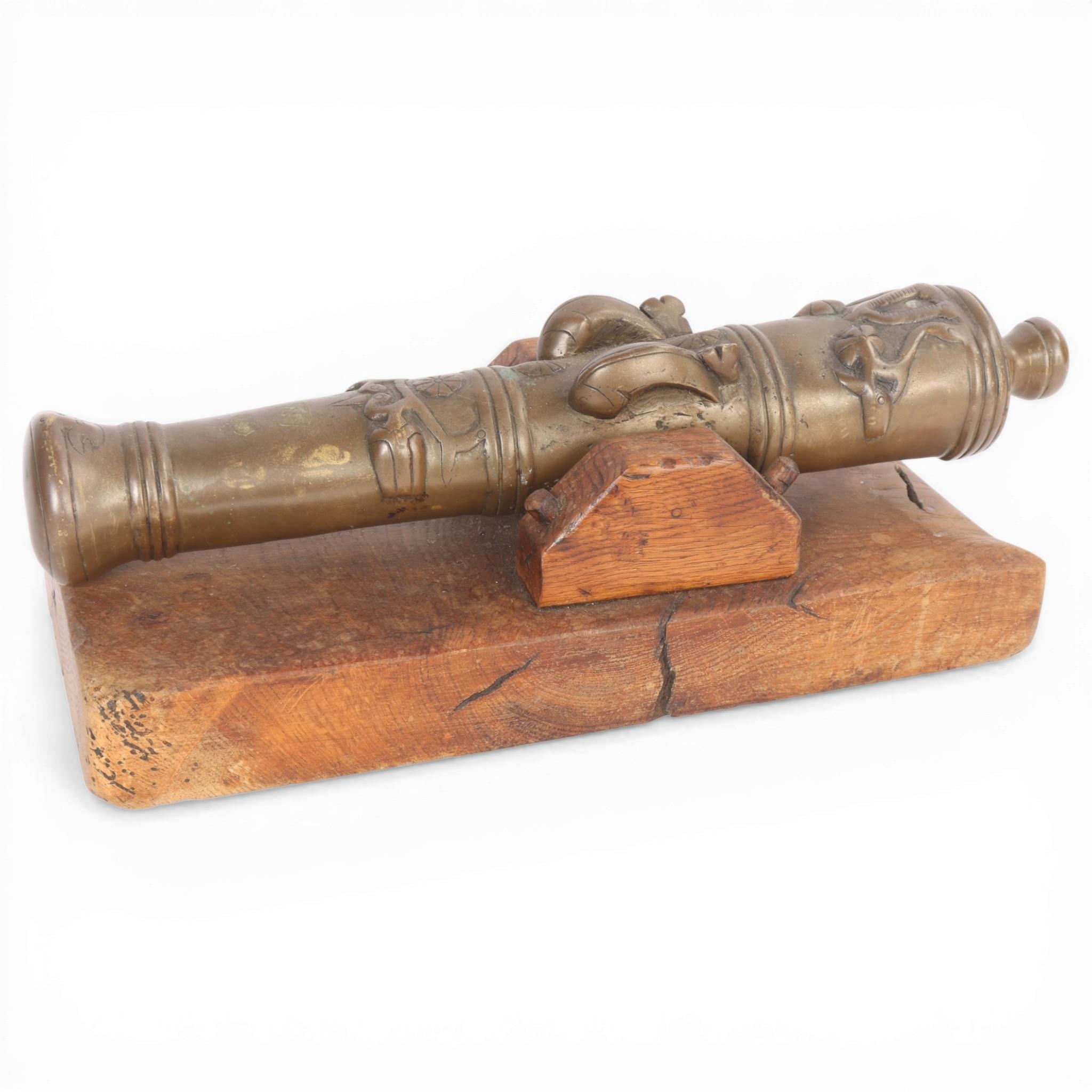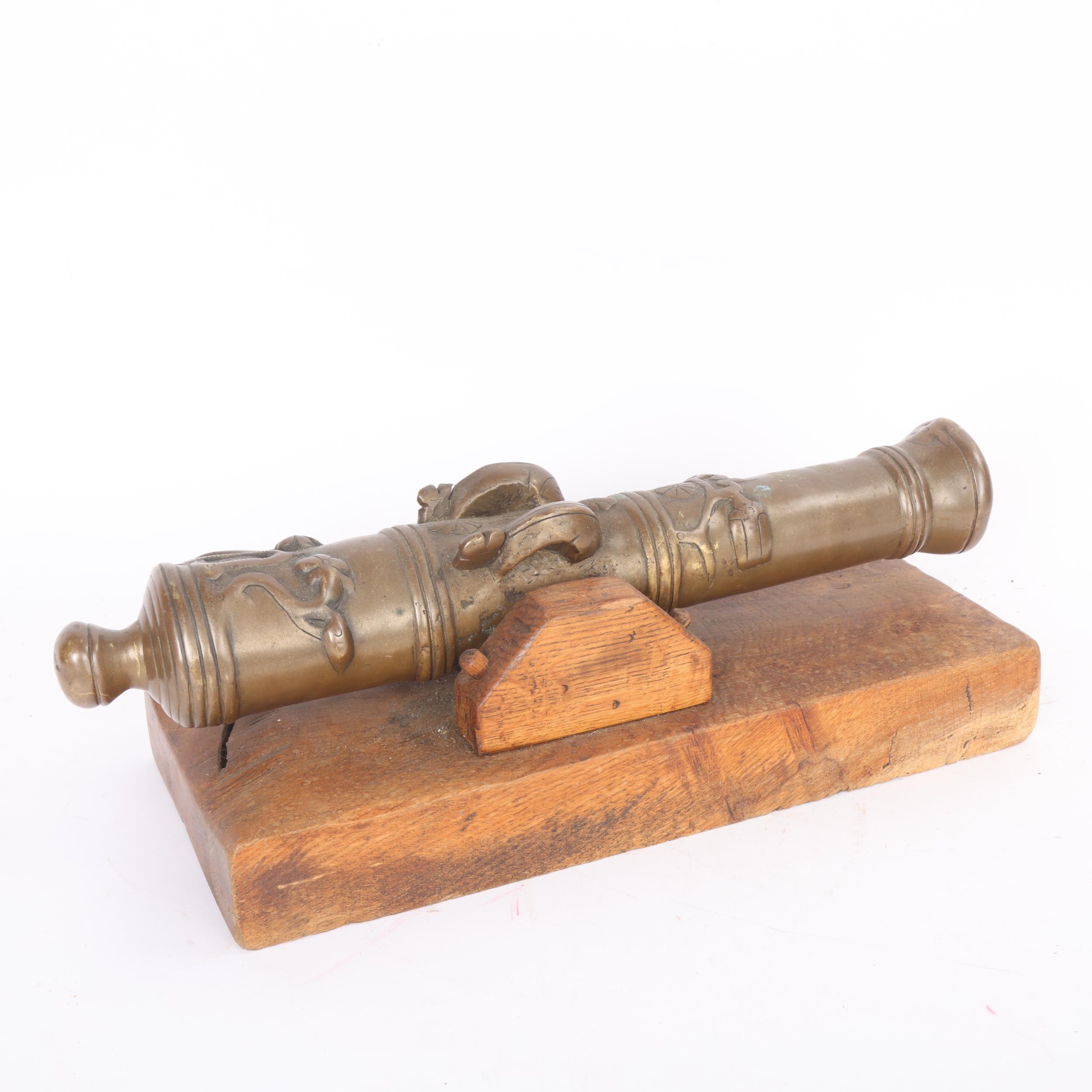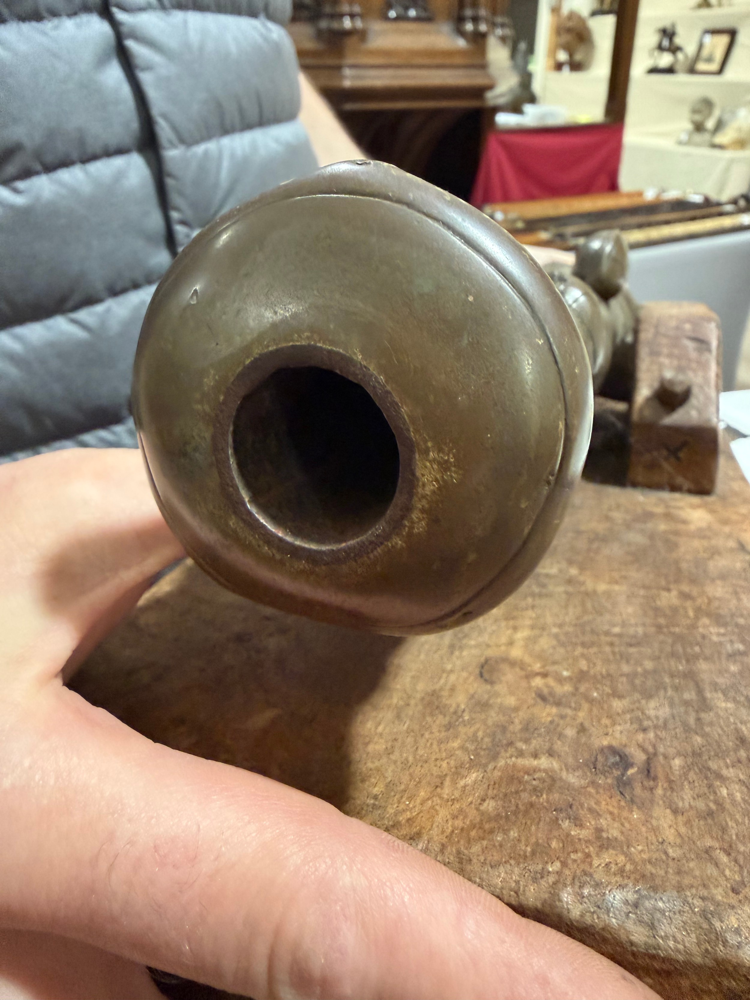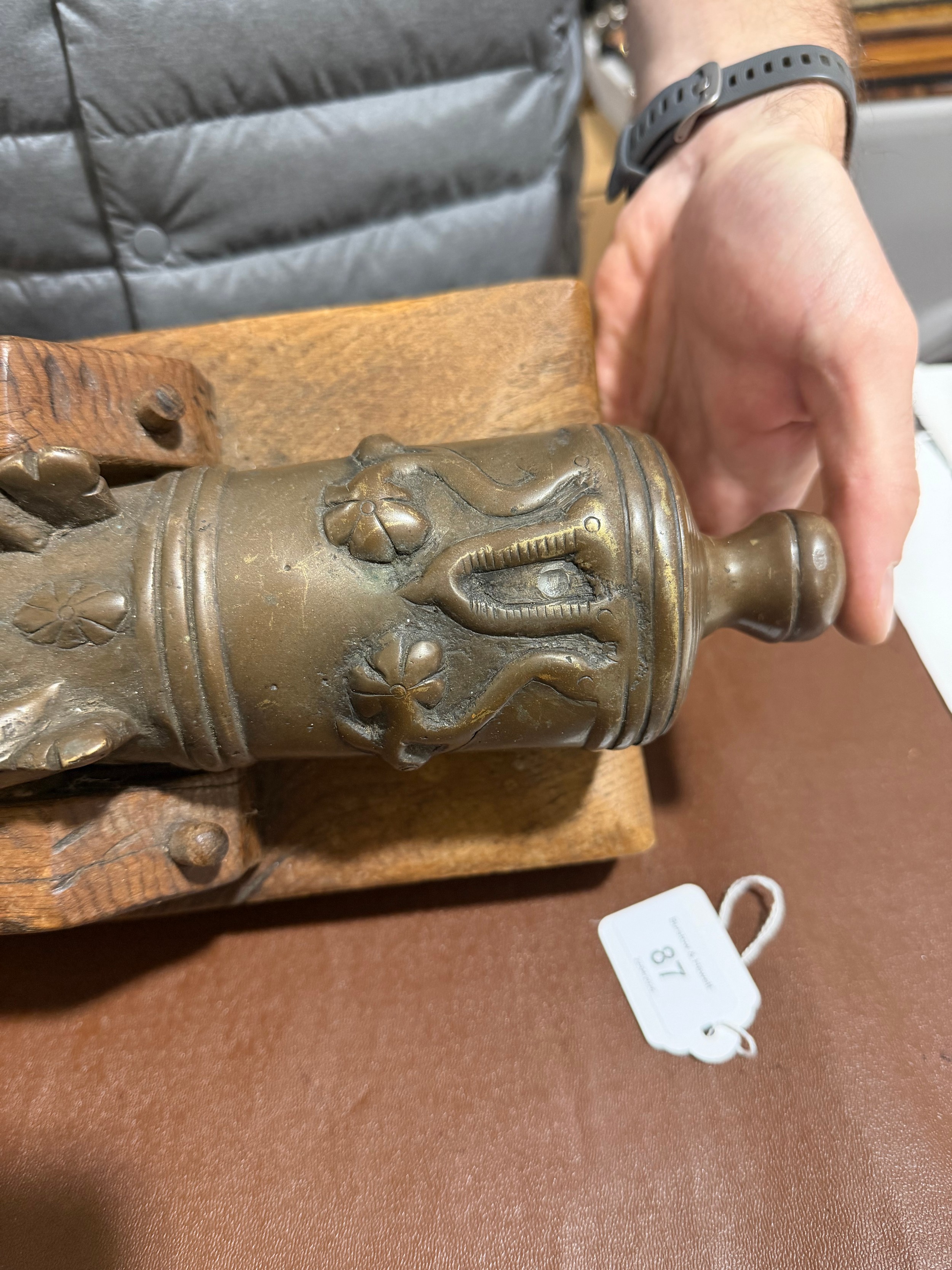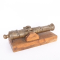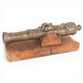 A heavy solid cast-bronze model cannon, on rustic wood stand, barrel length 41cm