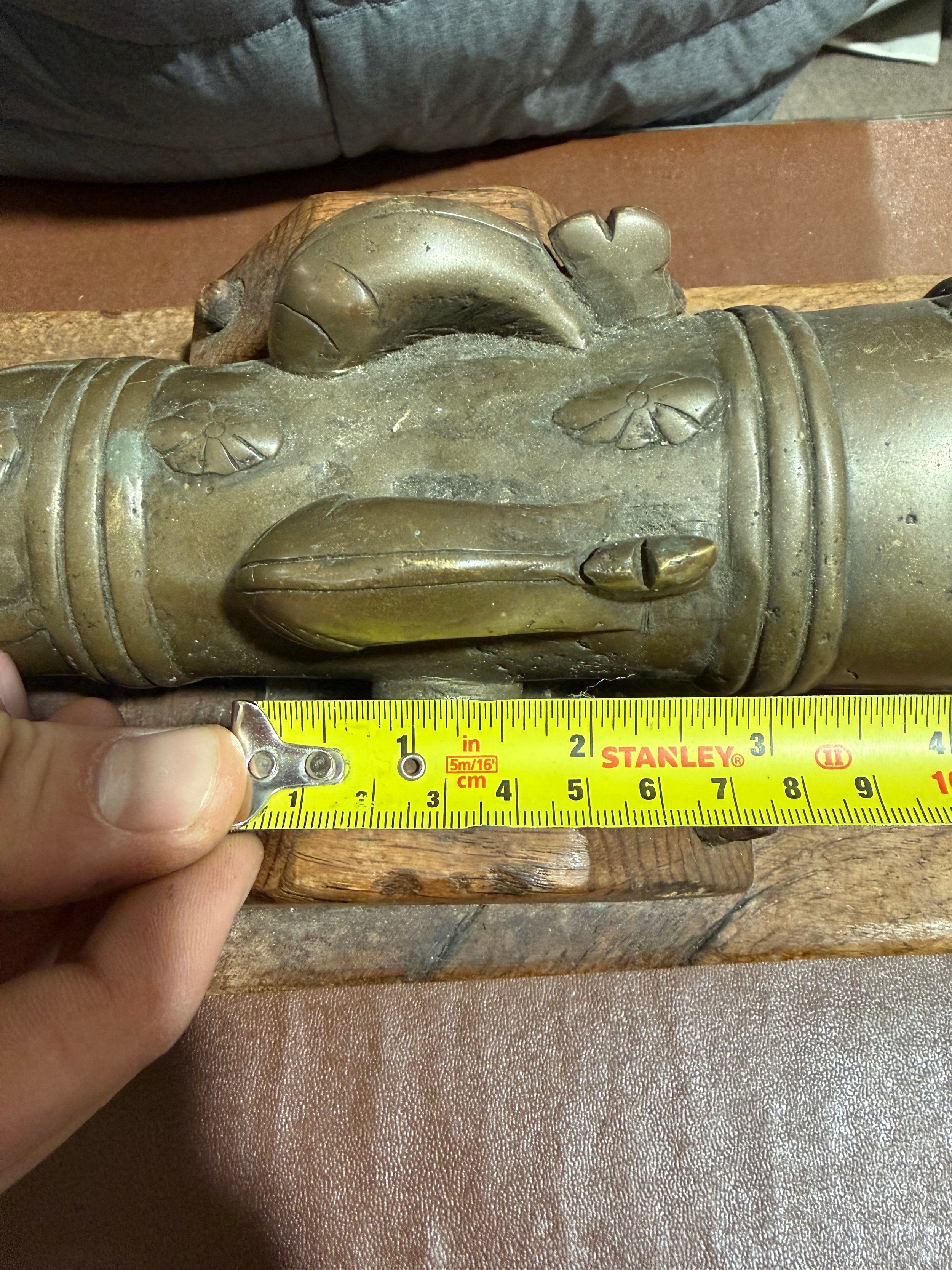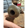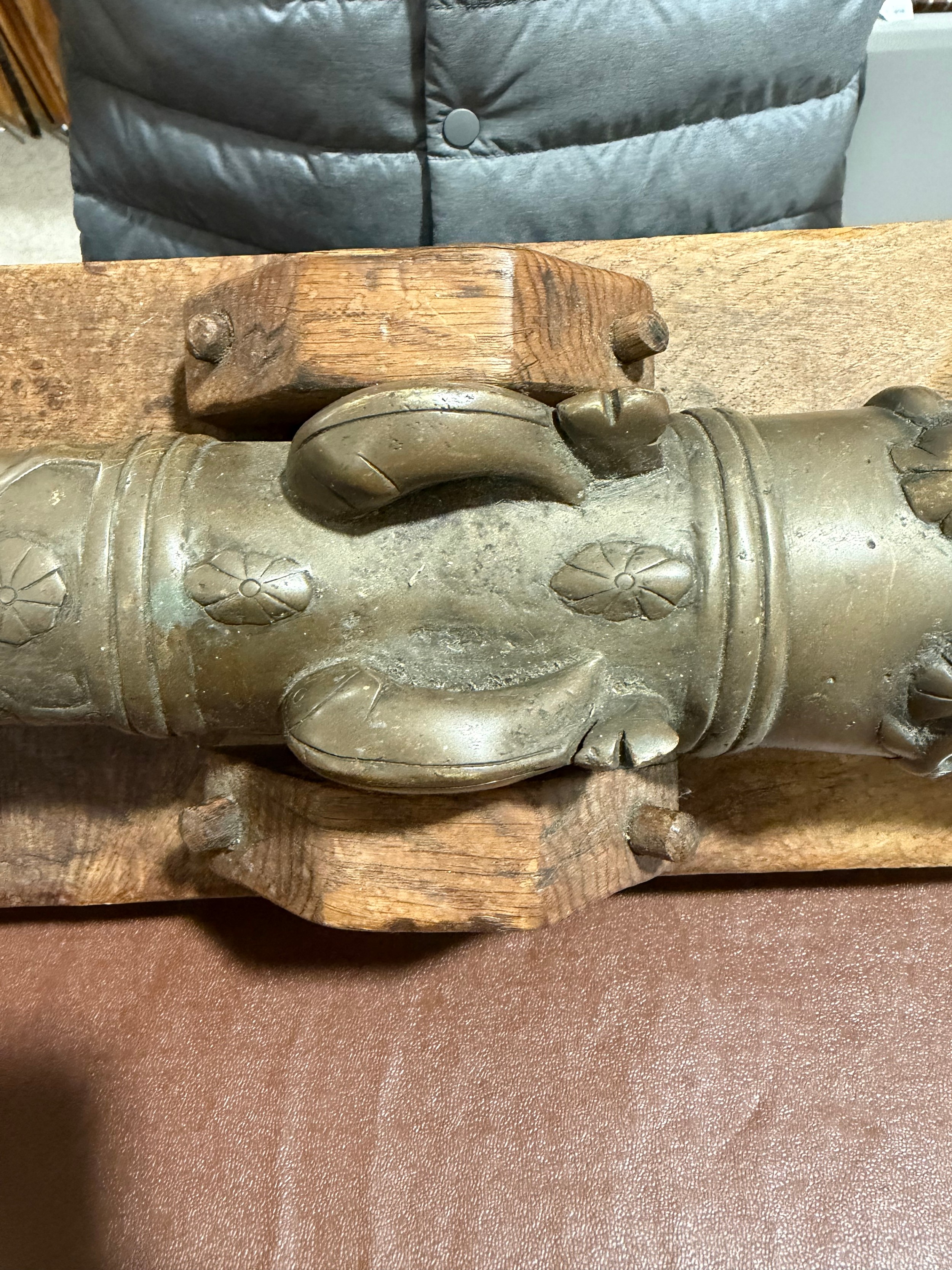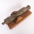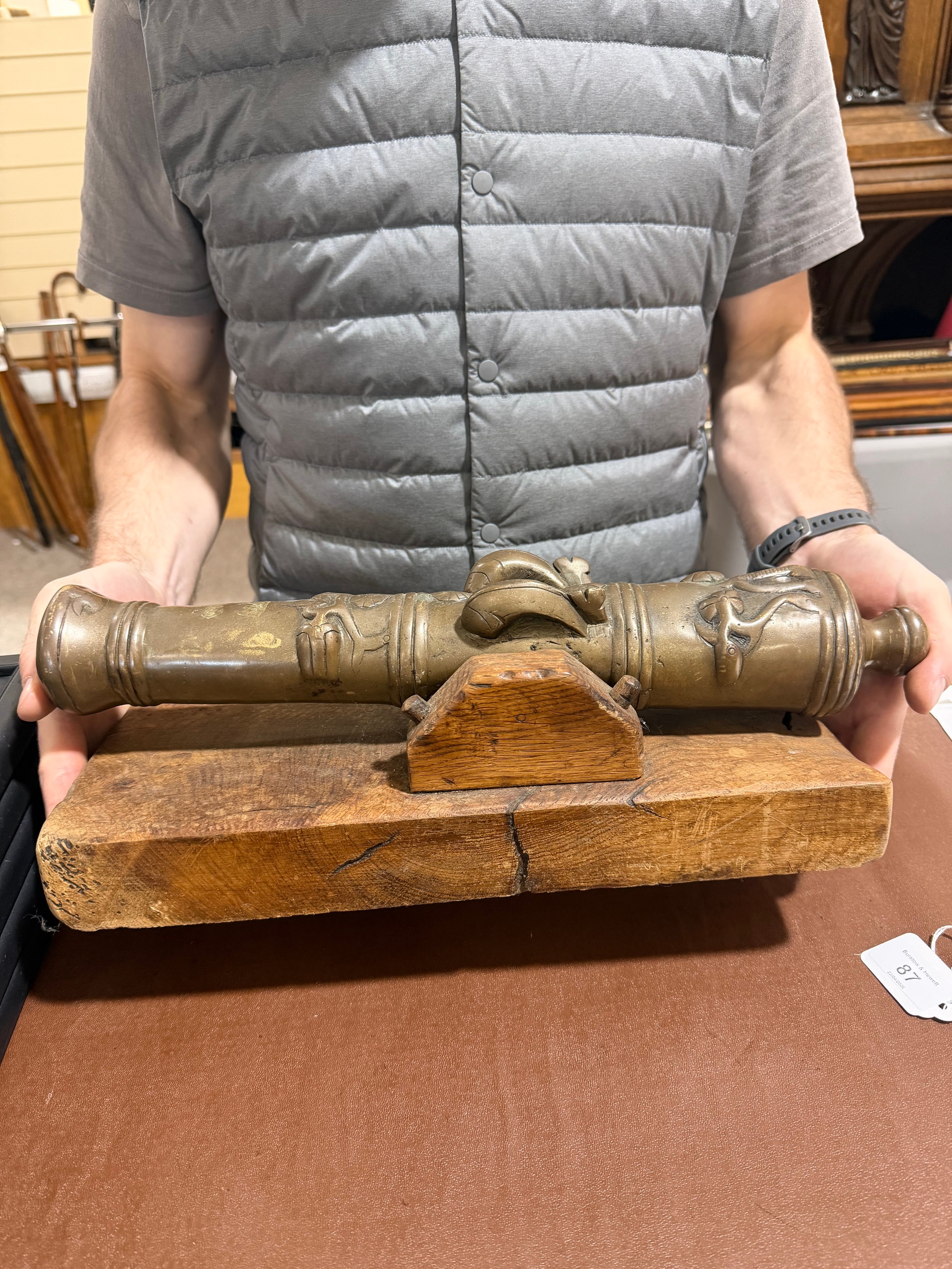 A heavy solid cast-bronze model cannon, on rustic wood stand, barrel length 41cm