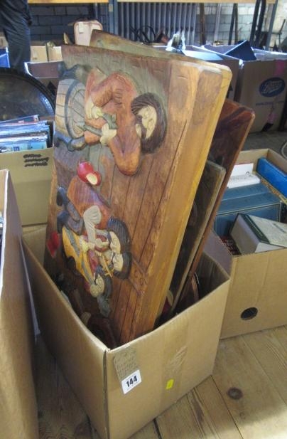 BOX OF WOODEN PICTURES AND PLATES