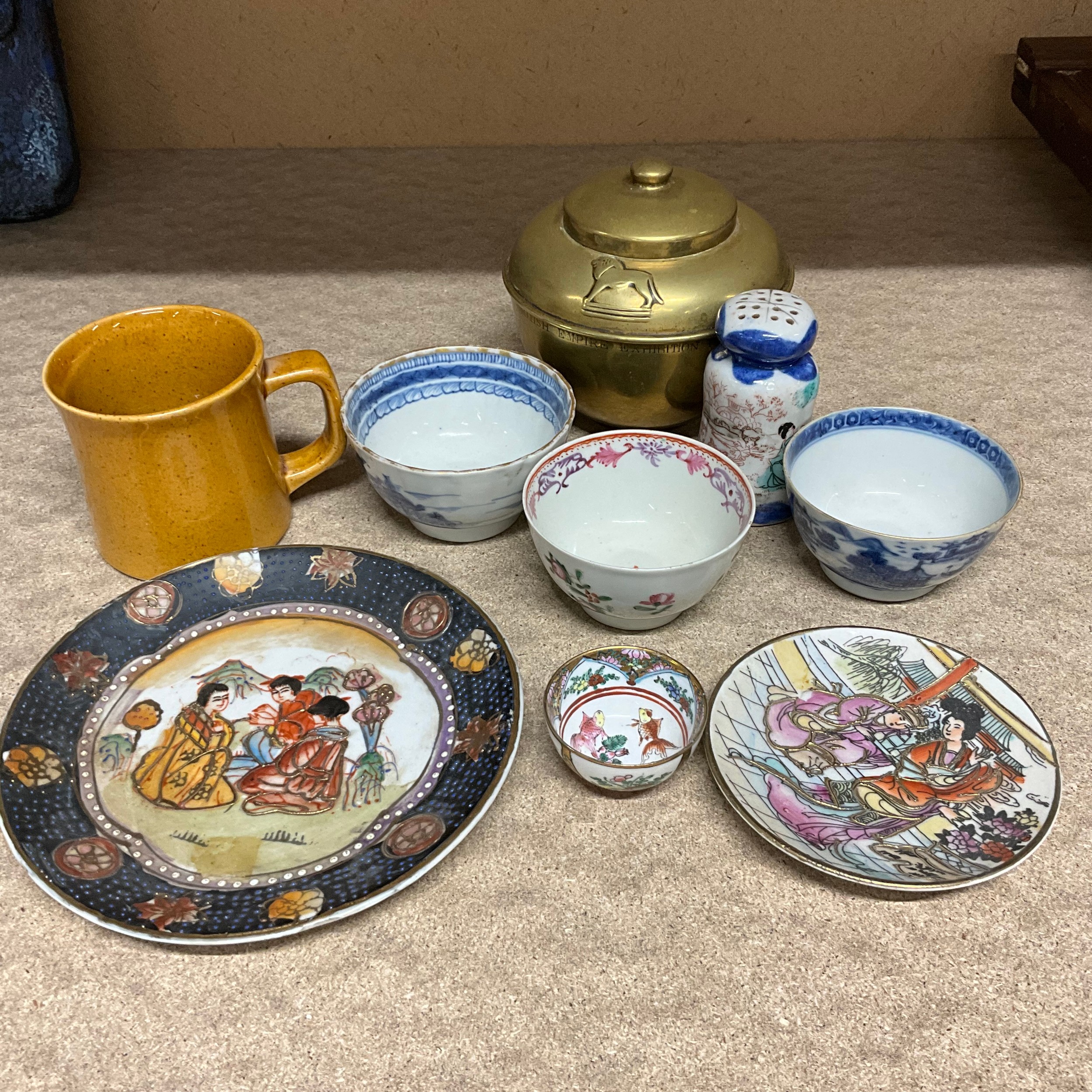 1925 British Empire Exhibition Lipton tea caddy, along with three bowls, one 19th-century example and various other oriental style ceramics.