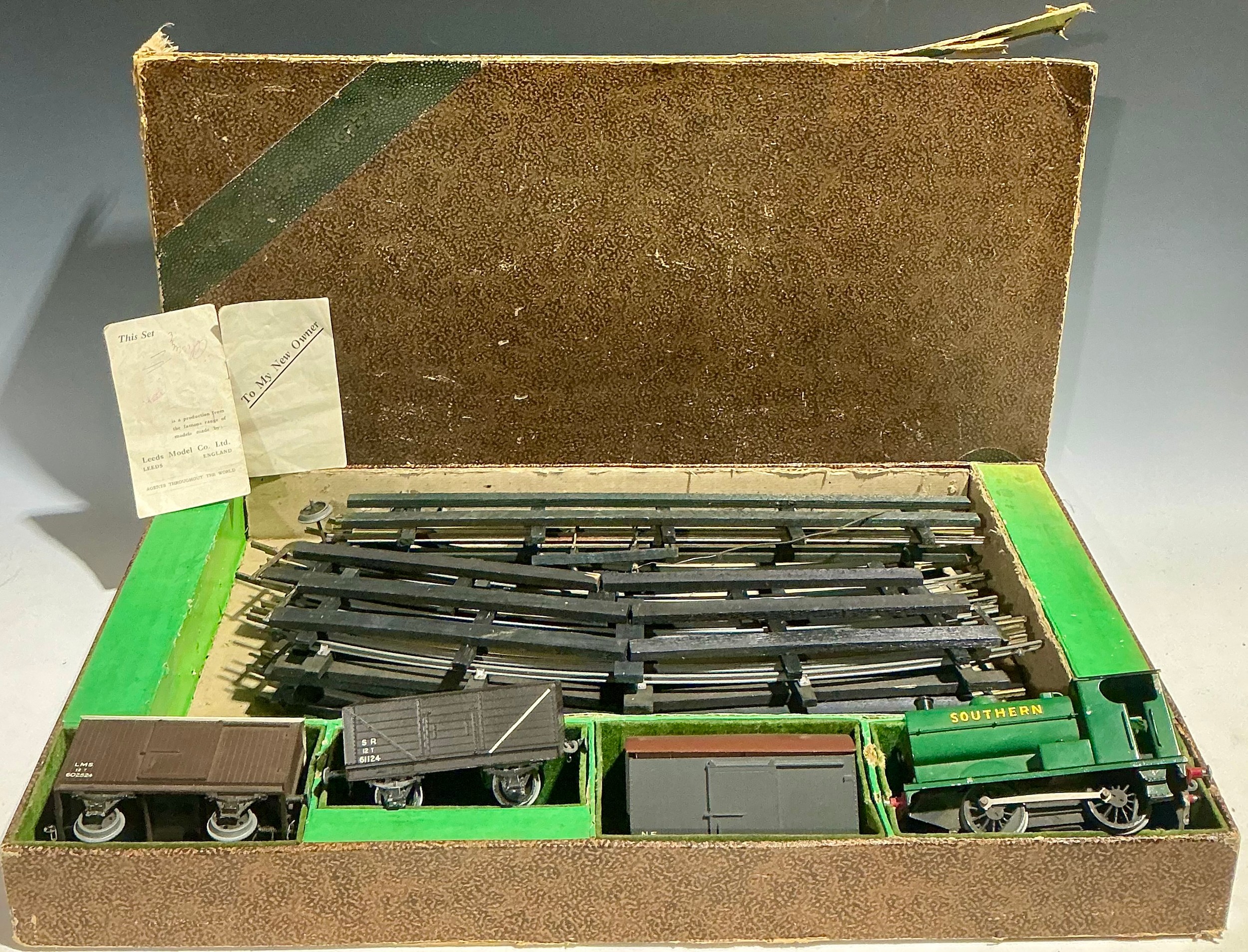 Leeds Model Company "0" gauge Southern three rail electric train set inc 0-4-0 goods locomotive , southern green livery, three goods wagon, and assorted track, original box, c.1945