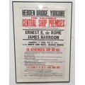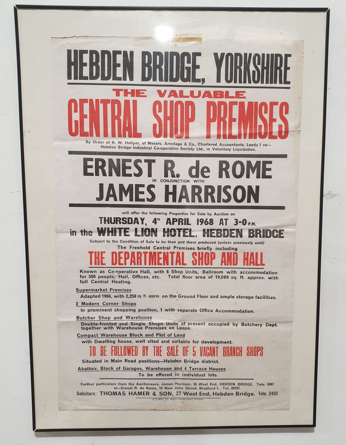 A vintage auction poster dating to 1968, advertising the sale of "The Departmental Shop and Hall, Known as the Co-operative Hall" and five further shops in in Hebden Bridge, West Yorkshire, by agents Ernest R. de Rome and James Harrison, 35"x22.5". No shipping. Arrange collection or your own packer and shipper please.