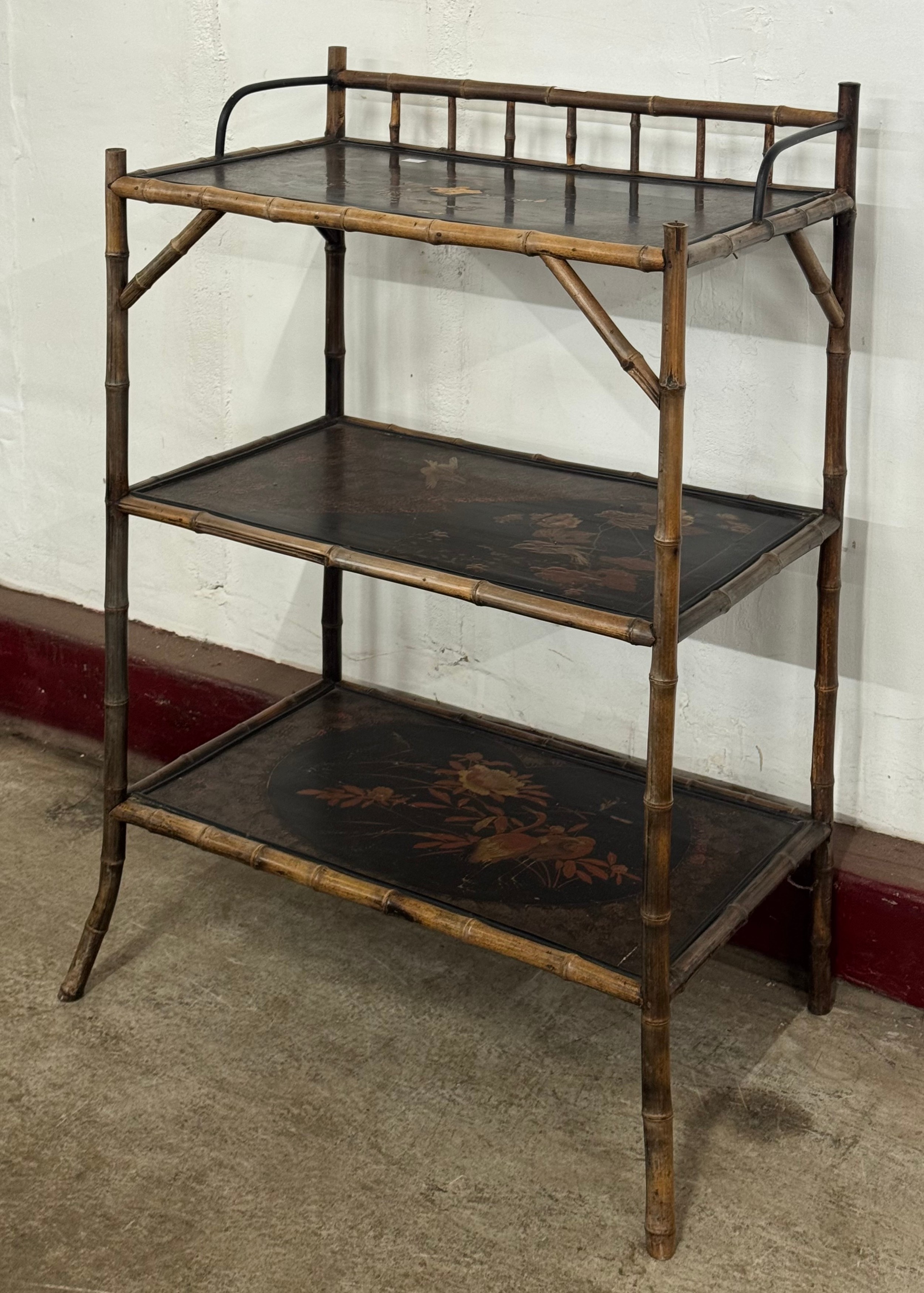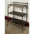 A Victorian Aesthetic Movement bamboo and chinoiserie decorated three tier etergere