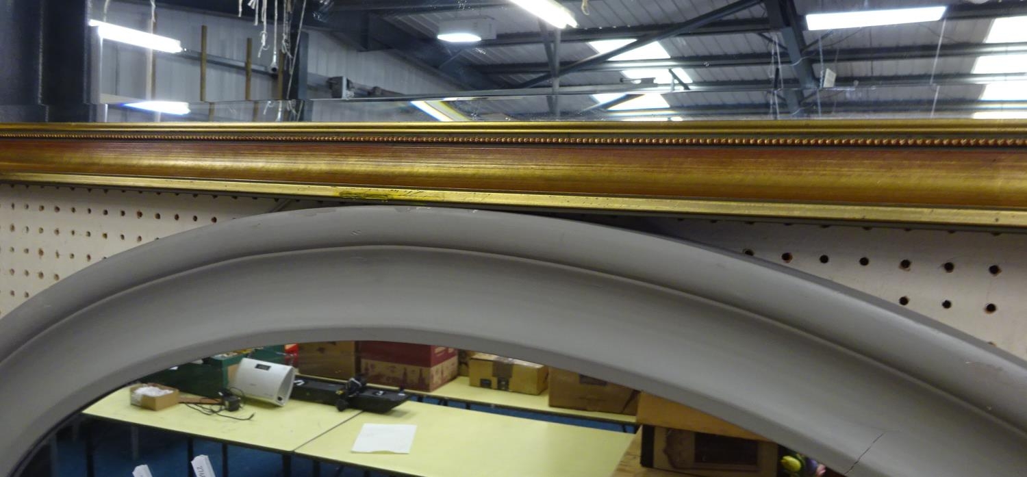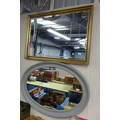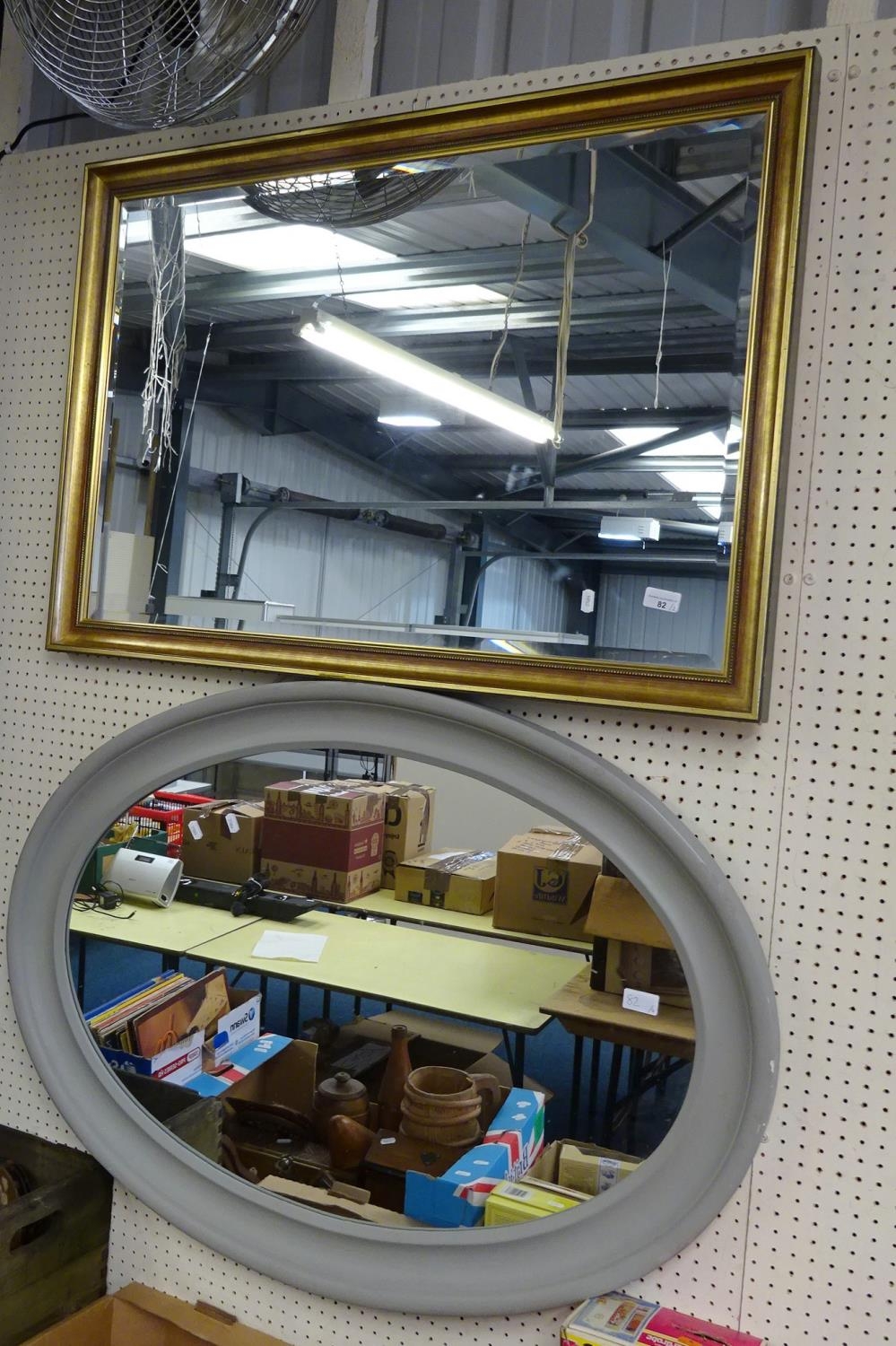 A large grey modern oval mirror 106 x 75cm together with a further large bevelled mirror 100 x 69cm (2).