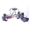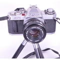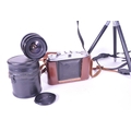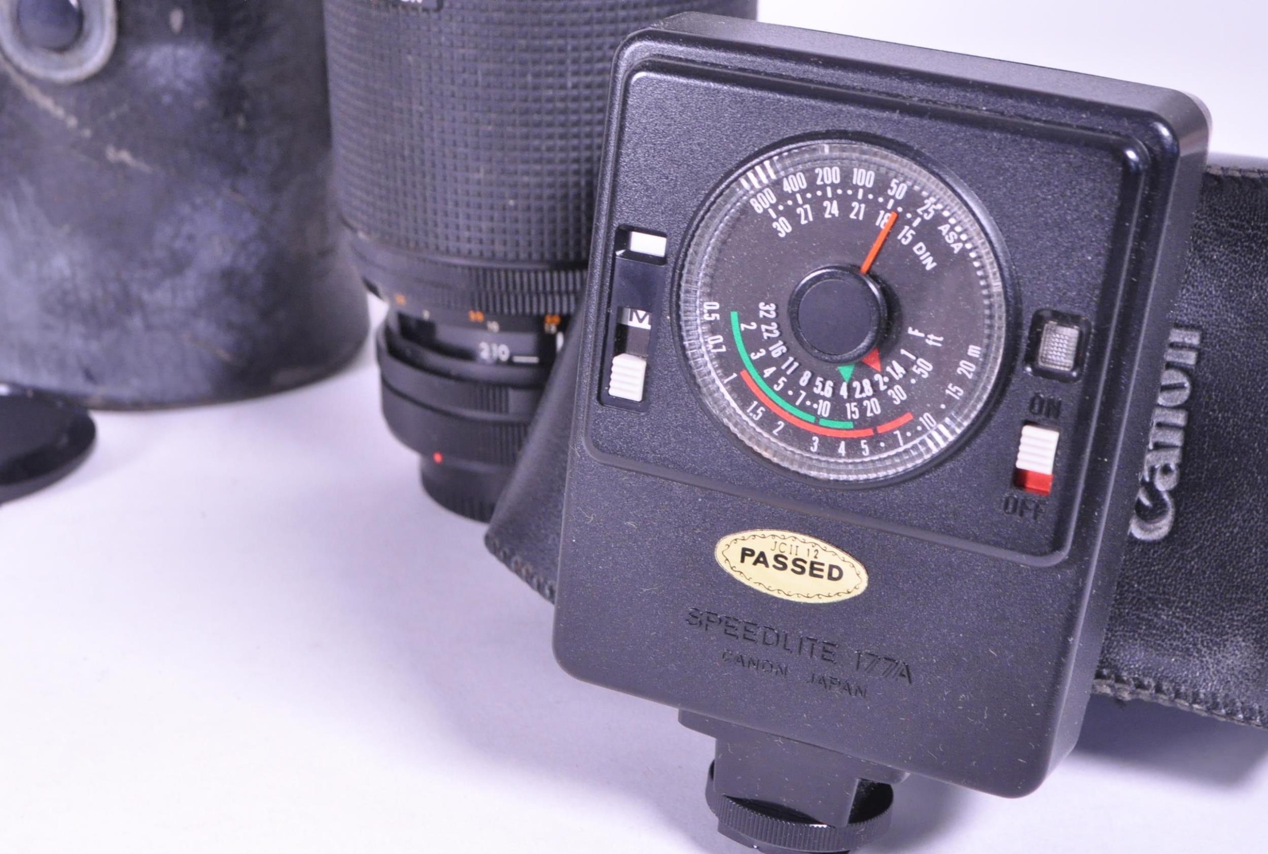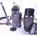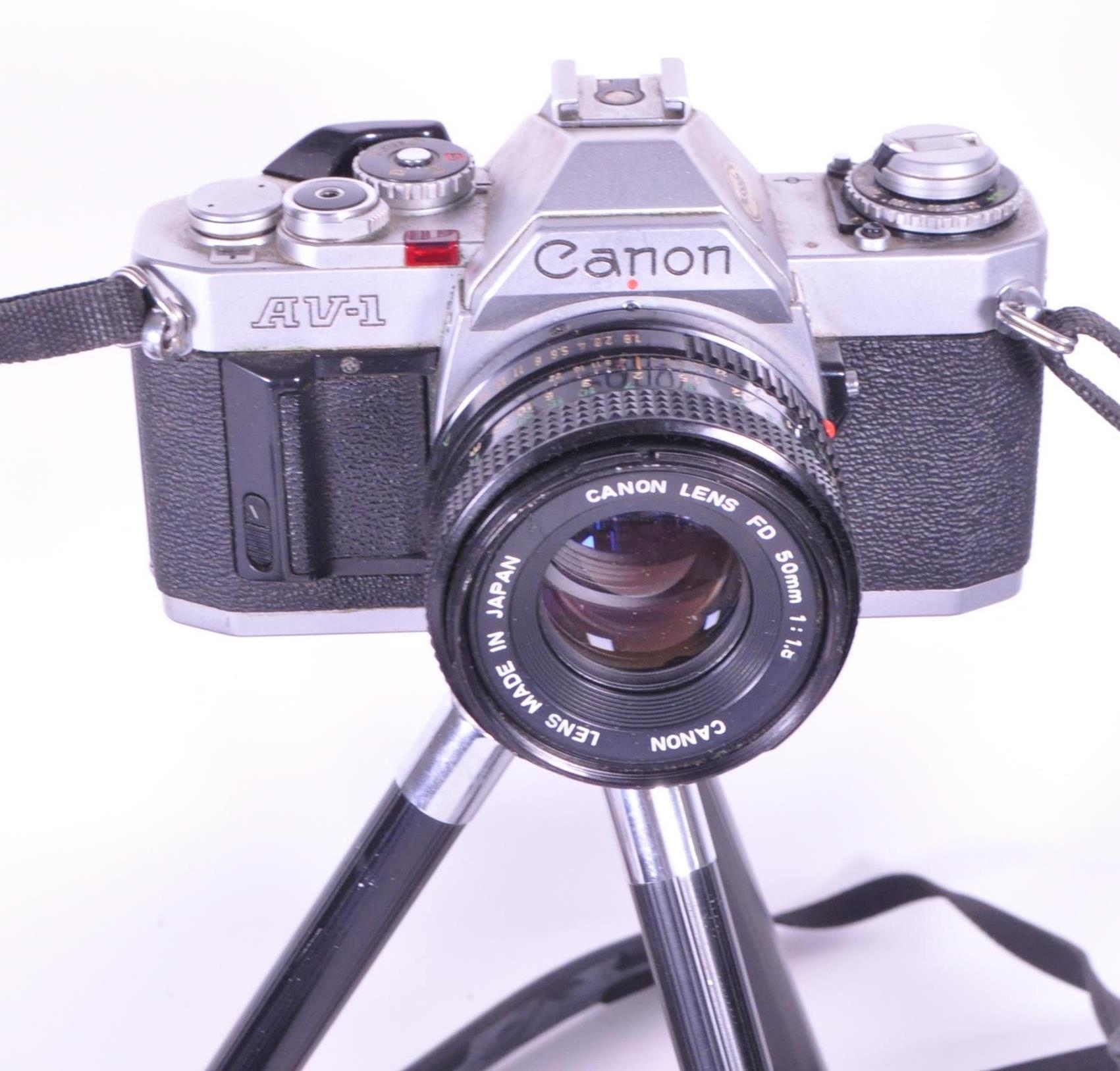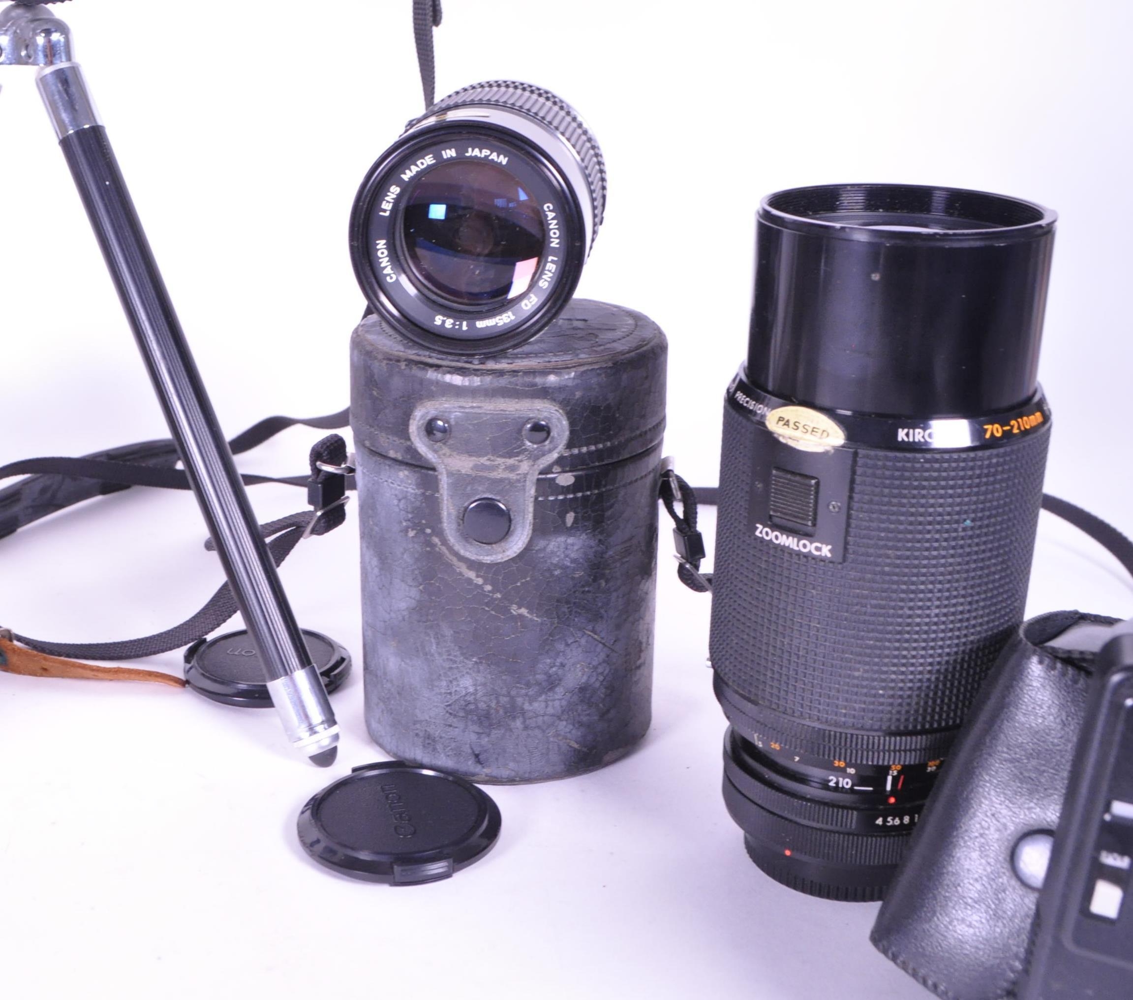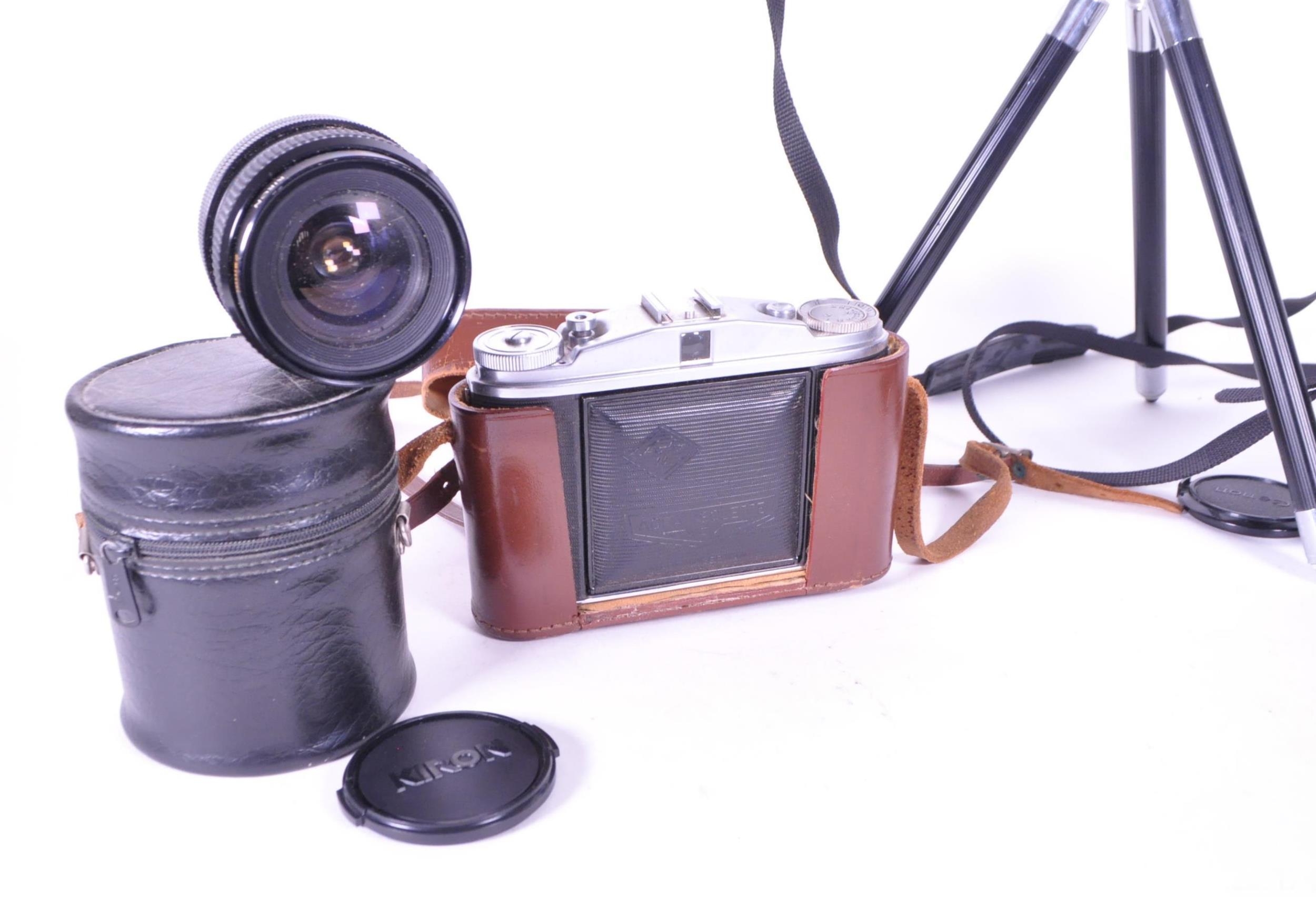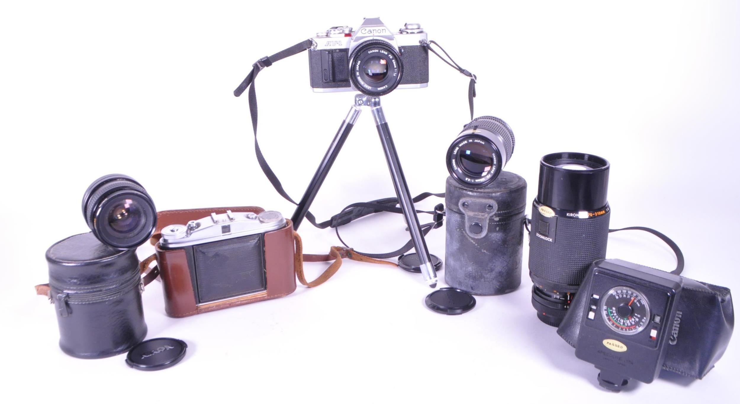 A collection of vintage 20th century cameras and lenses. To include, Canon AV-1, Agfa Isolette, made in Germany, Kiron zoomlock macro 1:4 made in Japan, Canon lens FD 135mm with light detector.
