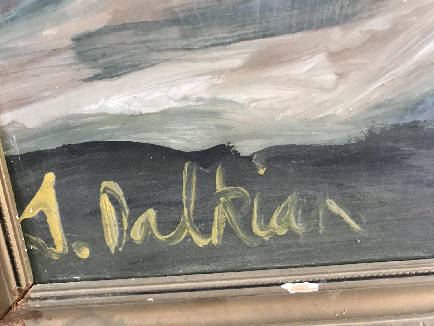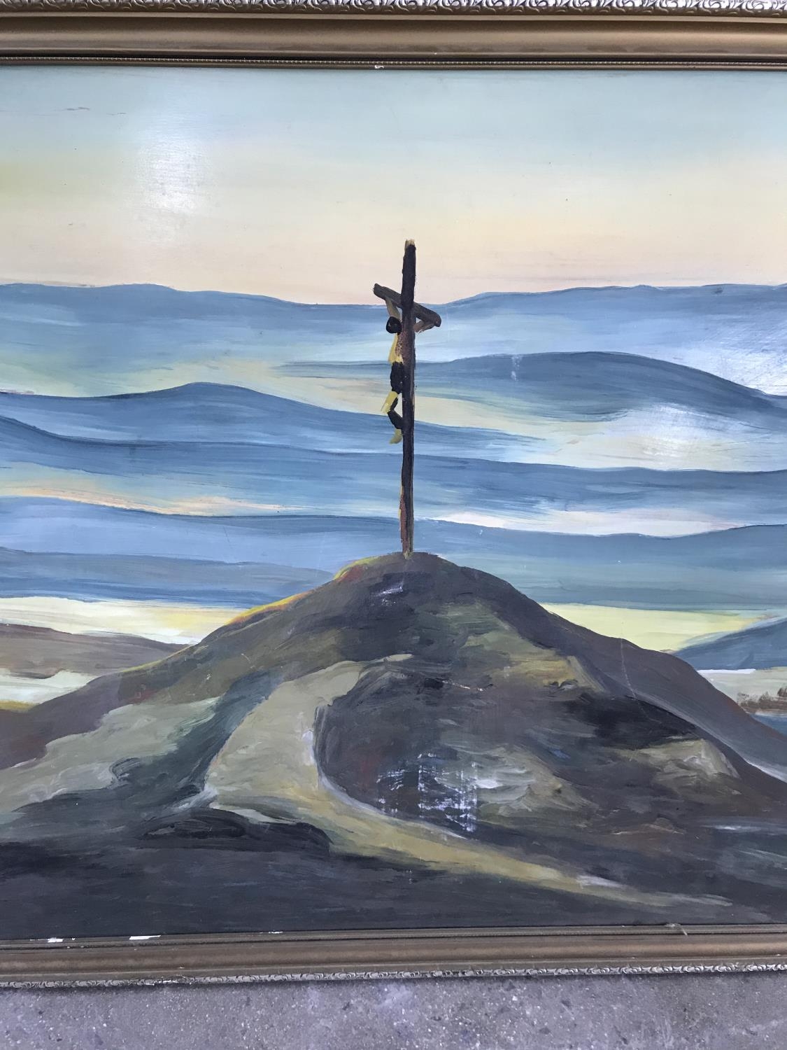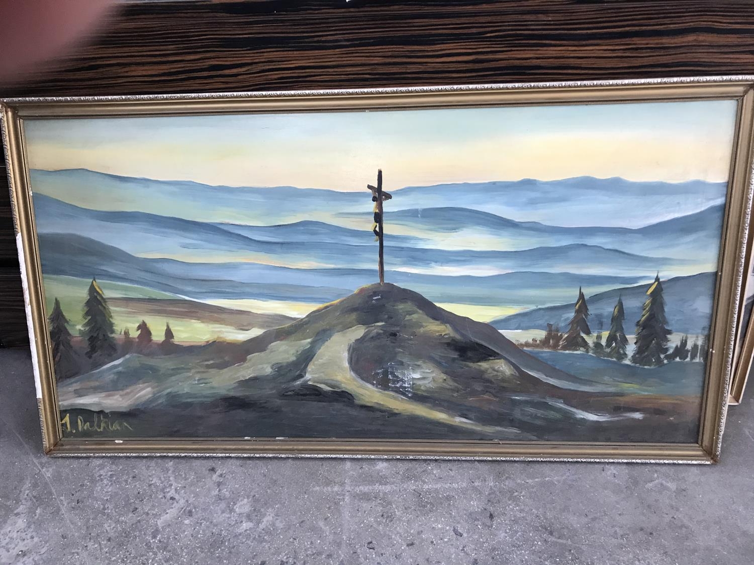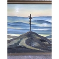 Oil on Hardboard Depicting Landscape with Jesus on Cross Signed 'J.Dalkian' (127 x 67cm)