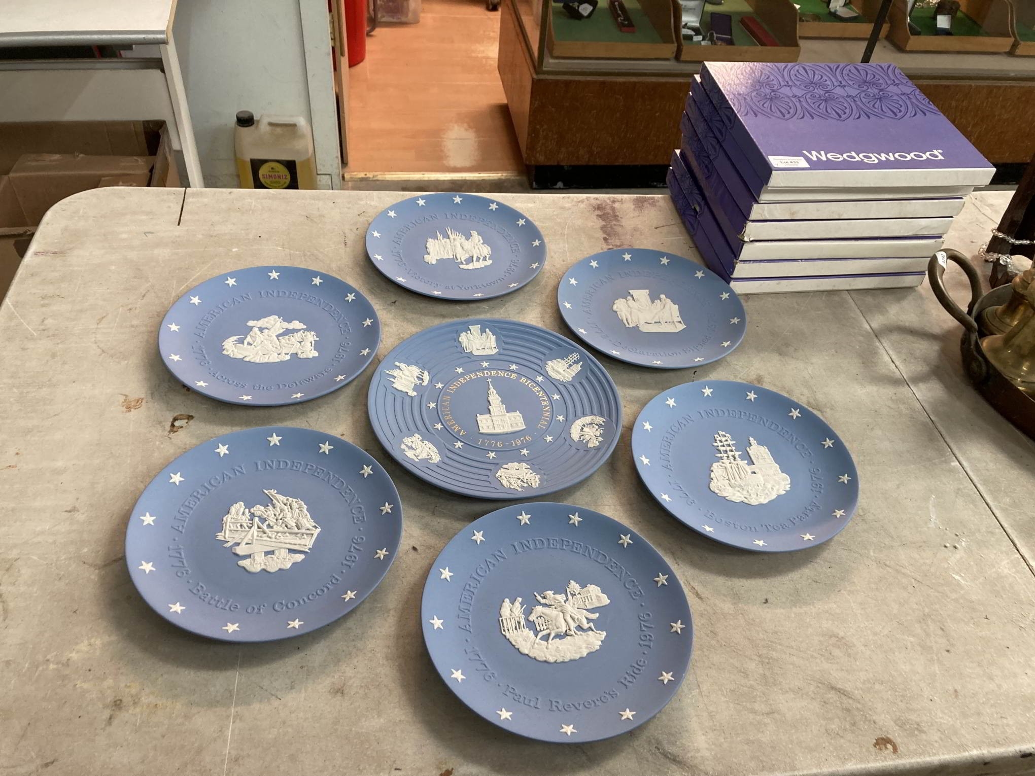 Wedgwood blue Jasper ware complete set of 7 'American Independence Bi-Centennial' plates with boxes & certificates