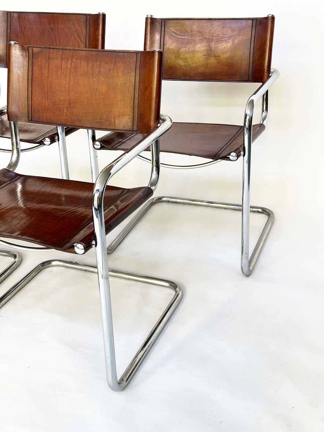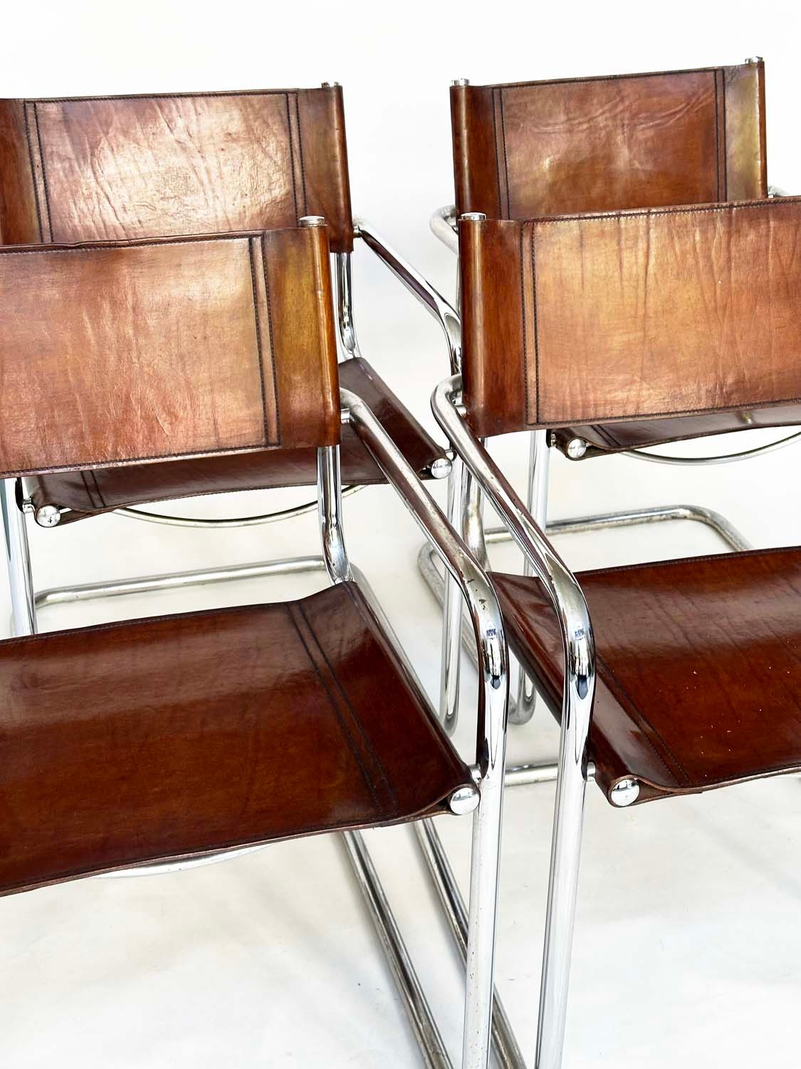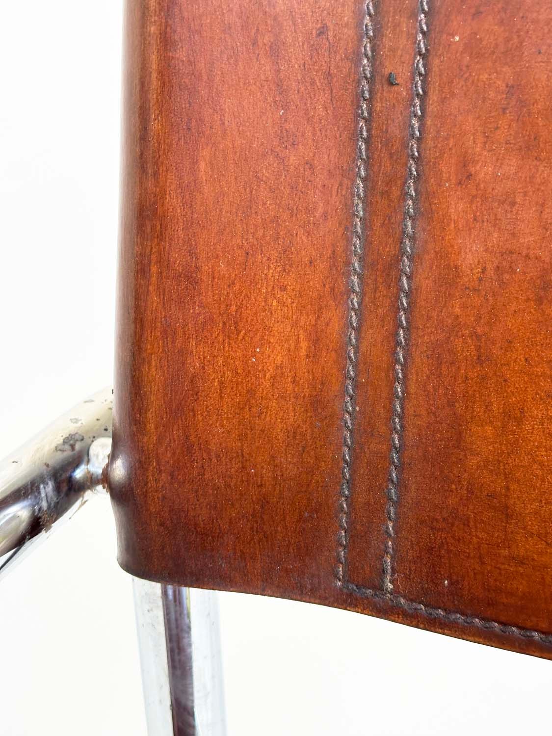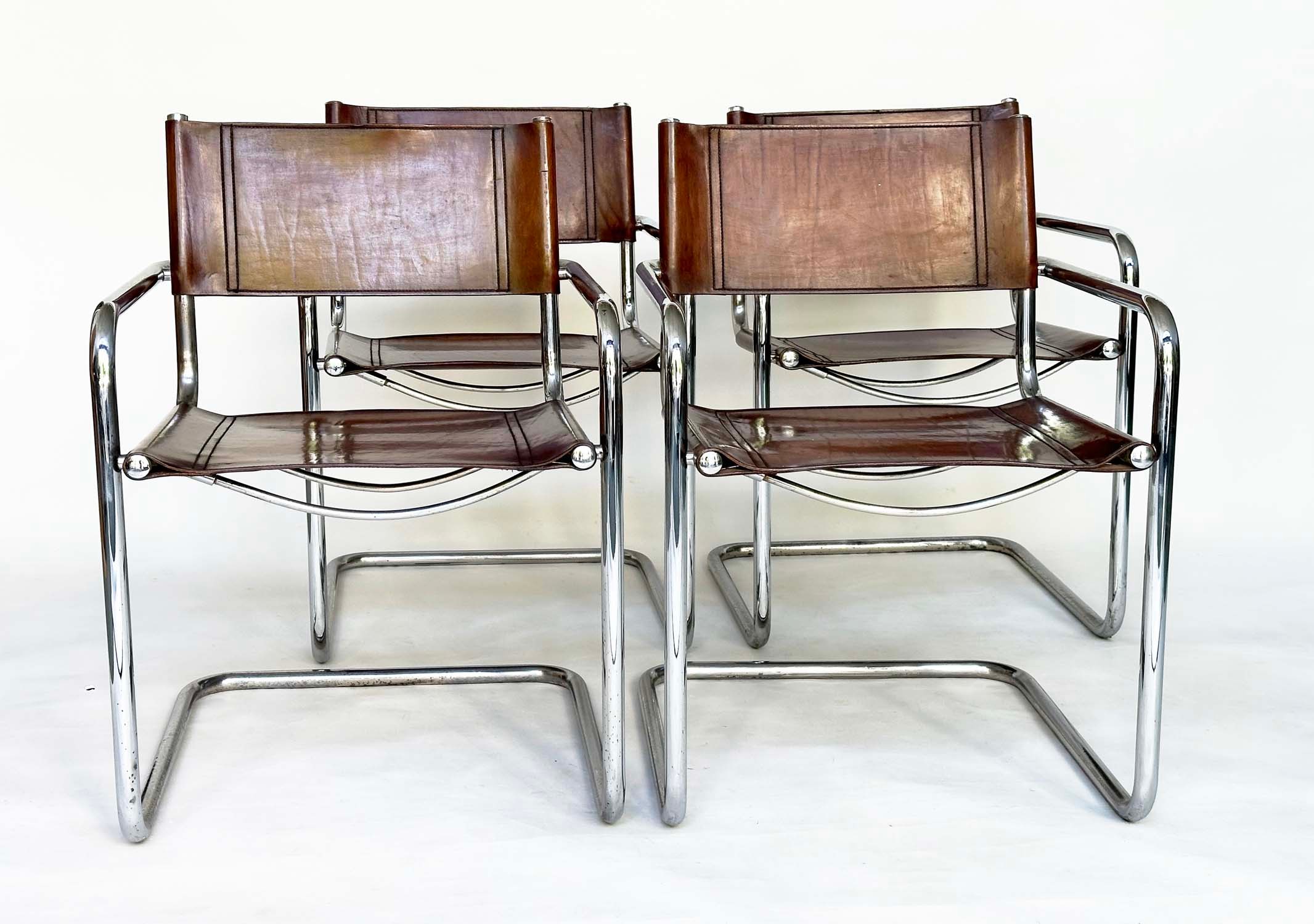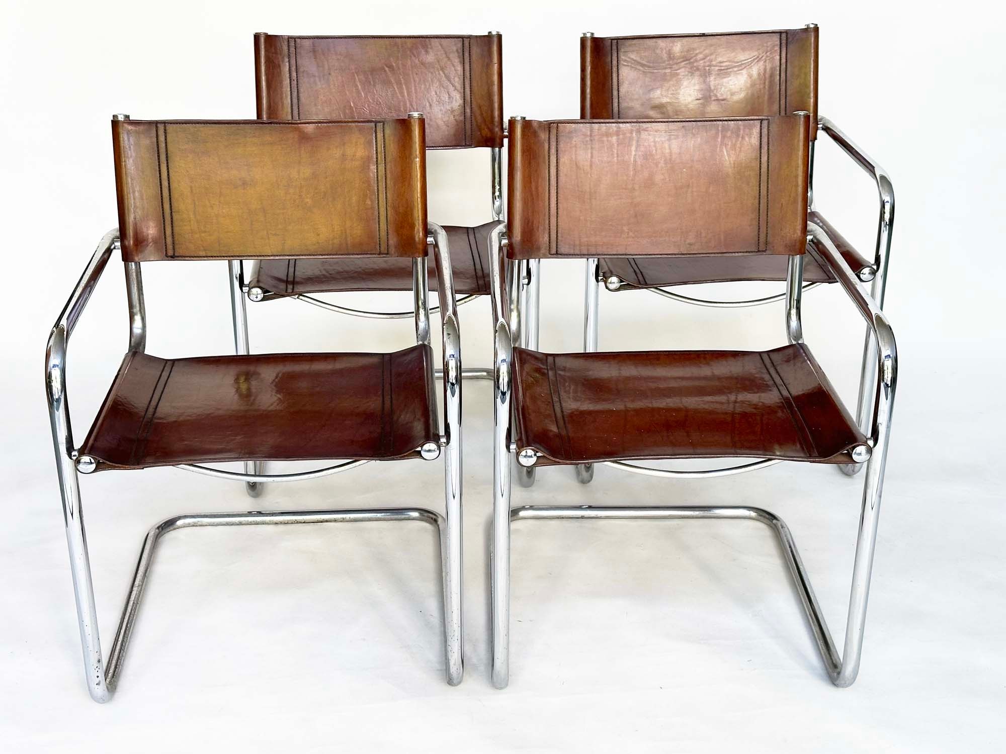 DINING ARMCHAIRS, a set of four, Bauhaus style design, stitched hand finished tan brown leather and cantilever metal supports after a design by Mart Stamm, 55cm W. (4)