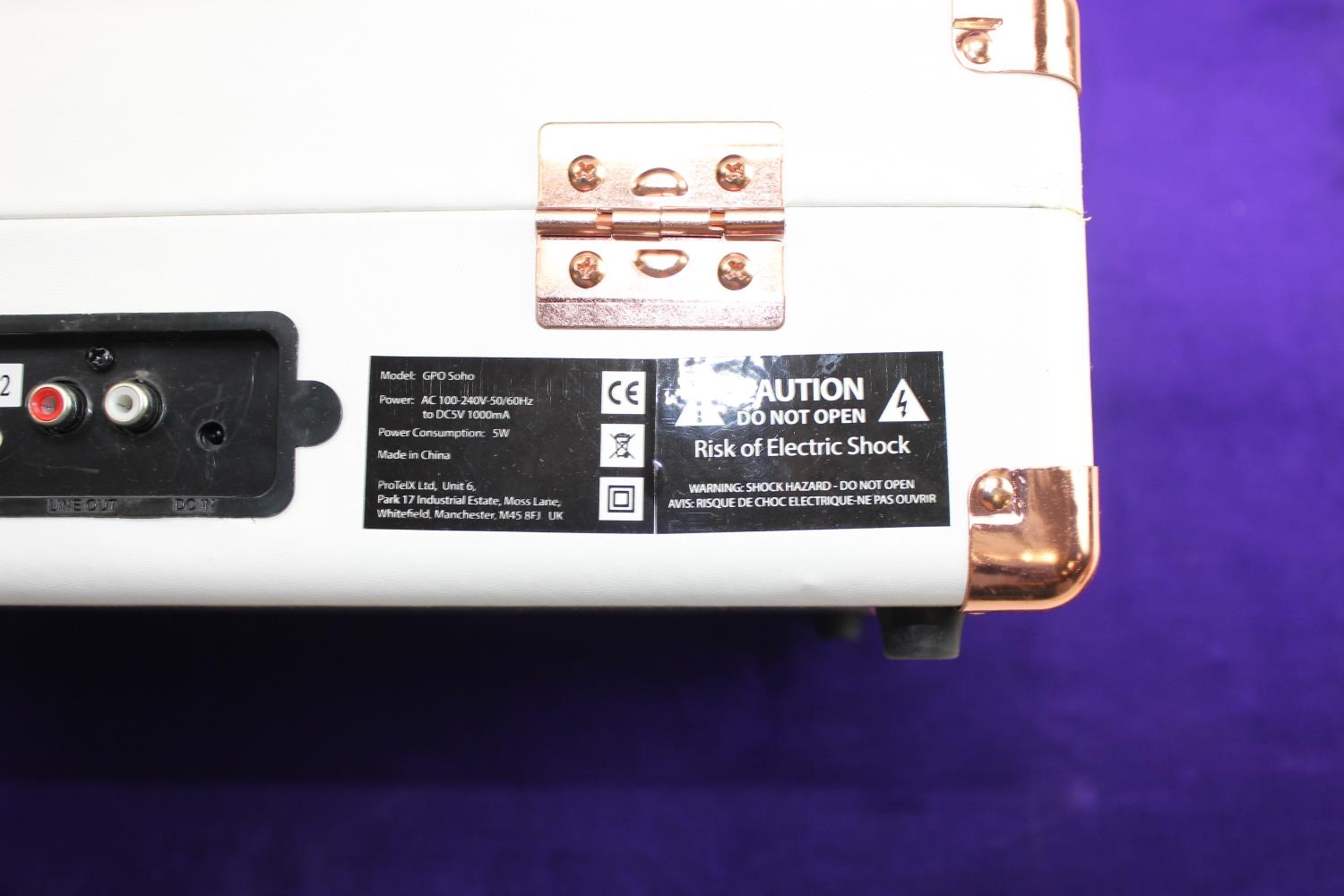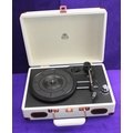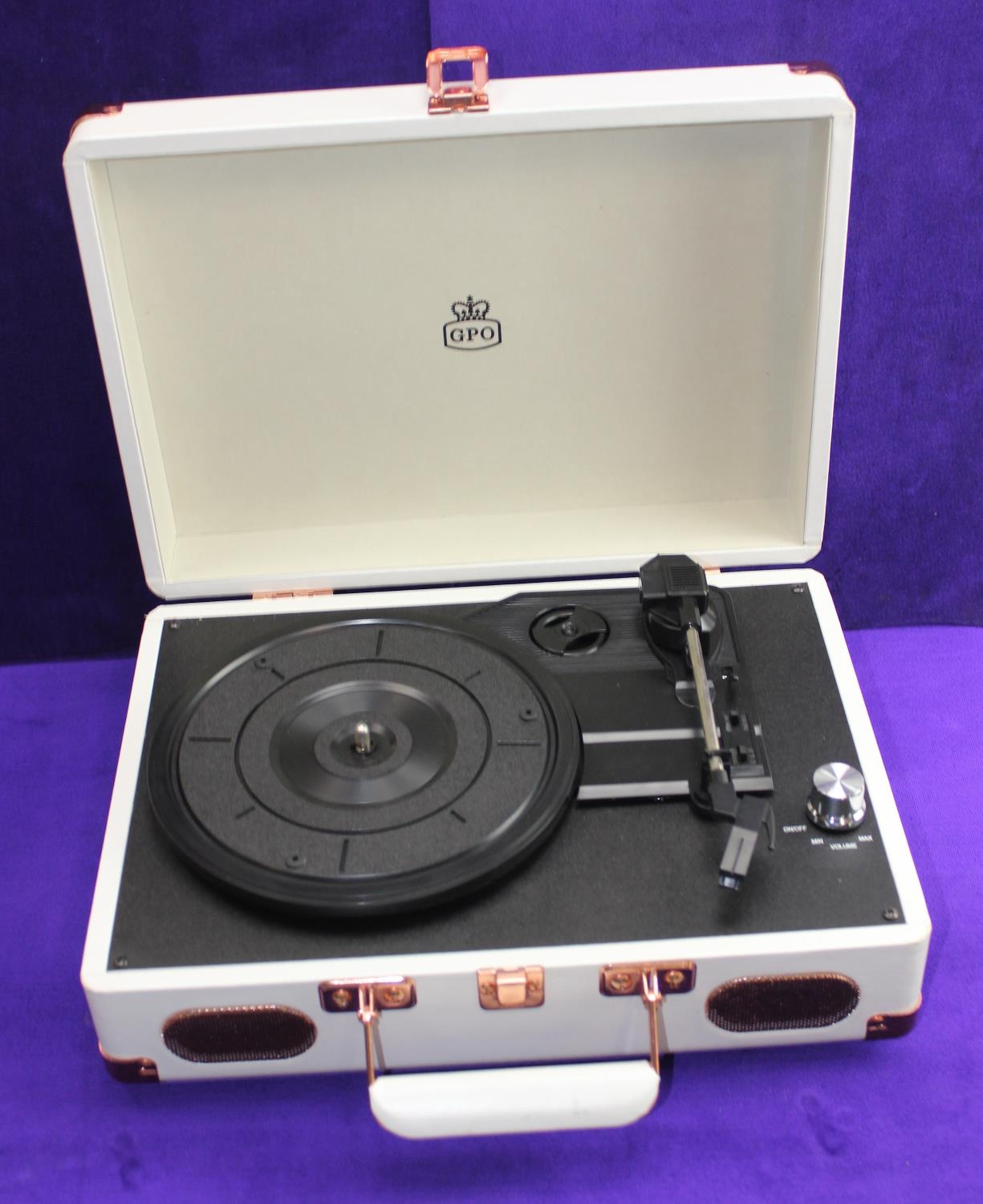 GPO portable record player in white and rose gold finish