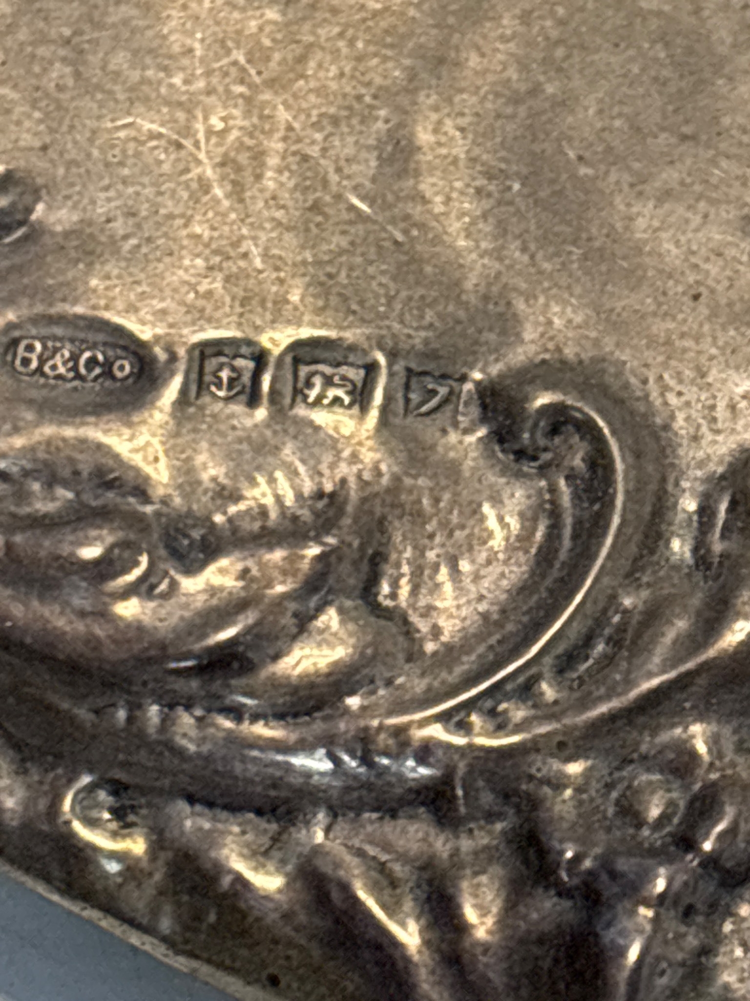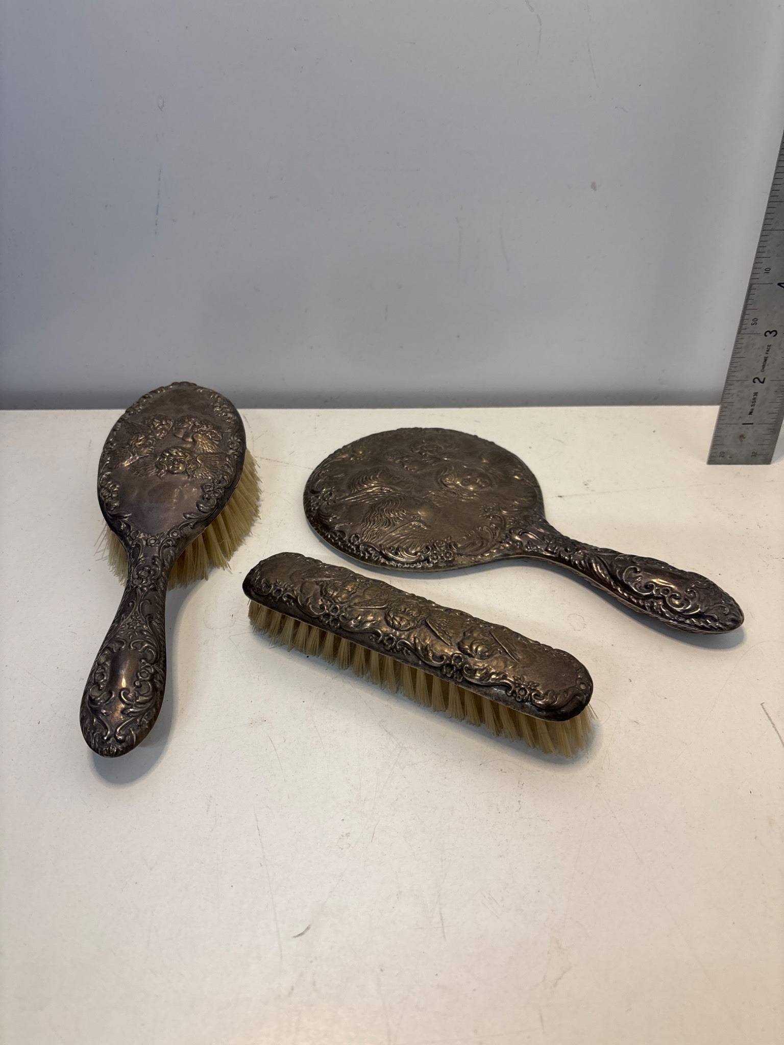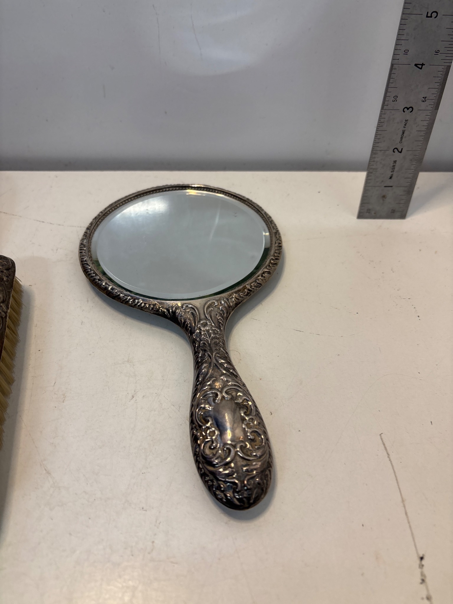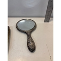 Sterling silver vanity set with mirror and brushes.