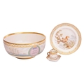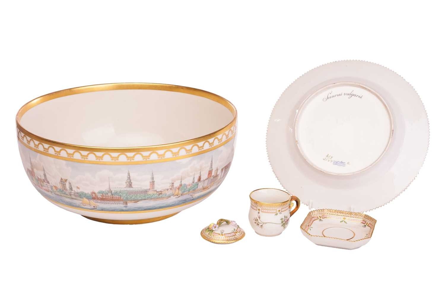 A Royal Copenhagen Fauna Danica porcelain plate, 1960s, painted with a red squirrel resting on a branch, black painted title to reverse 'Sciurus vulgaris', with underglaze blue wave, impressed and painted marks, numbered 239 / 3549, diameter 25.5 cm, together with a Royal Copenhagen Flora Danica Custard Cup and Saucer, with encrusted flower decoration to the handles, painted decoration with gilt highlights, on a square saucer, similarly decorated, 8.5cm overall height, and a Royal Copenhagen large limited edition Punch Bowl, commemorating their bi-centennary (1775-1975), decorated with a continuous coastal landscape incorporating sailing vessels, aircraft and city views, numbered 1772/2500, 15 cm high x 33 cm diameter. Qty: (3) Hairline crack to one side of the Fauna Danica plate and a small chip to the gilt edge. No further apparent issues.