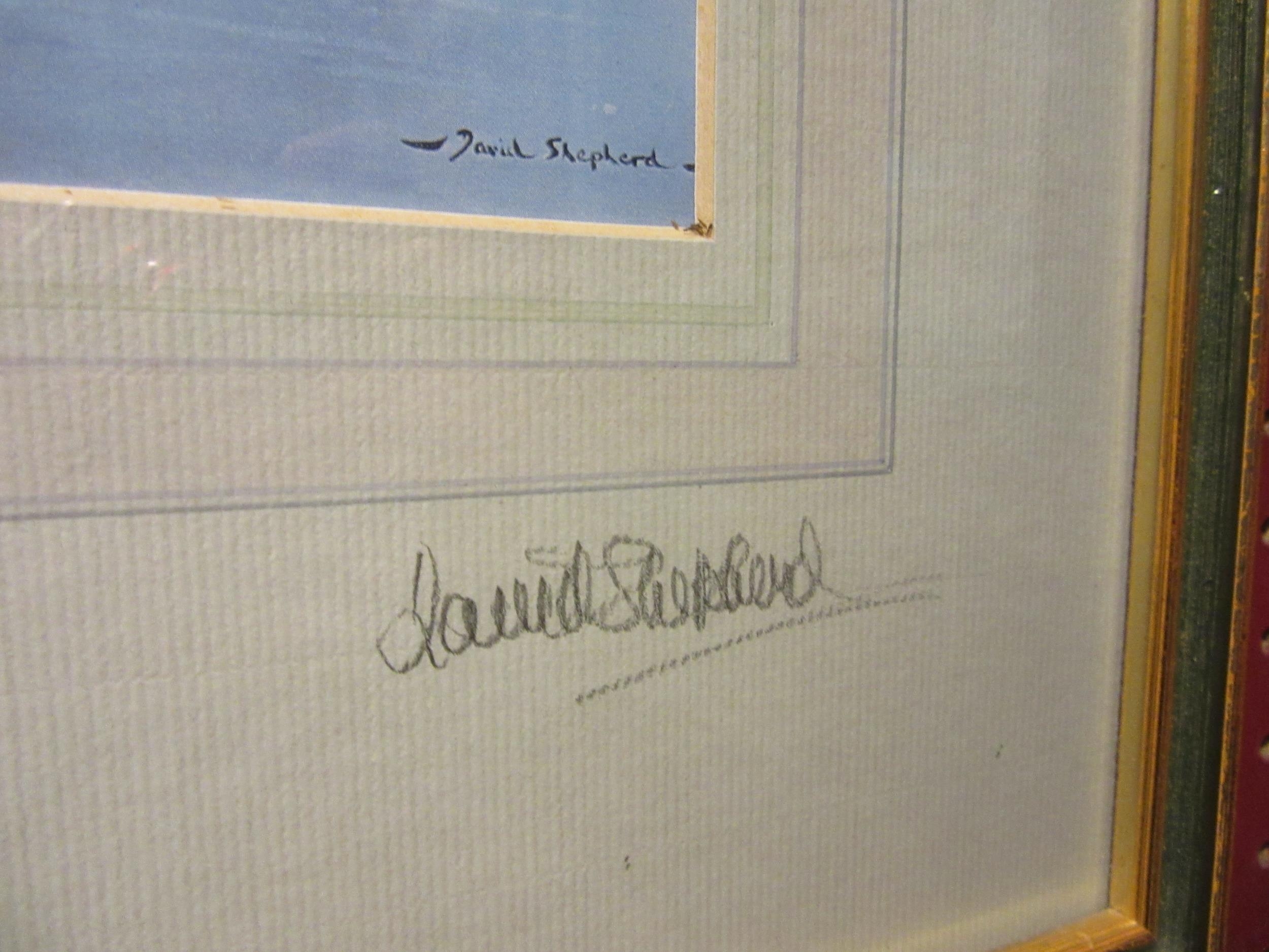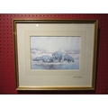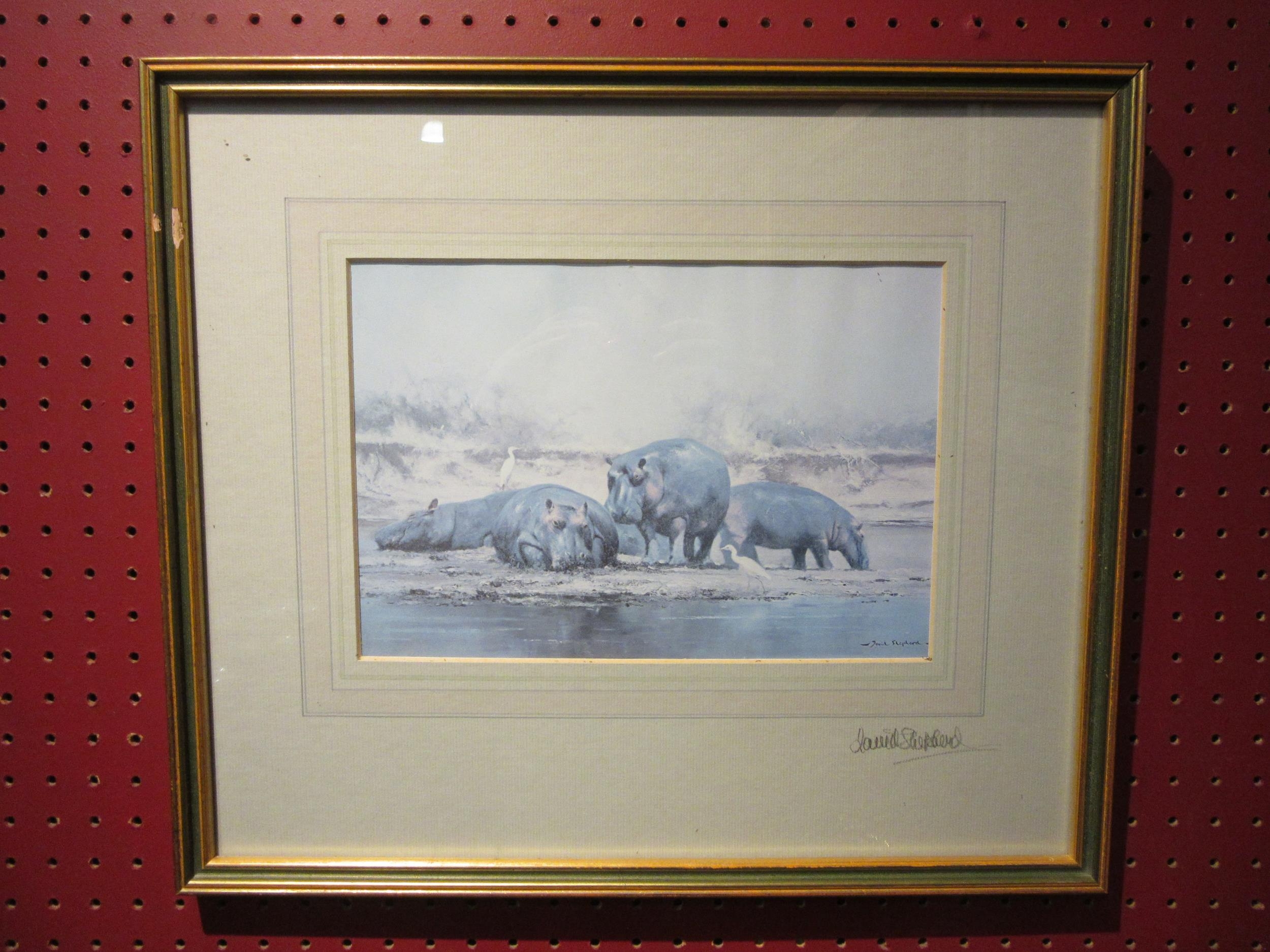 A signed David Shepherd print "Hippo's" with dedication to reverse also signed, framed and glazed, 17cm x 25cm image size