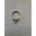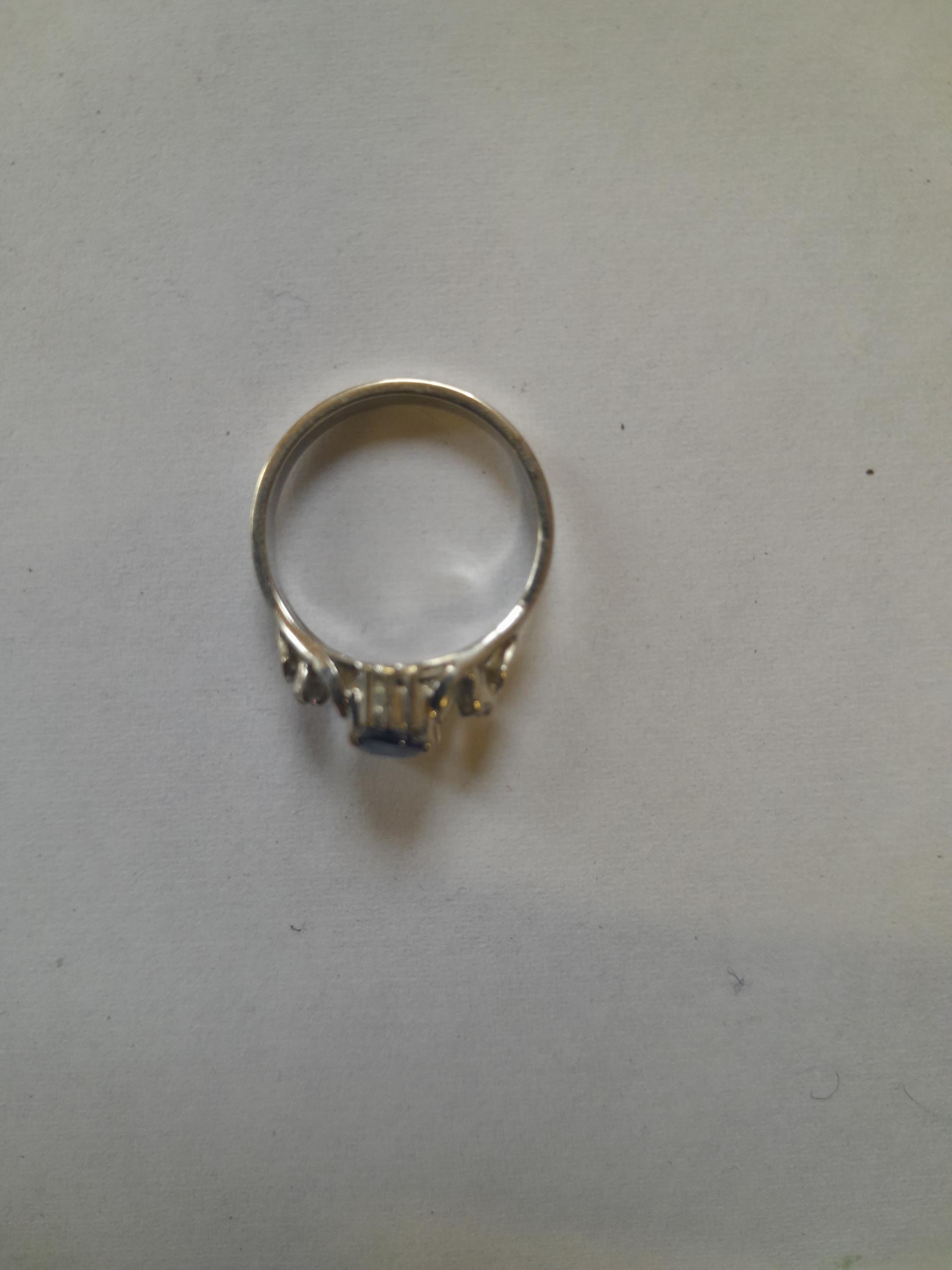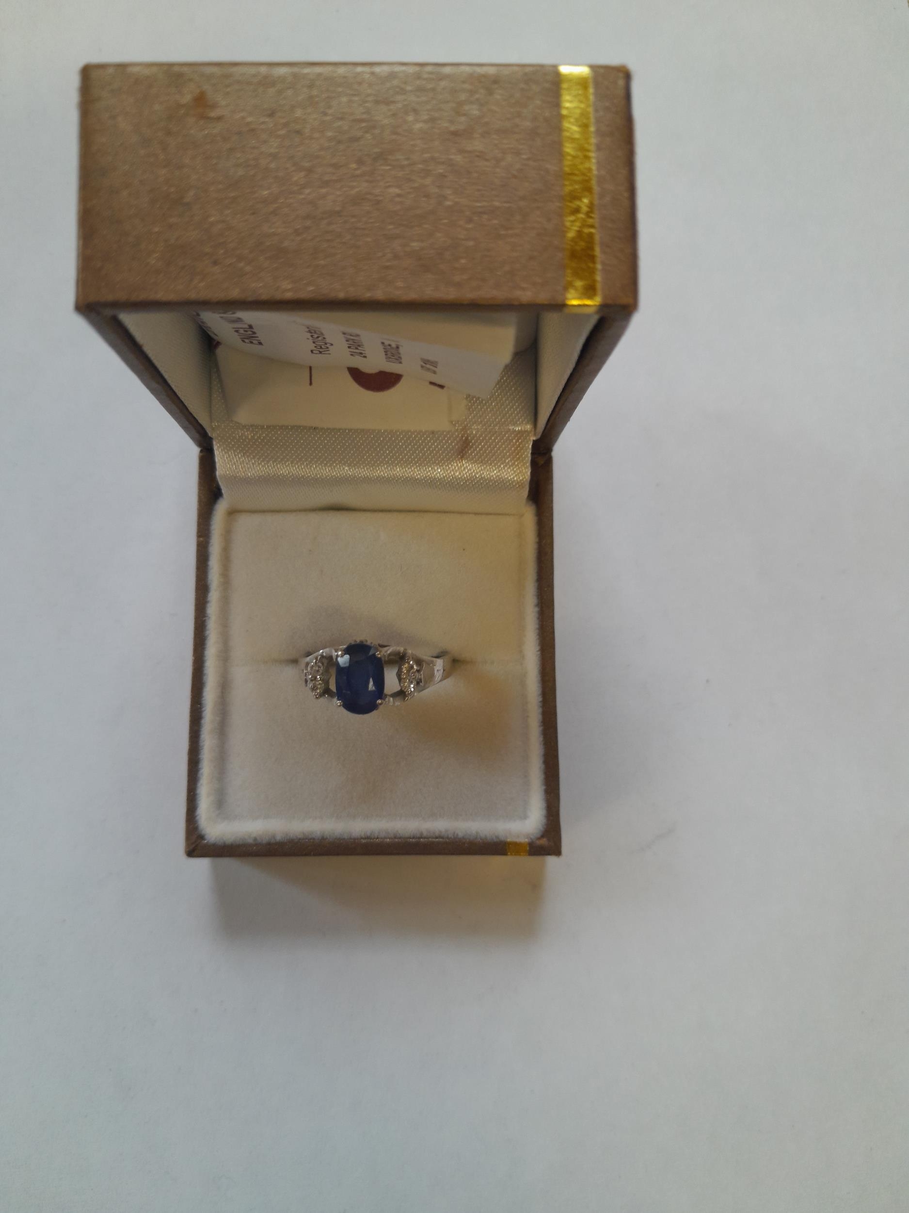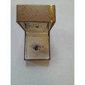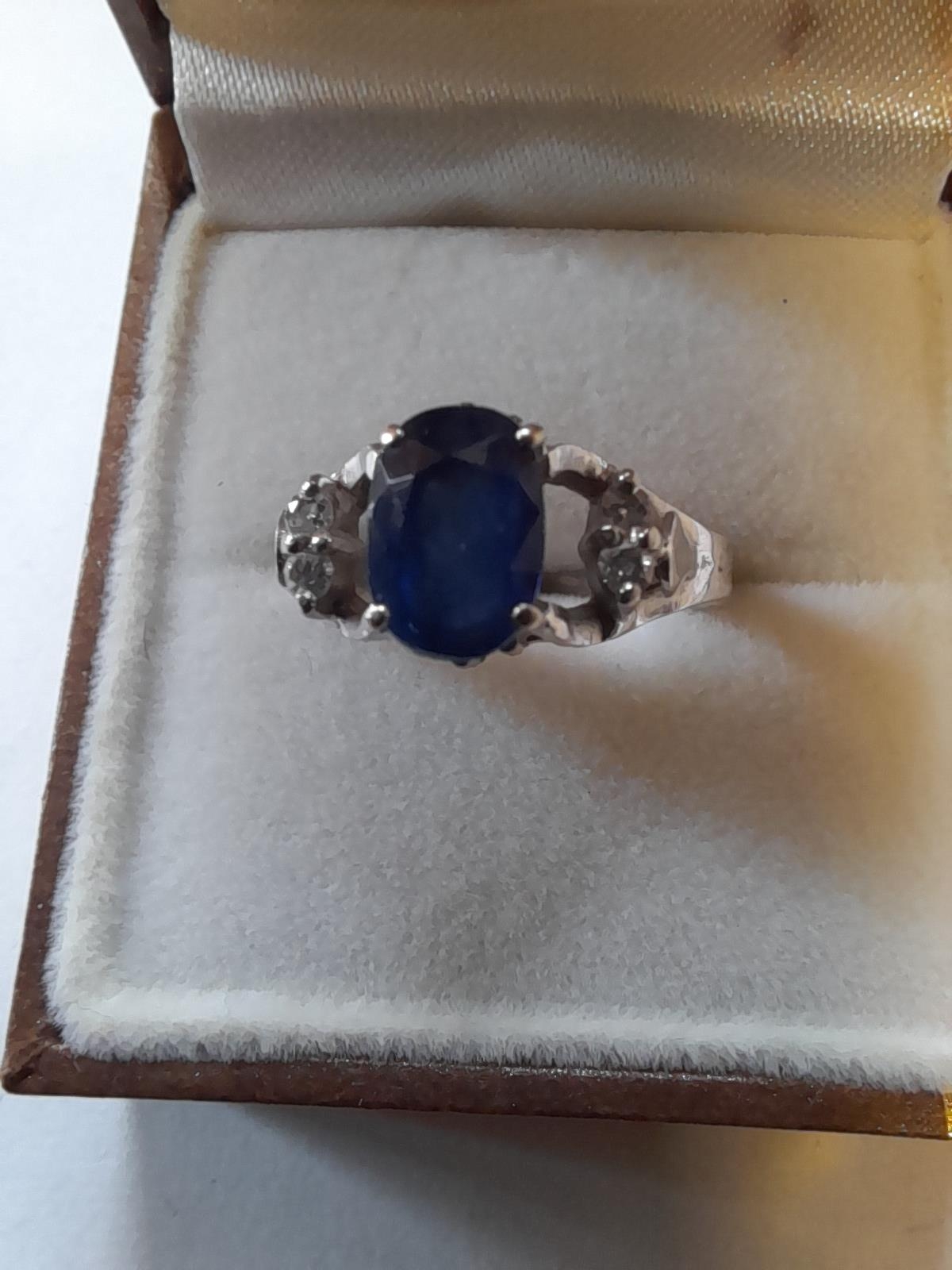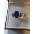 Unmarked but test 18 ct white gold ring set with sapphire and surrounded with diamonds size M gross weight 4 g