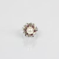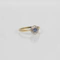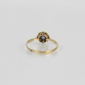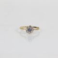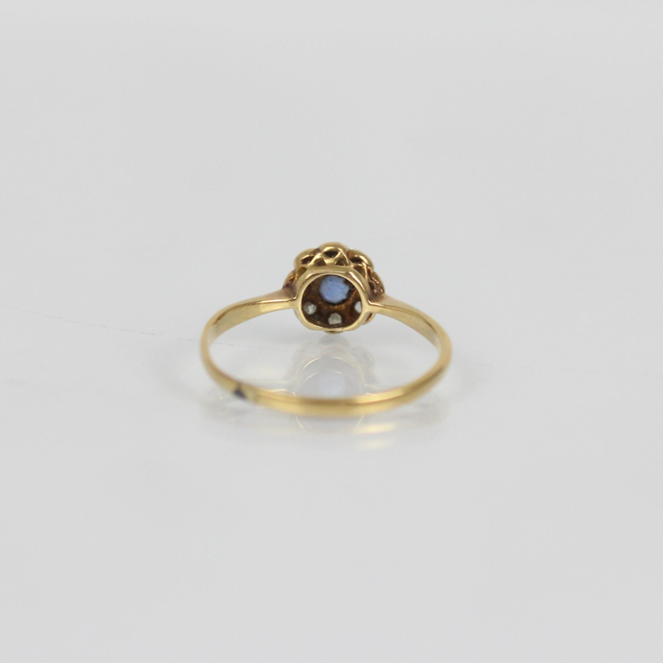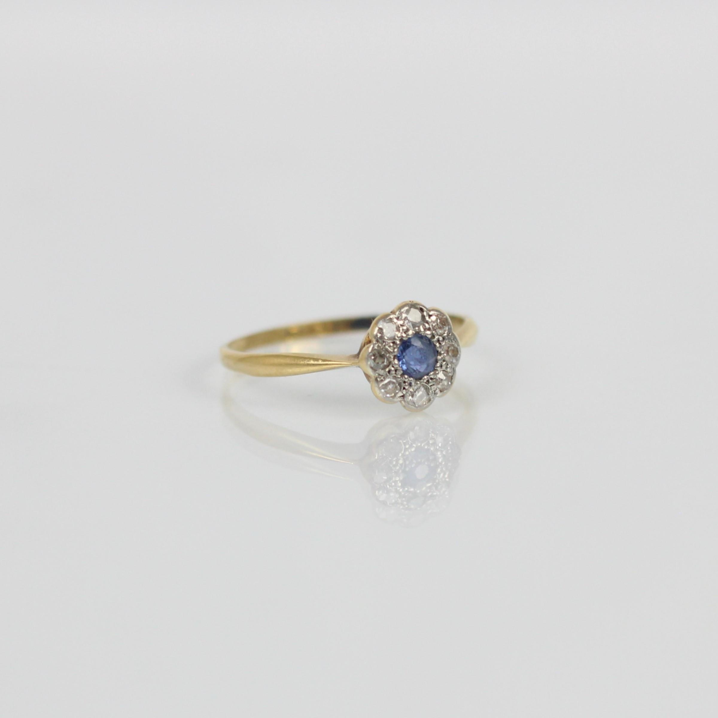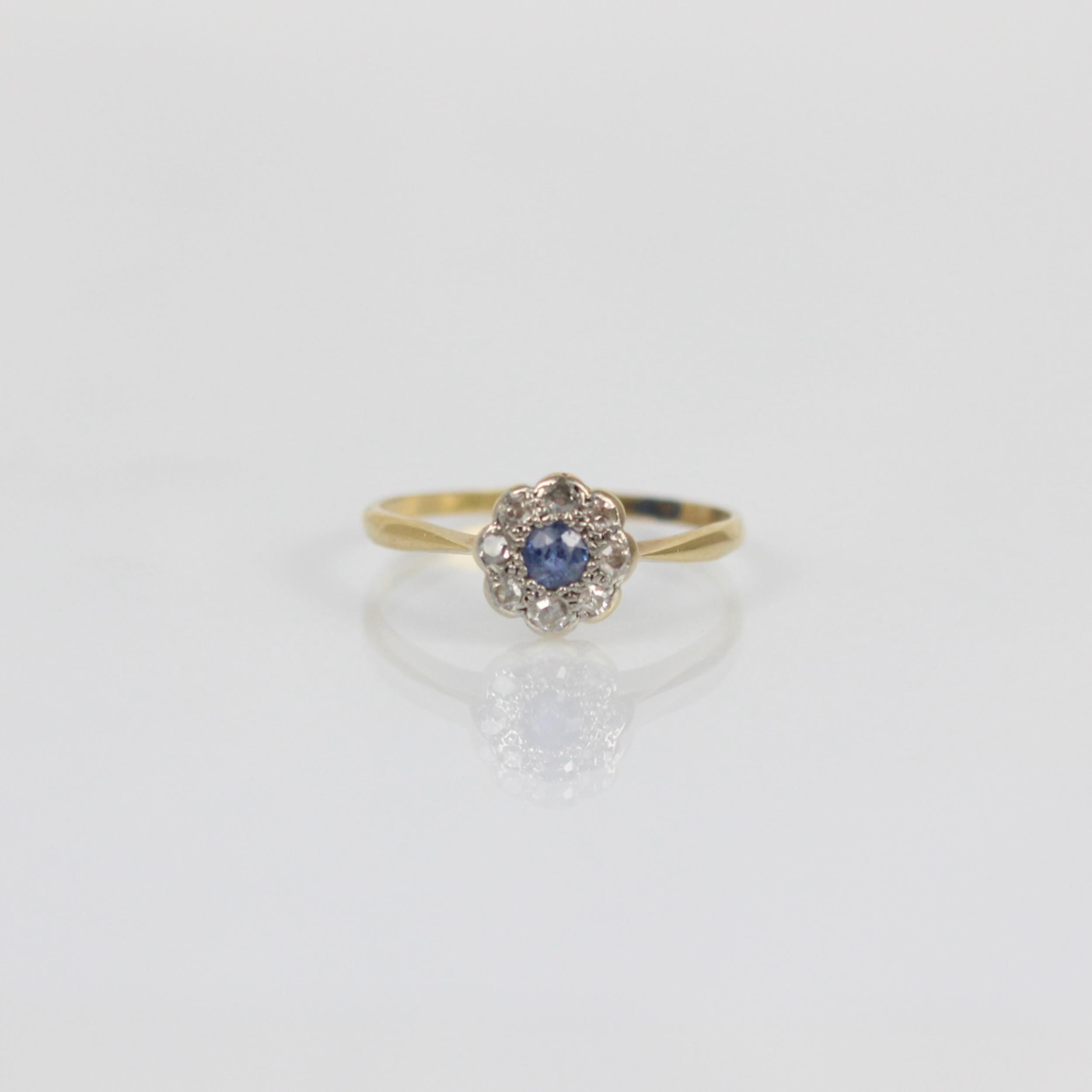 An early 20th century sapphire and diamond cluster ring, the central round cut sapphire within a surround of eight mixed cut diamonds, set in white metal leading to yellow metal shank, indistinctly stamped, ring size M 1/2, 1.5gms, total sapphire weight 0.15ct