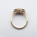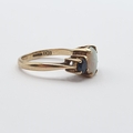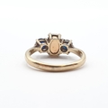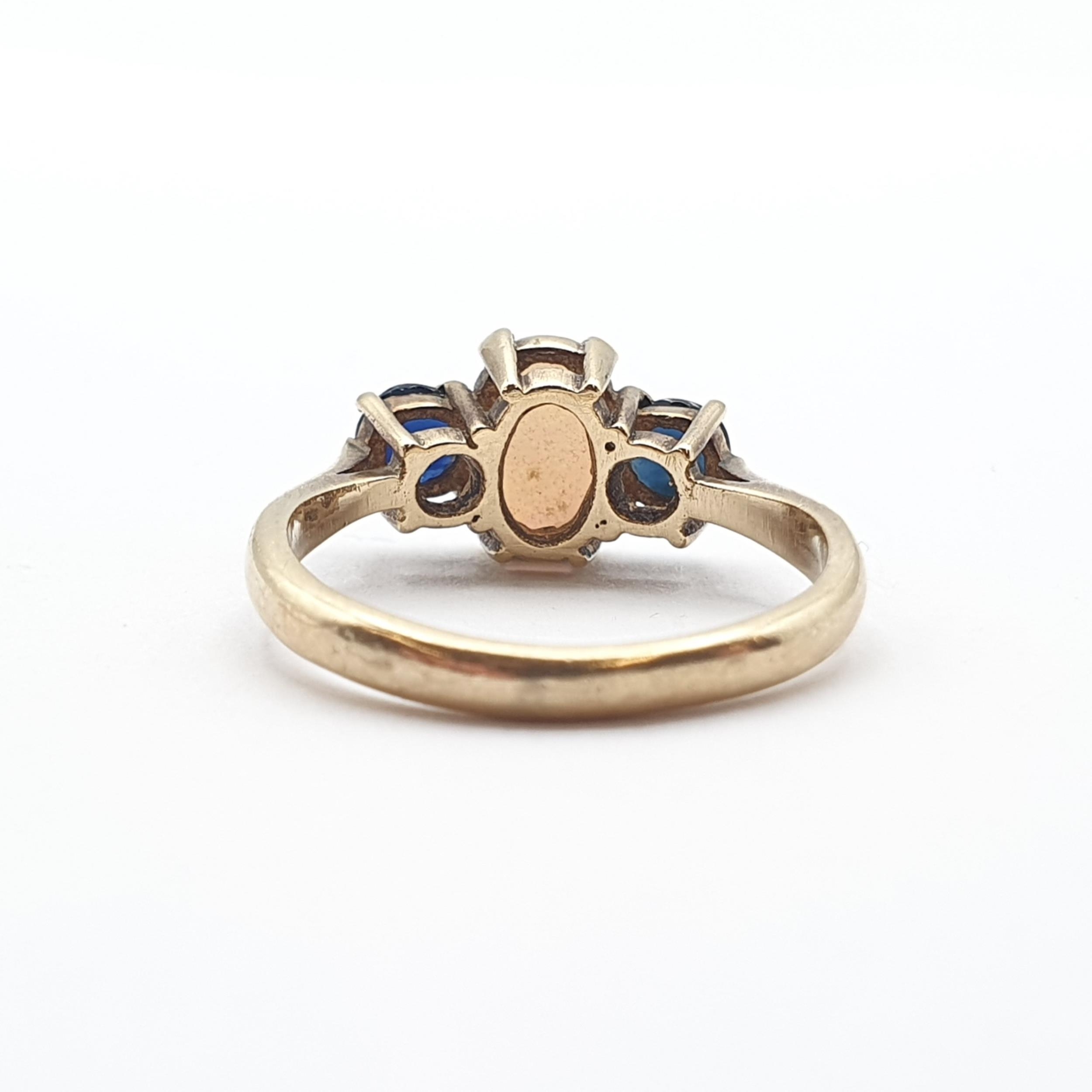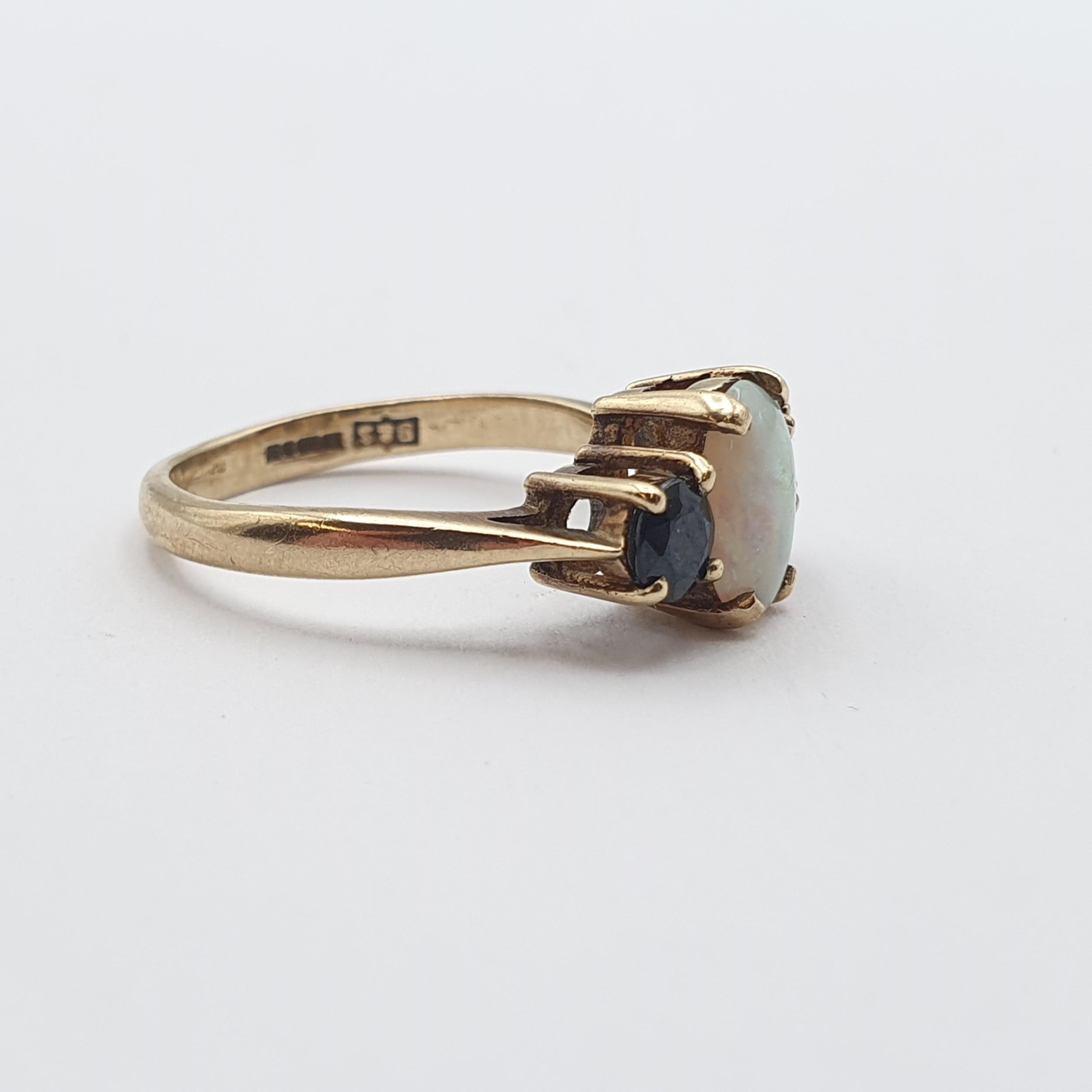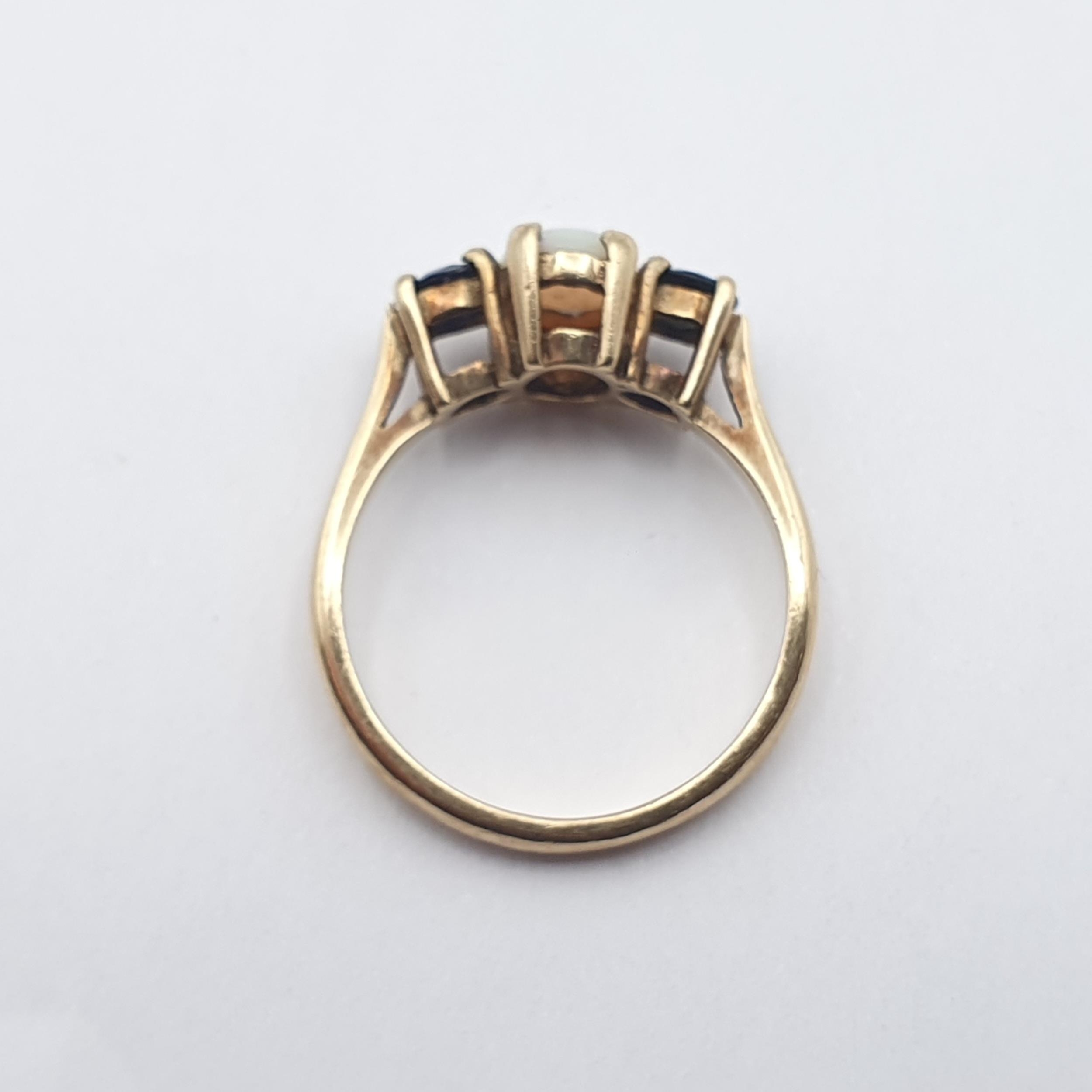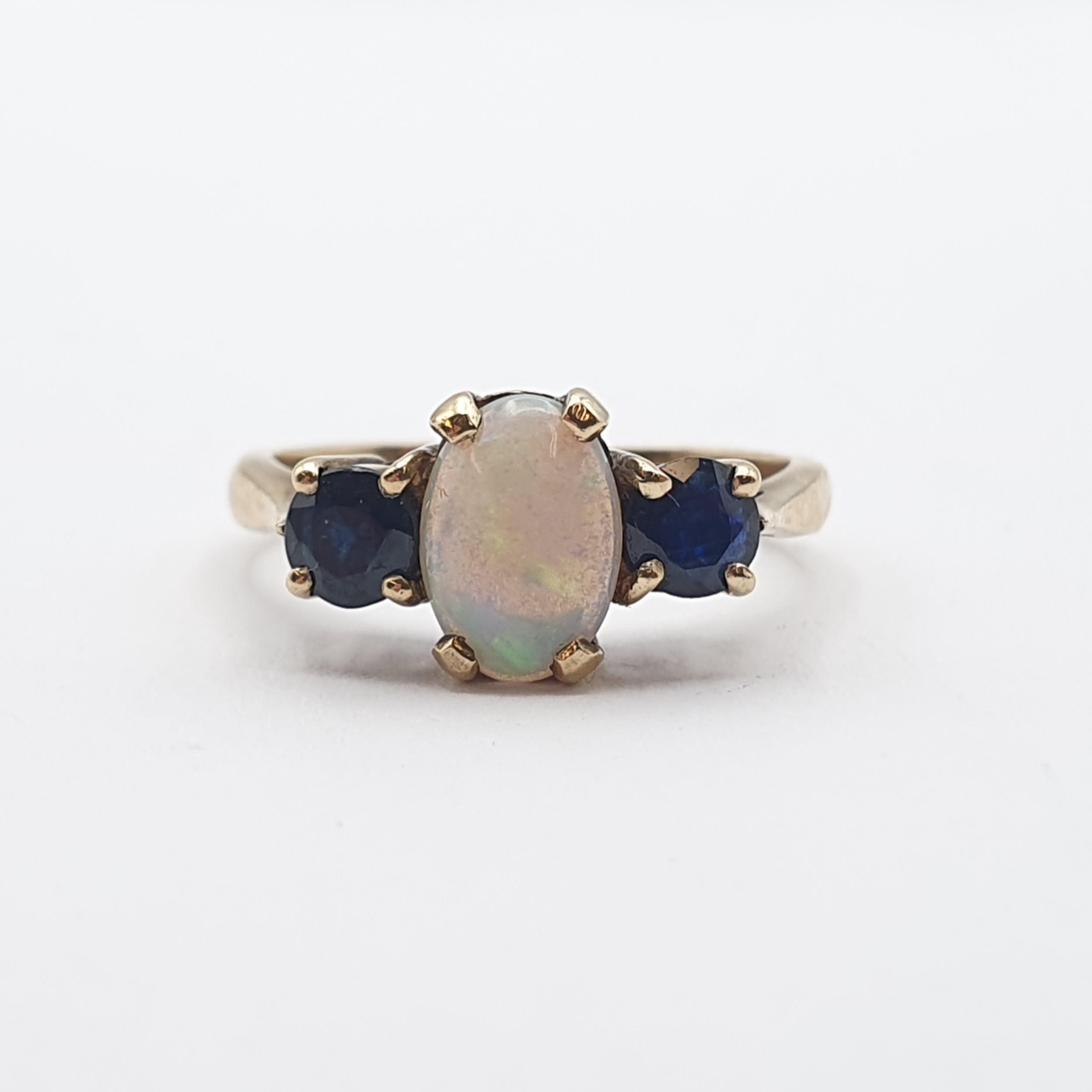 An Opal and Sapphire Ring, claw-set oval cabochon opal between two round mixed-cut sapphires in 9ct gold, ring size N 1/2, approx. 3gms