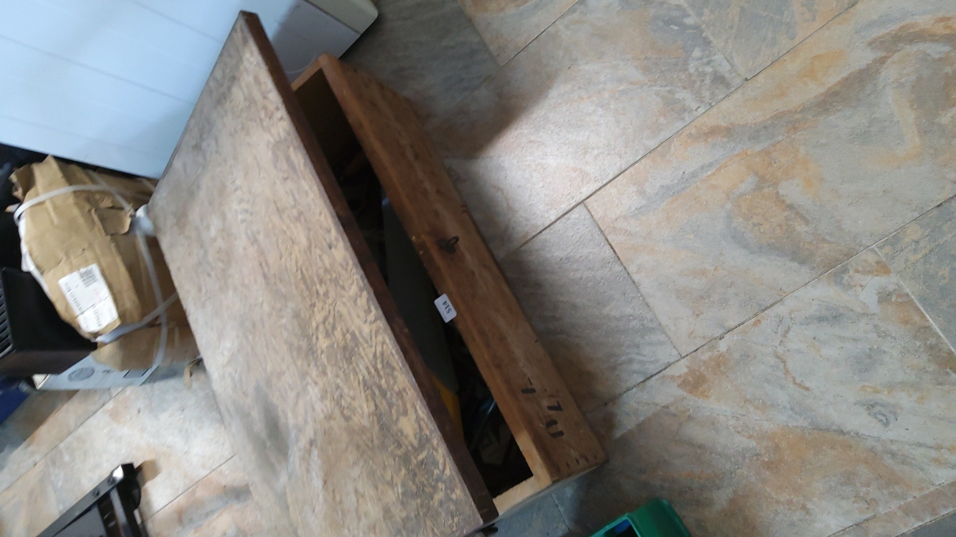 A quantity of workshop tools and hardware in a pine tool chest, including saws, files, clamps, chisels, and assorted fittings; the hinged lid with iron latch.