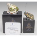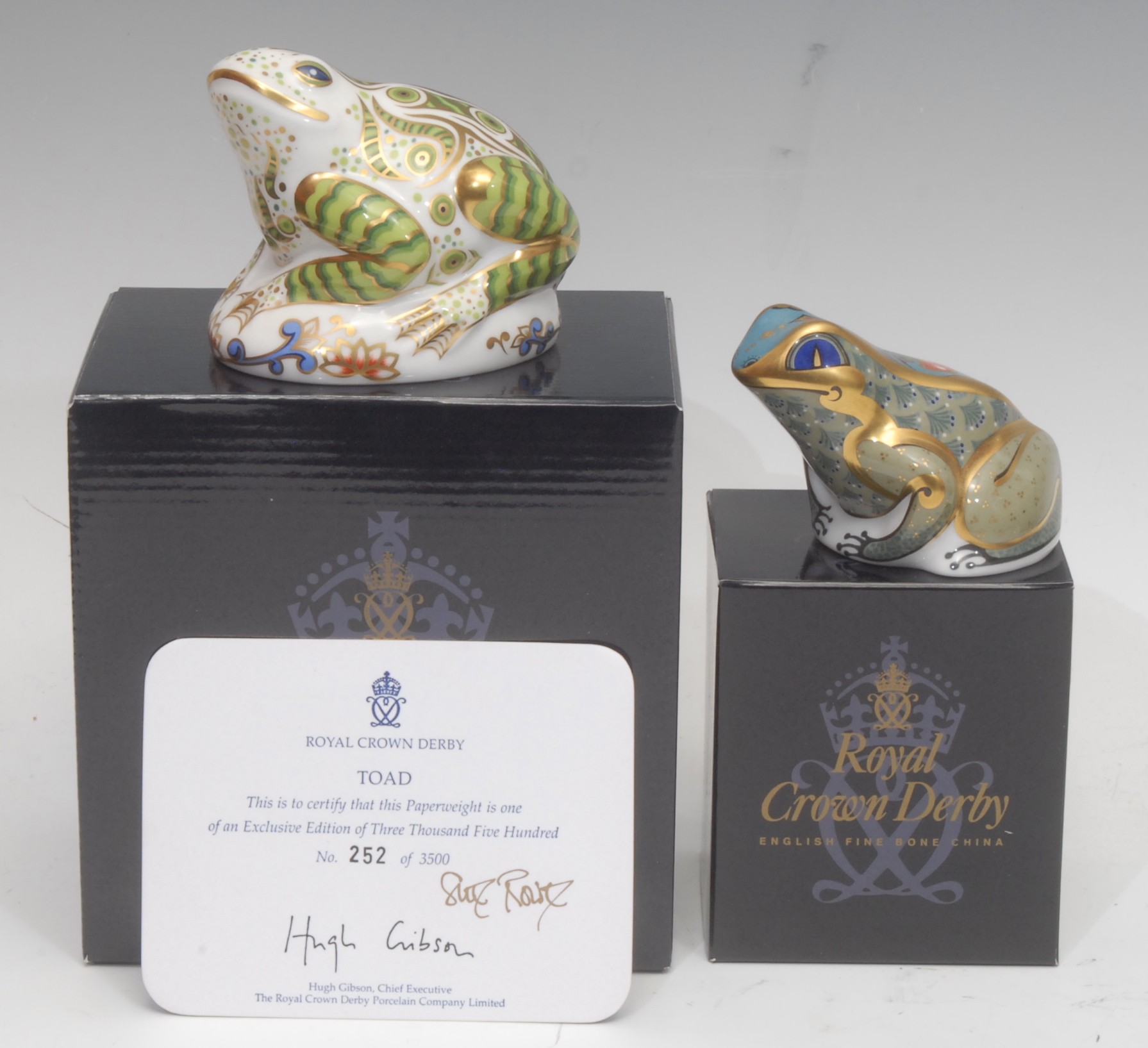 A Royal Crown Derby paperweight, Toad, designed by Sue Rowe, exclusive limited edition, 252/3,500, gold stopper, 7.5cm high, signed and dated in gold by Sue Rowe, printed mark in red, certificate, boxed; another, Fountain Frog, gold stopper, 6cm high, printed mark in red, boxed (2)