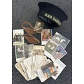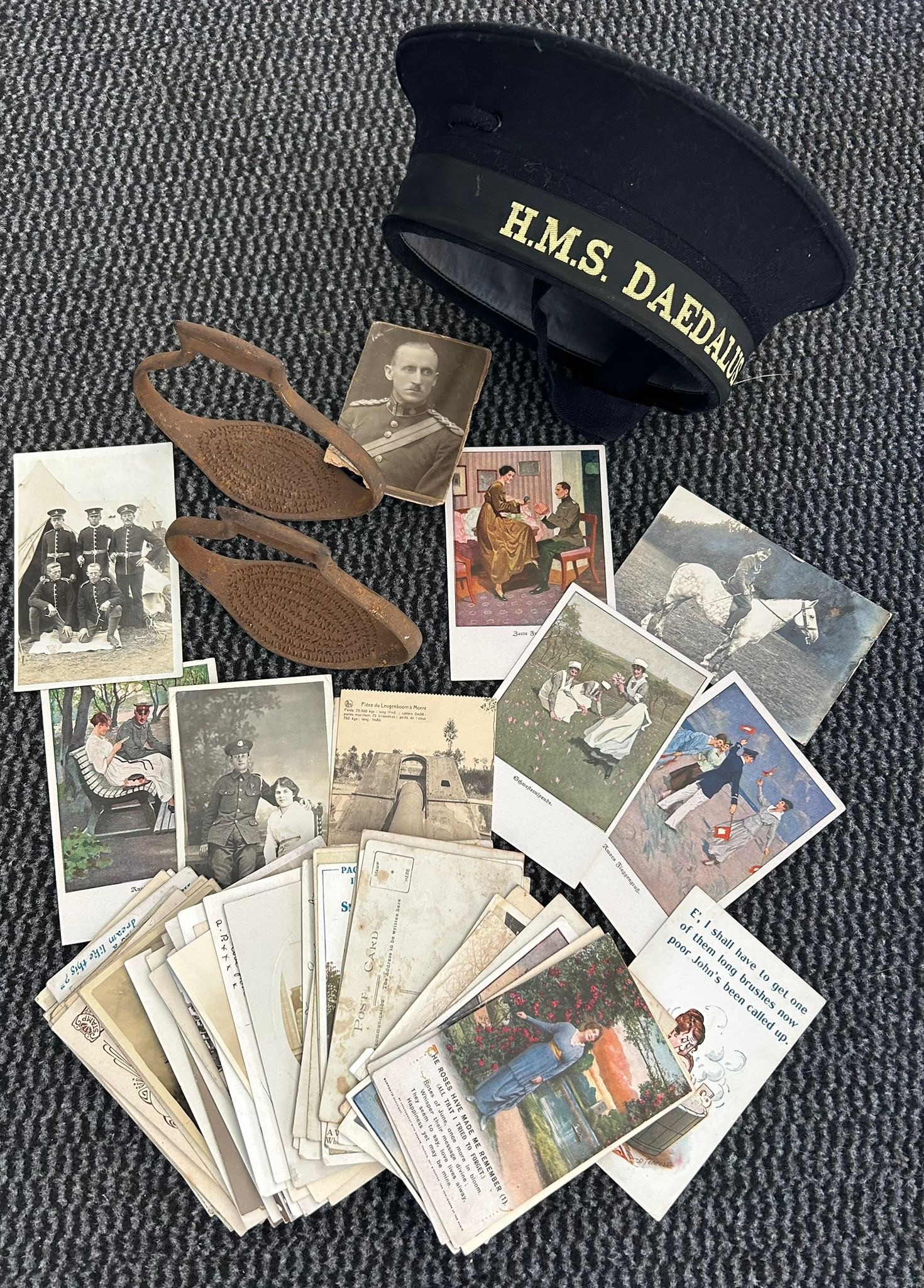 Approximately 90 WW1 period postcards, a mix of studio portrait photos and patriotic examples. British naval sailors pork pie hat cap band. HMS Daedalus and a set of vintage riding stirrups.