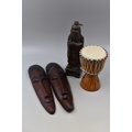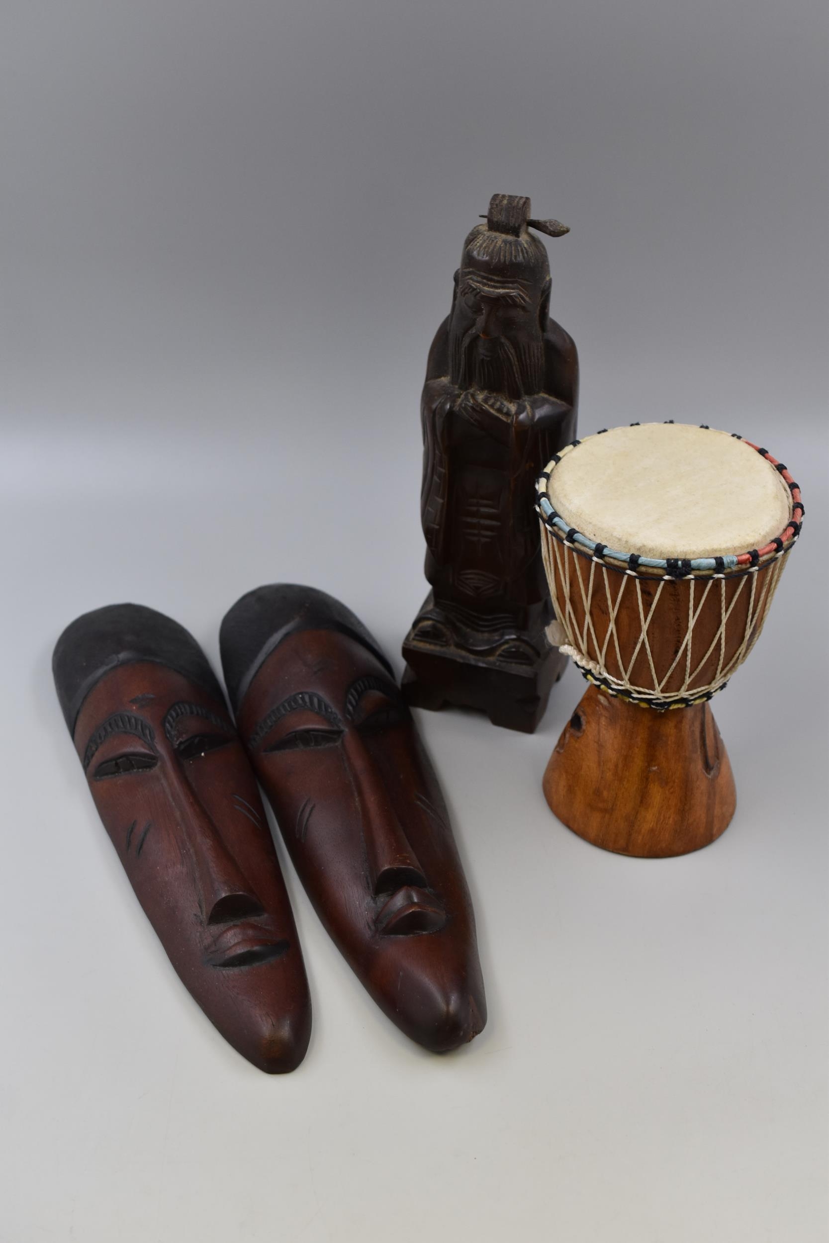 African inspired mask wall hangers (14" H x 3" W) & Djembe African drum (7" H x 5" W) plus an elder immortal figure (12" H)